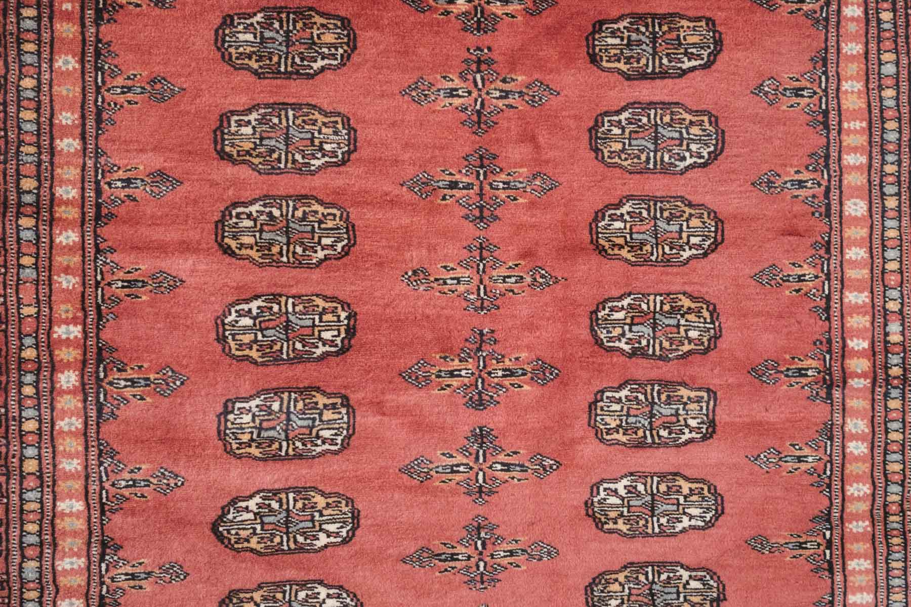 name: Dalan style: hand knotted, Pakistani, Peshawar, Bokhara, rug, carpet material: wool colors: coral, salmon, beige, tan, mint age: new condition: good, age related wear - see pictures