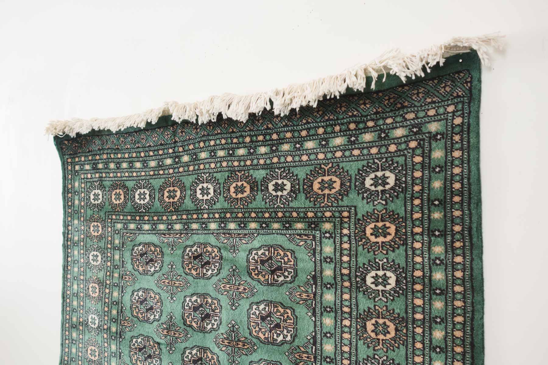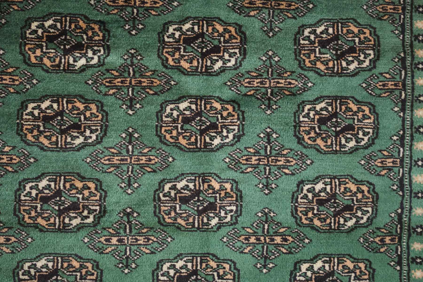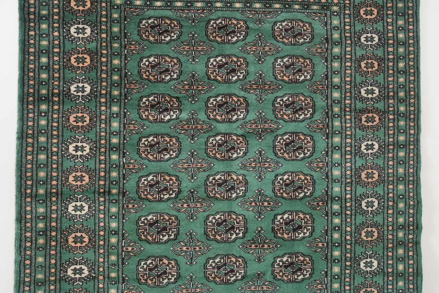 name: Dalenorigin: Pakistan, Peshawar Bokhara style: rug, carpetmaterial: hand knotted woolcolors: green, camel, black, cream age: newcondition: good, age related wear - see pictures