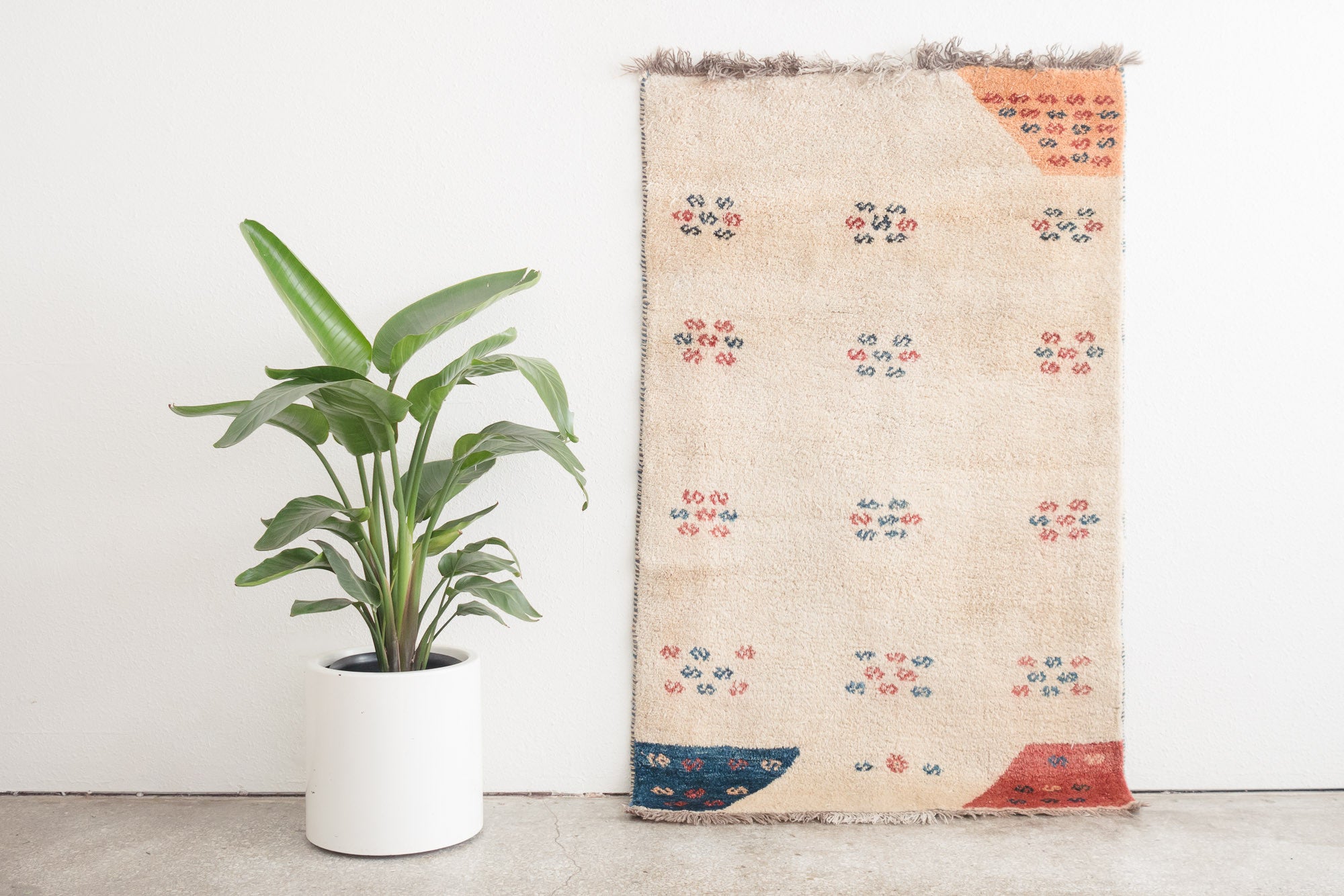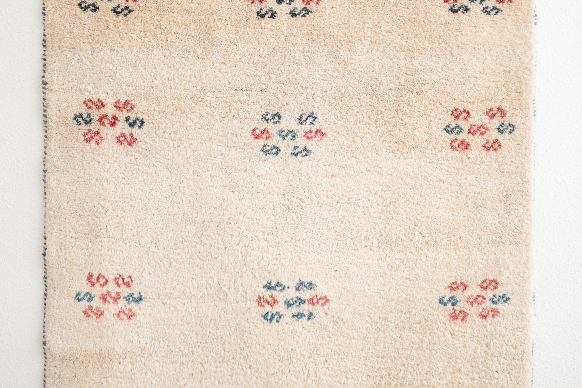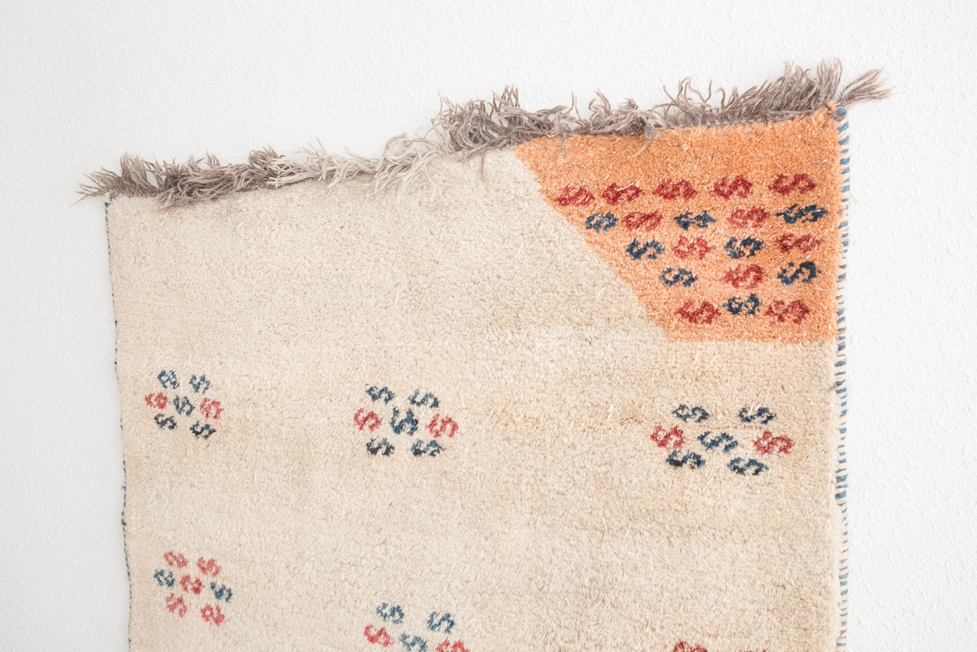 name: Faramin style: hand knotted, Persian, Gabbeh, rug, carpet material: wool colors: red, orange, cream, camel, blue age: vintage condition: good, age related wear, no holes - see pictures