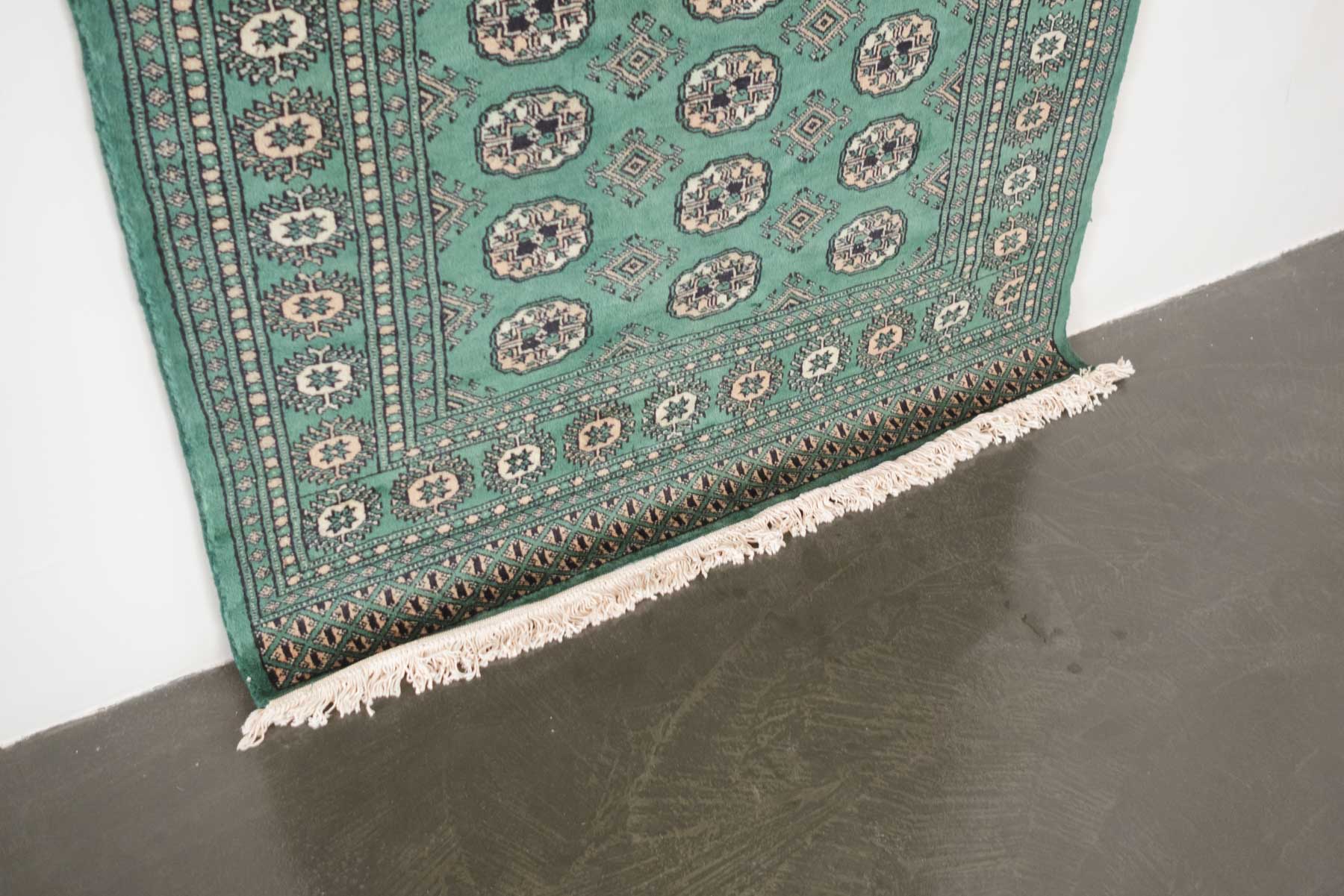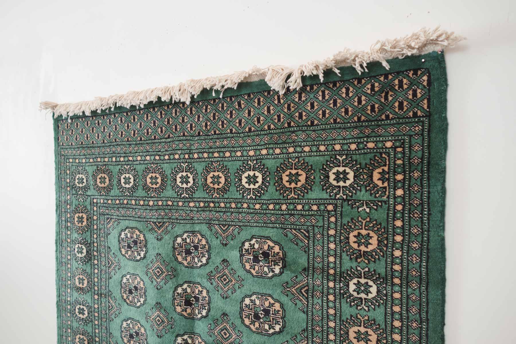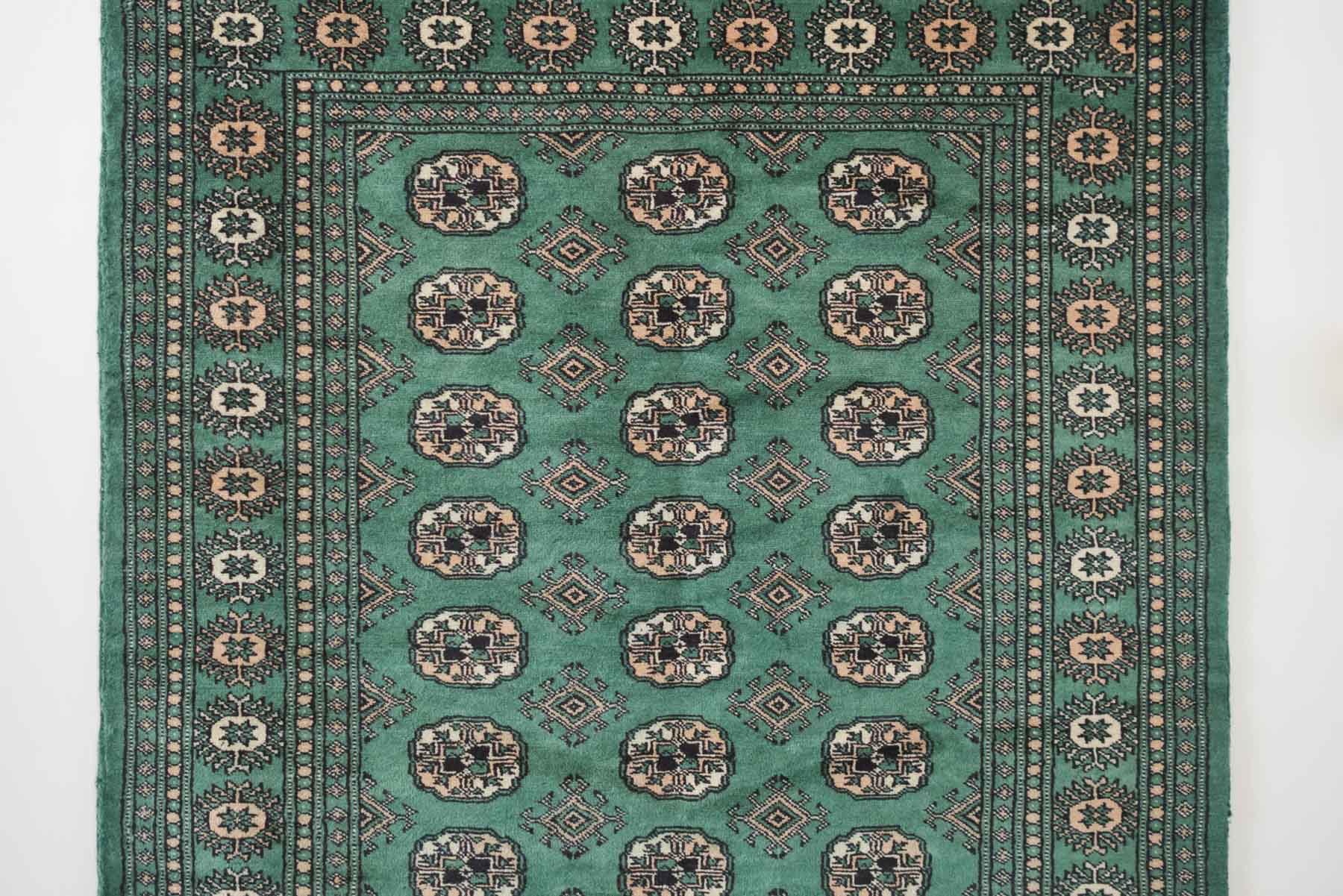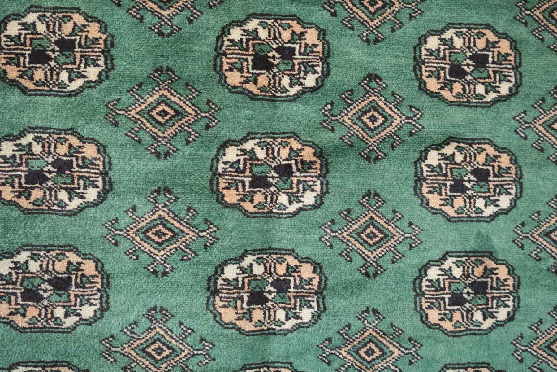 name: Deenarorigin: Pakistan, Peshawar Bokhara style: rug, carpetmaterial: hand knotted woolcolors: green, camel, black, cream age: newcondition: good, age related wear - see pictures