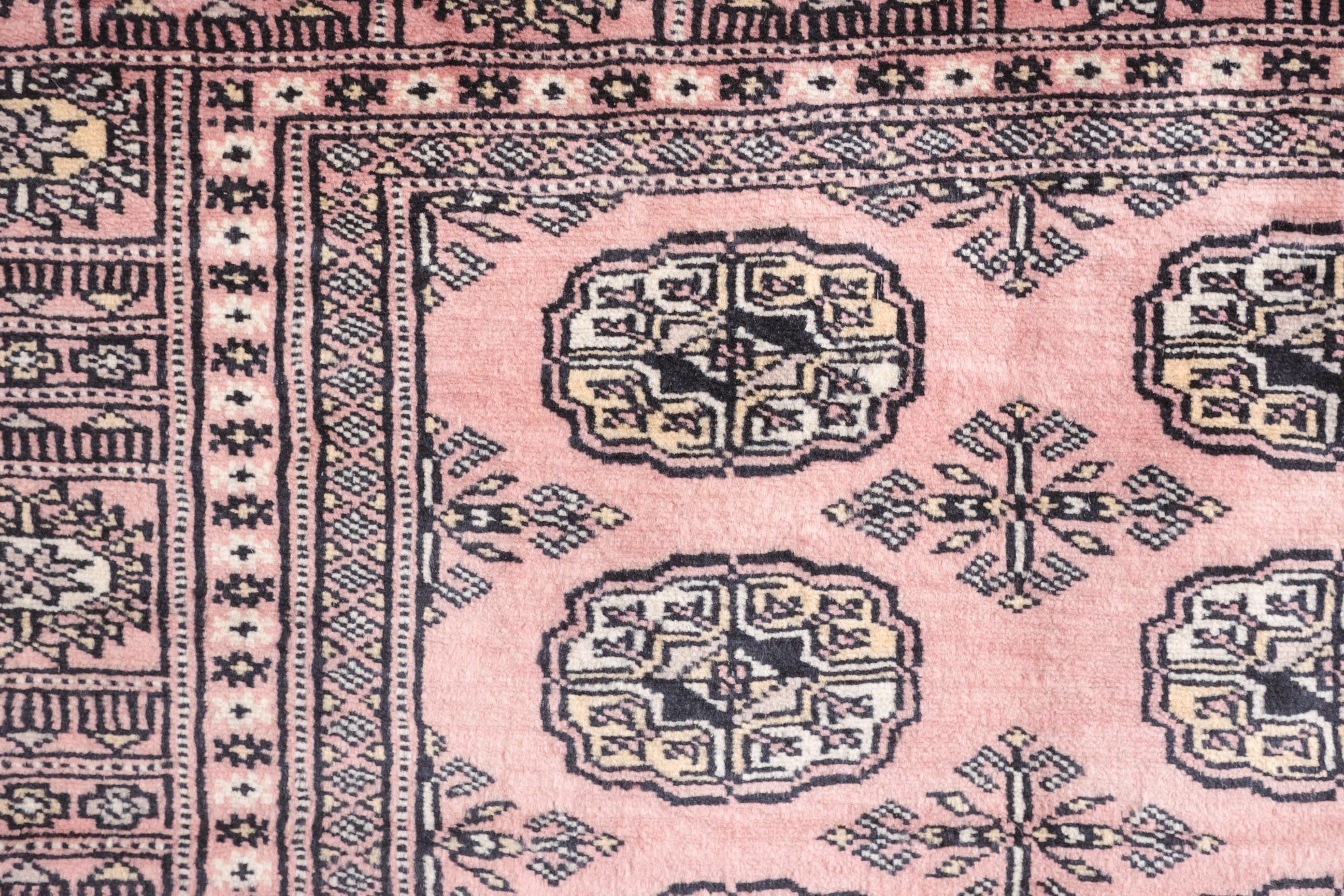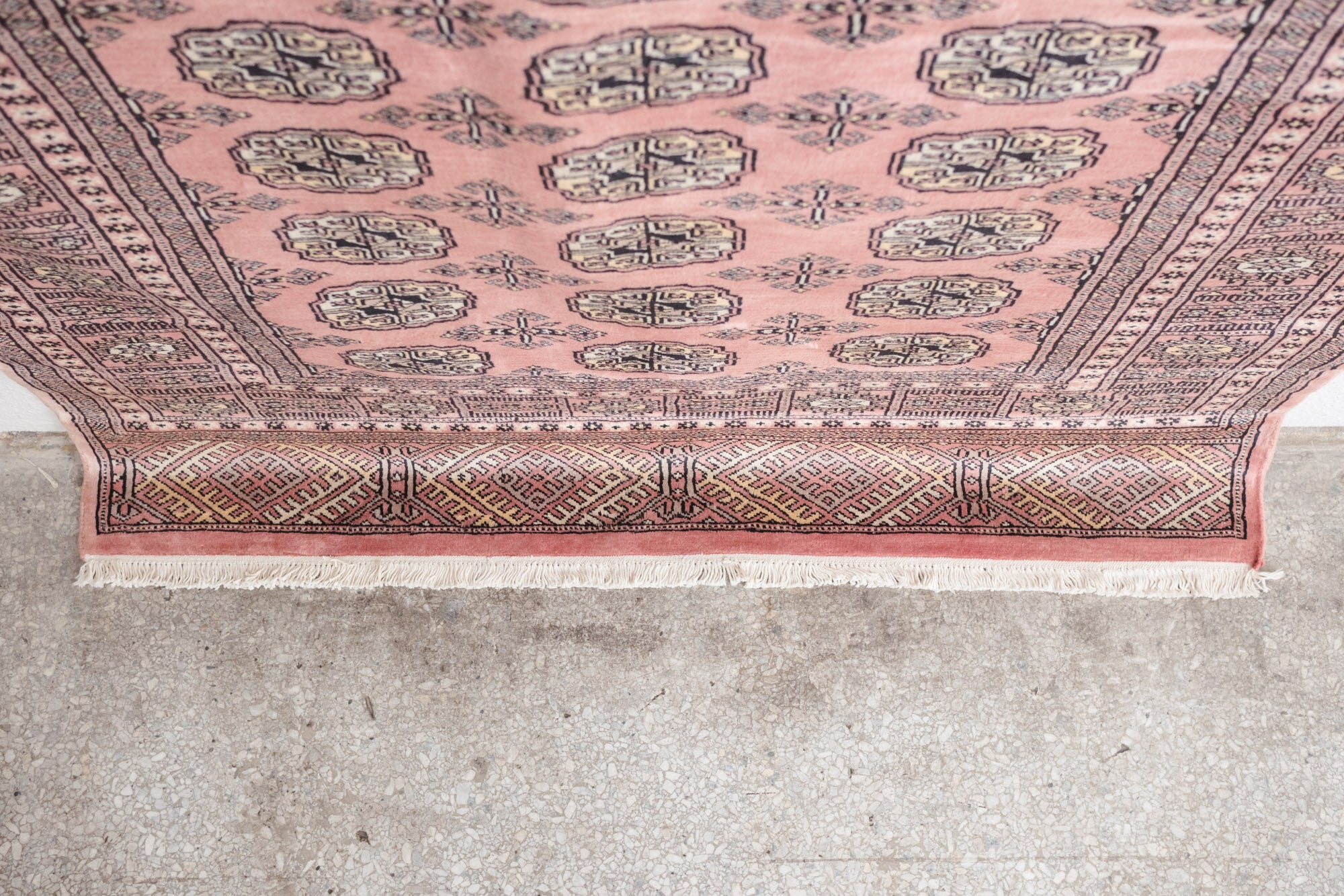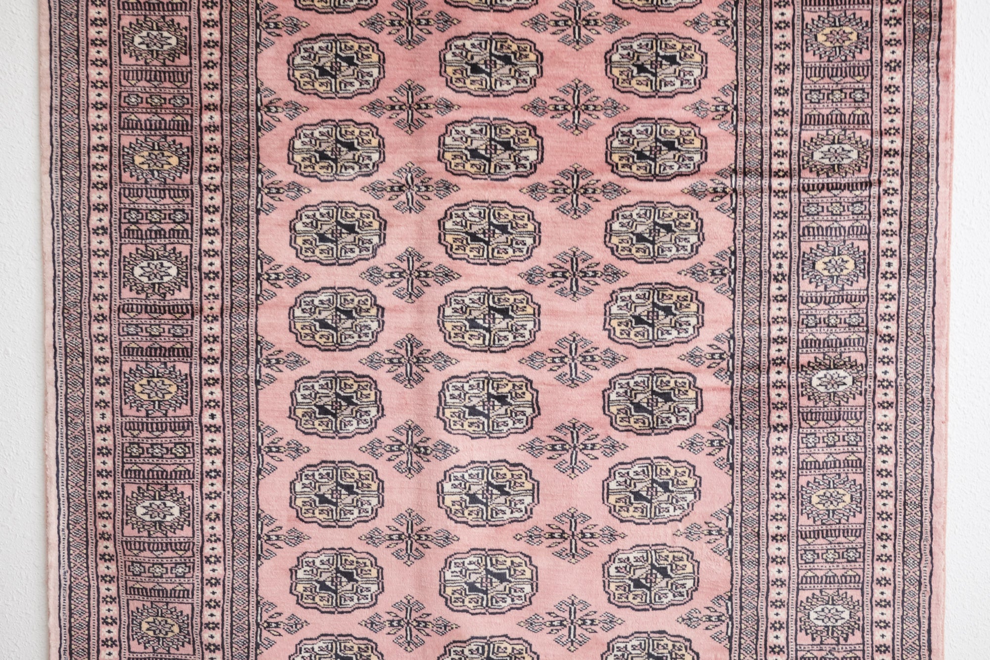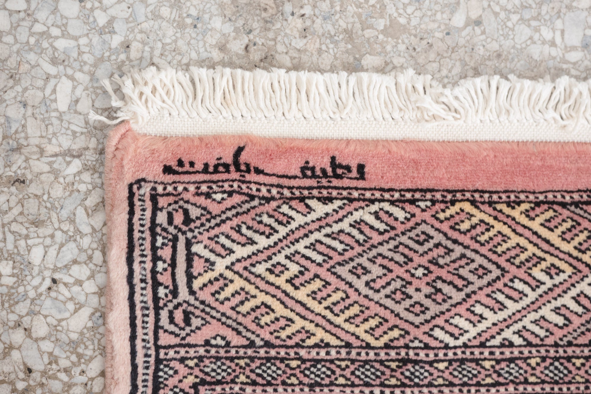 name: Kafilstyle: hand knotted, Pakistani, Peshawar, Bokhara, rug, carpetmaterial: woolcolors: pink, salmon, yellow, black, creamage: newcondition: good, age related wear - see pictures