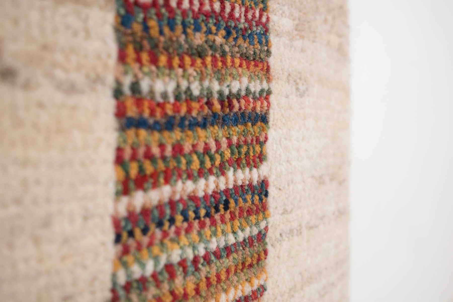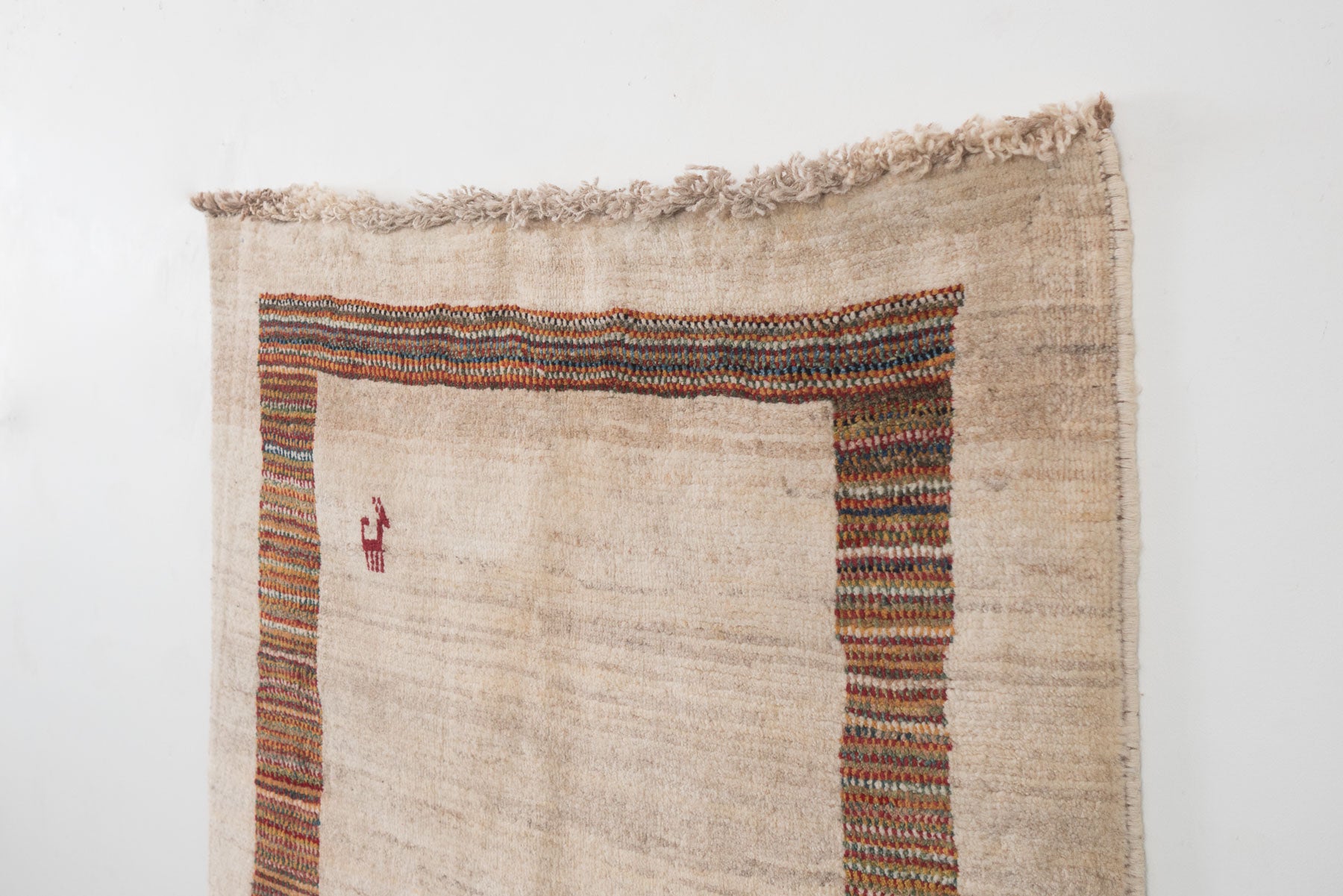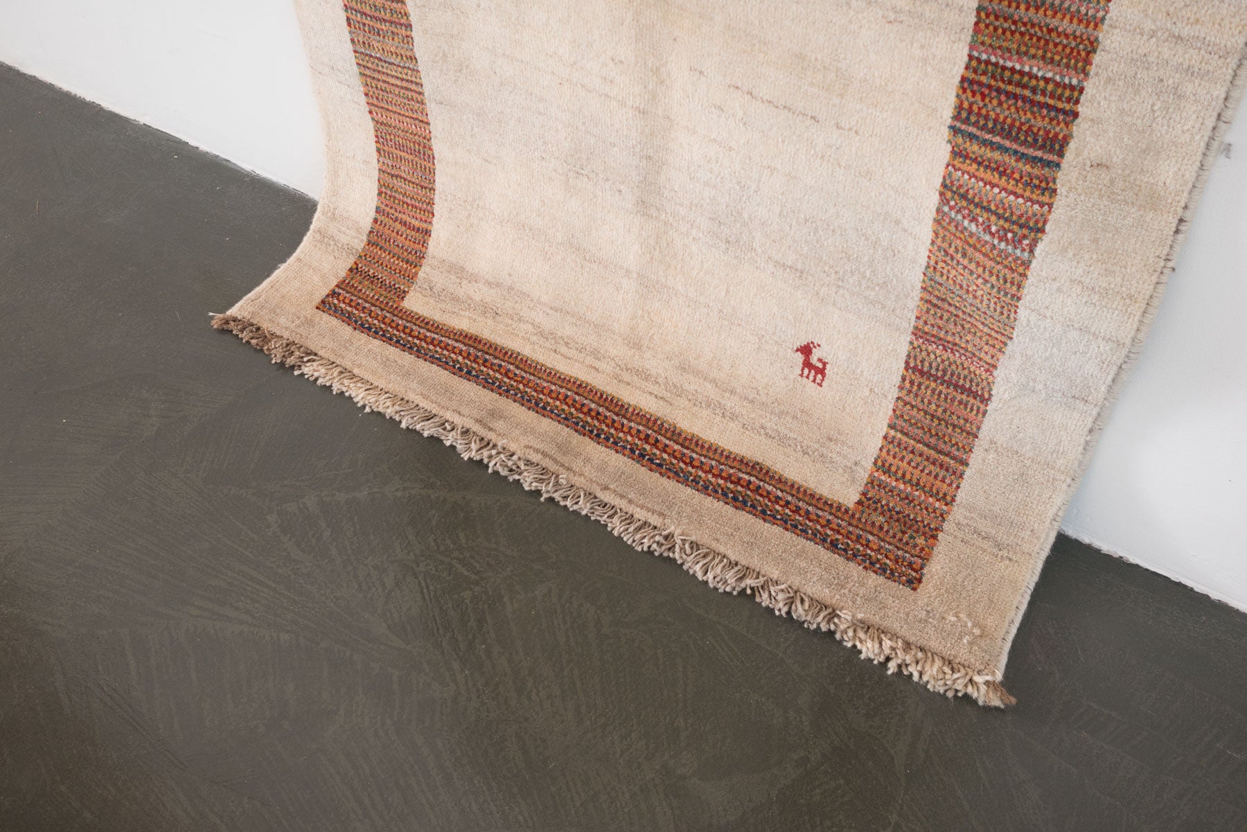 name: Danialorigin: Iran (Persian)style: gabbeh, rug, carpetmaterial: hand knotted woolcolors: cream, red, gold, green, navy, grayage: vintage condition: good, age related wear - see pictures