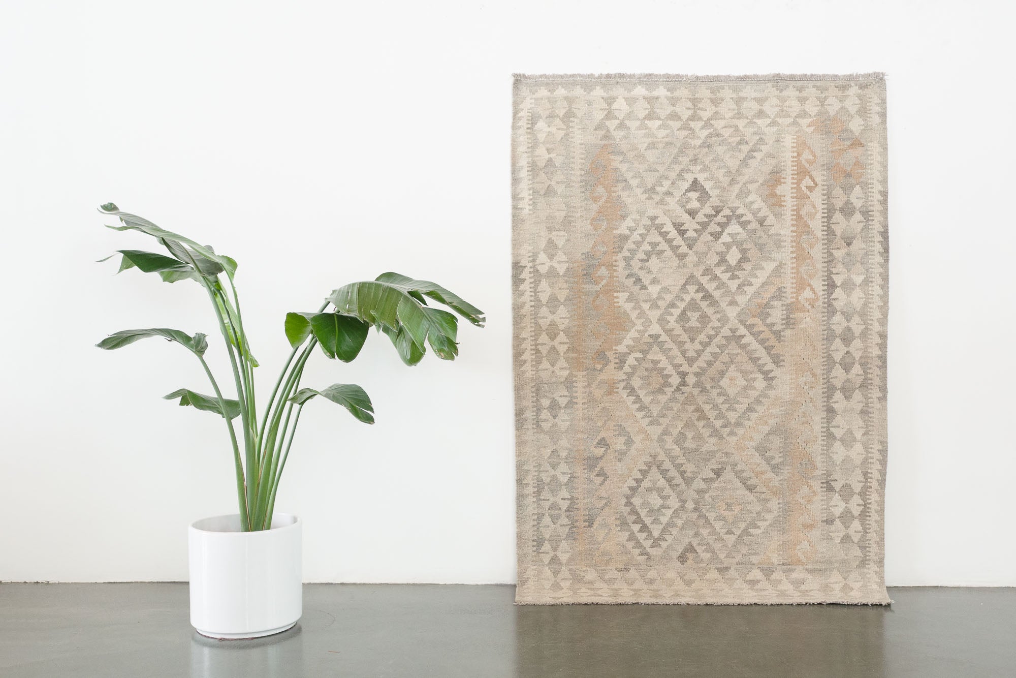 name: Berenorigin: Turkeystyle: rug, carpetmaterial: hand woven woolcolors: cream, tan, grayage: vintage, 1940-1970condition: good, age related wear - see picturesappraised value: $832sku: t-410