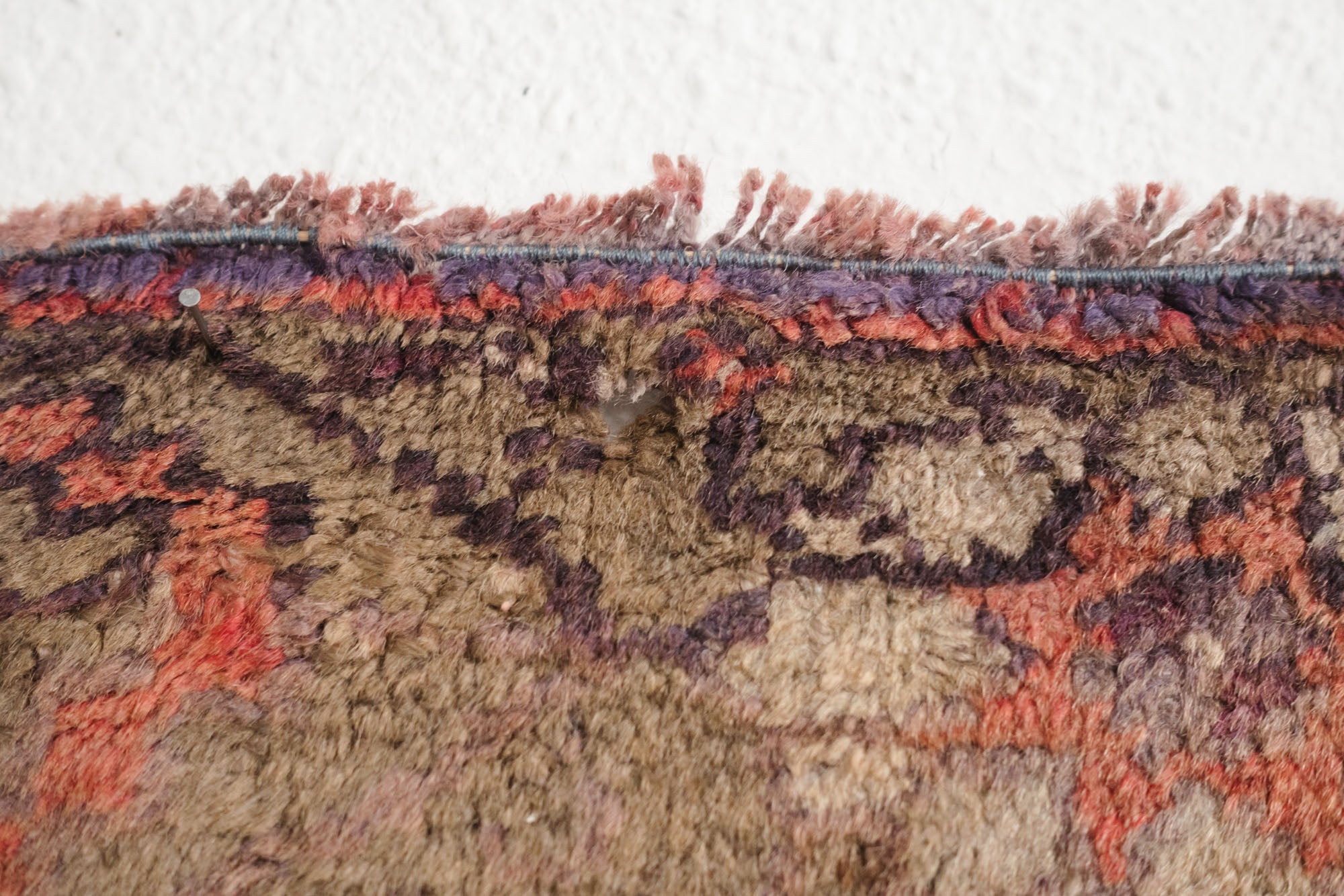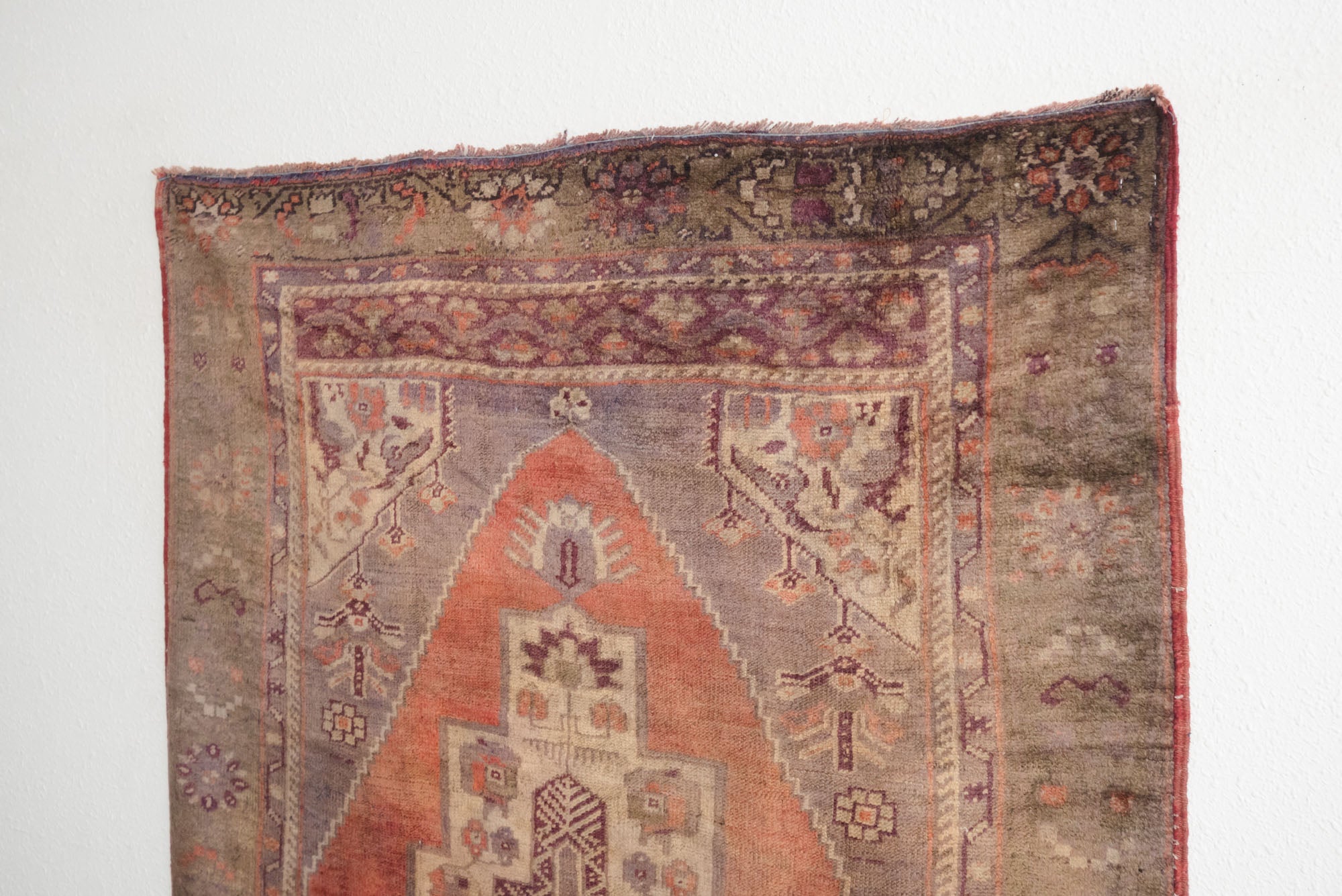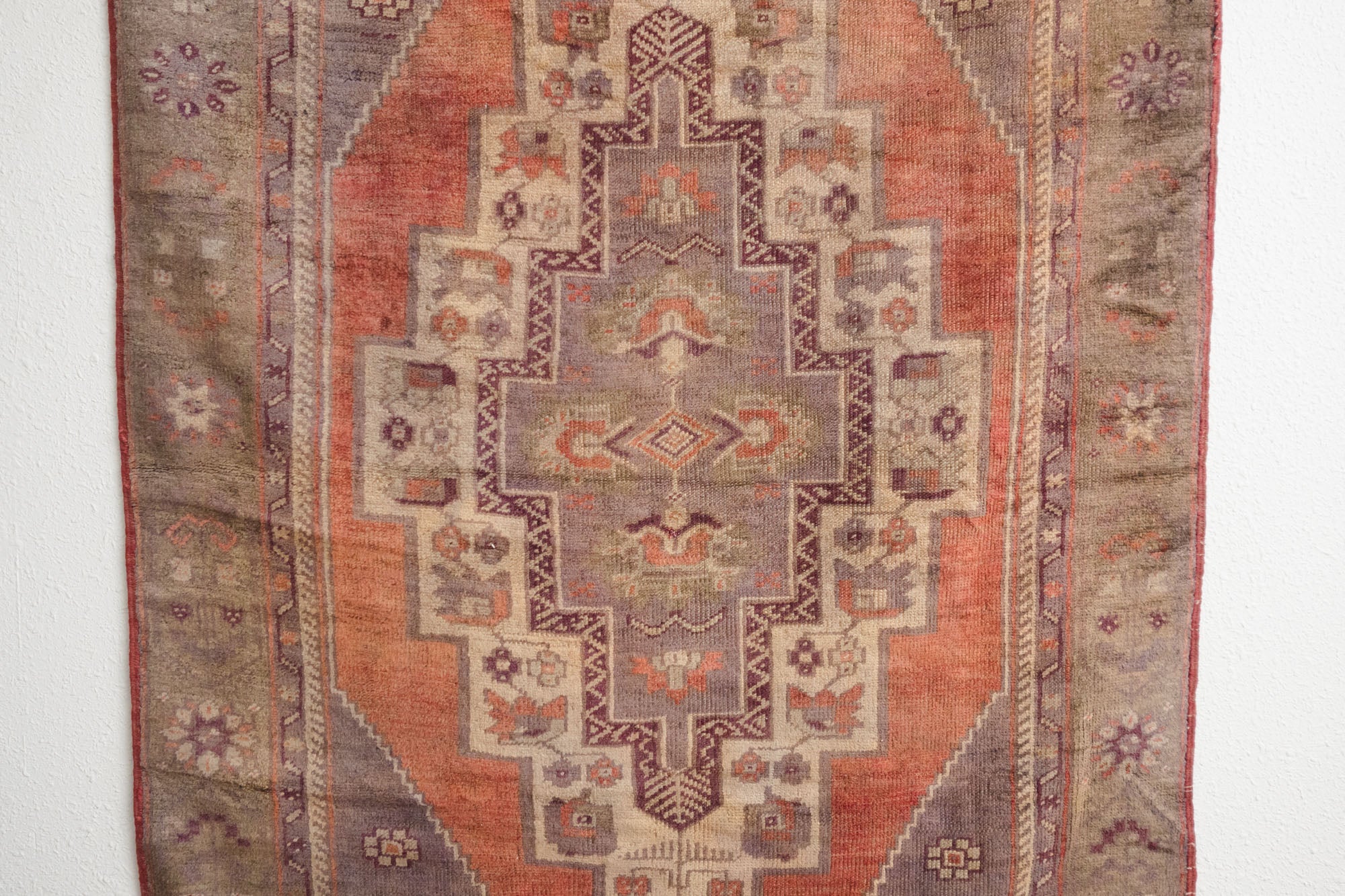 name: Bikemorigin: Turkeystyle: rug, carpetmaterial: hand knotted woolcolor: orange, purple, green, camel, brown, cream age: vintagecondition: good, age related wear (small hole) - see pictures