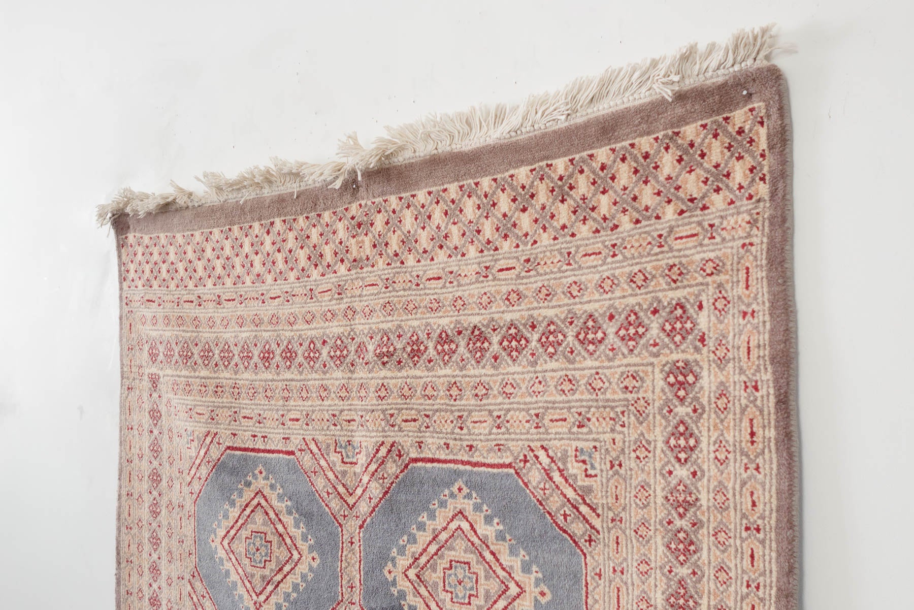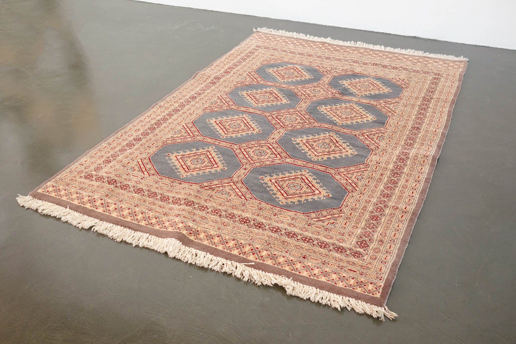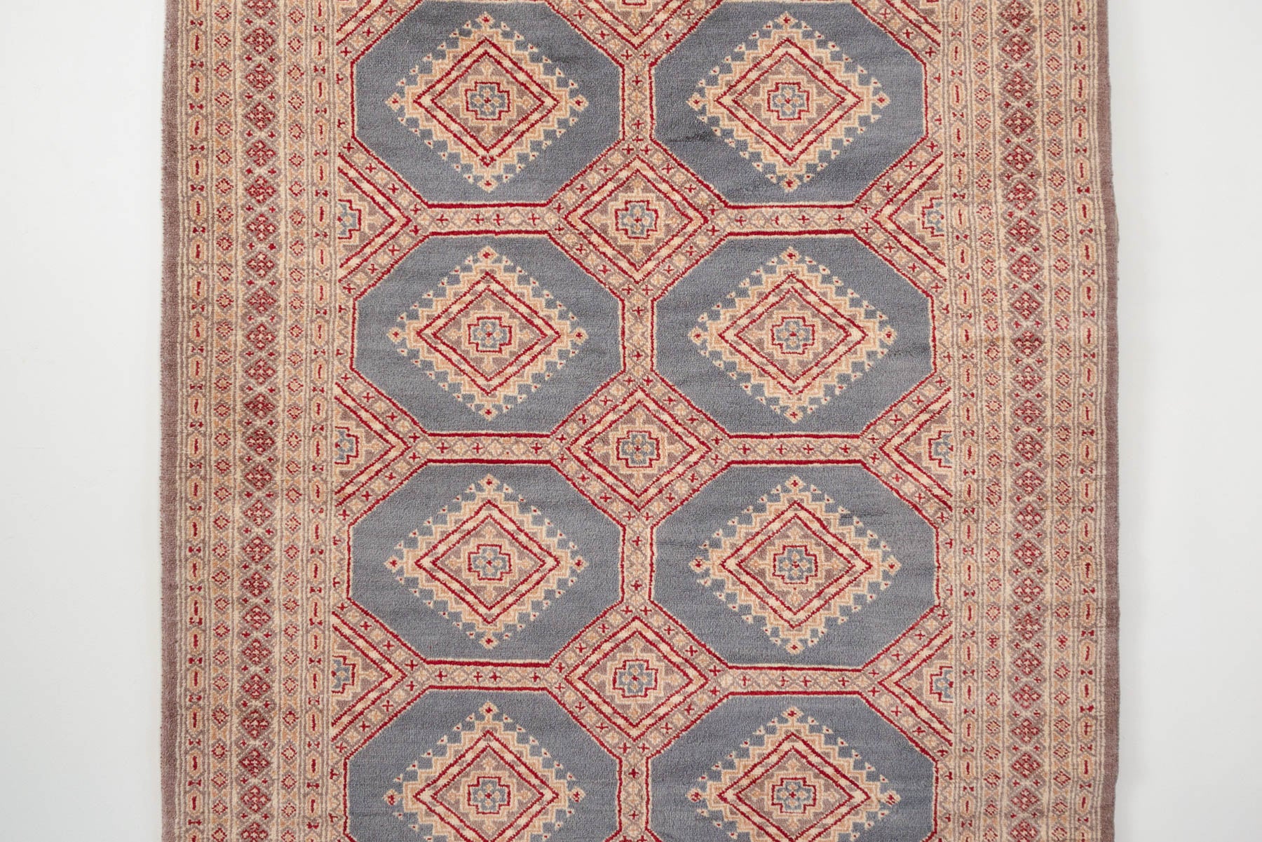 name: Etizazstyle: hand knotted, Pakistani, Peshawar Bokhara, rug, carpetmaterial: woolcolors: red, beige, tan, slate greyage: vintage condition: good, age related wear - see pictures51" x 78" (closest standard rug size is 4x7)Free domestic shipping on all rugs.Contact us for an international shipping quote.