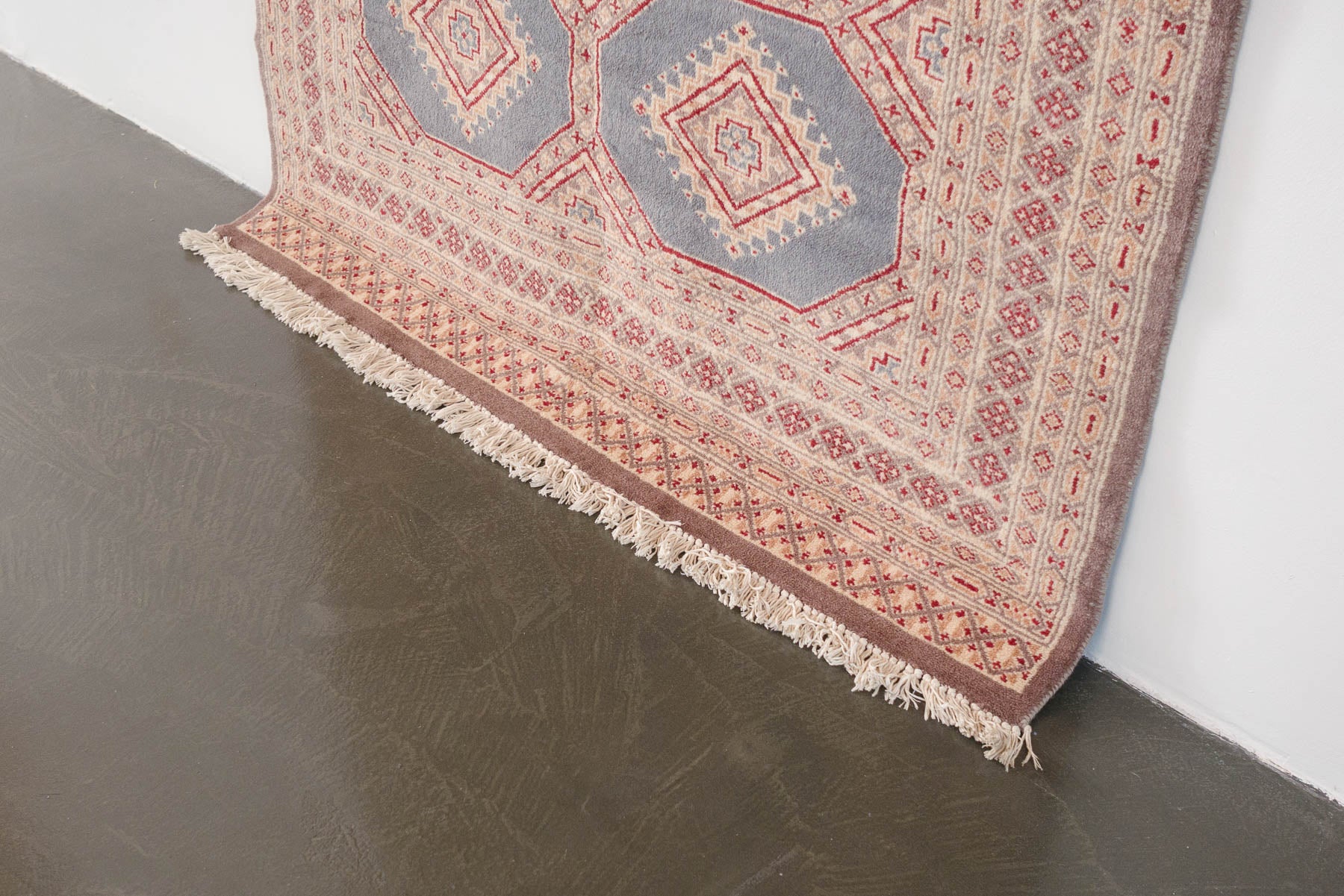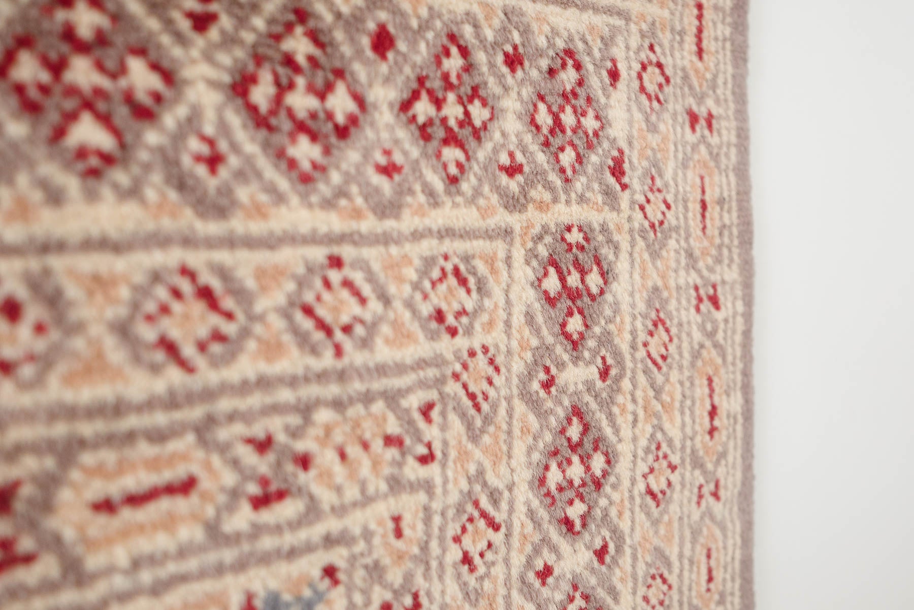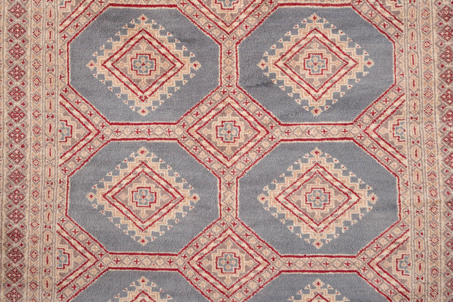 name: Etizazstyle: hand knotted, Pakistani, Peshawar Bokhara, rug, carpetmaterial: woolcolors: red, beige, tan, slate greyage: vintage condition: good, age related wear - see pictures51" x 78" (closest standard rug size is 4x7)Free domestic shipping on all rugs.Contact us for an international shipping quote.