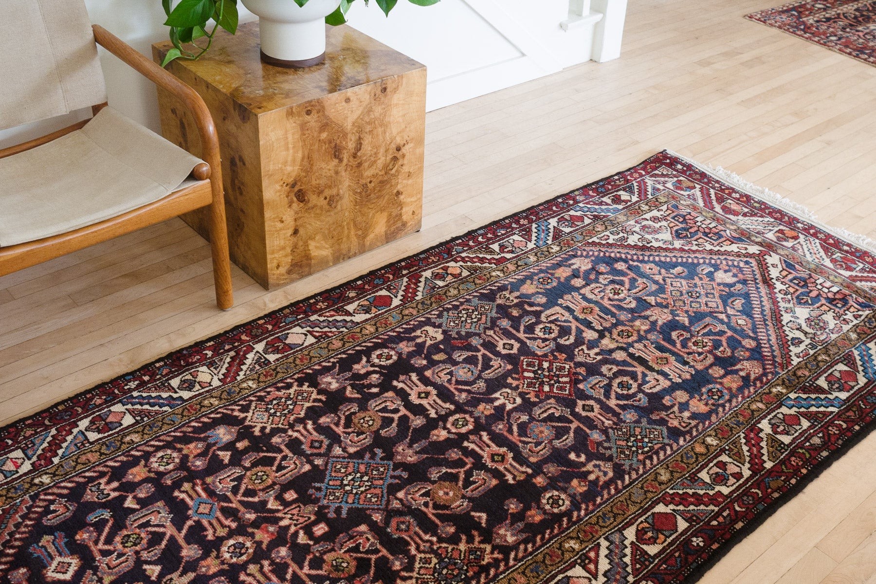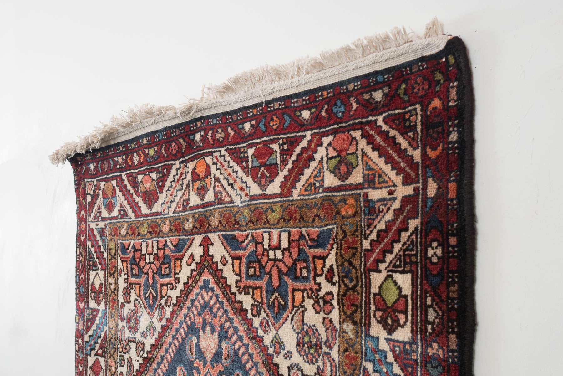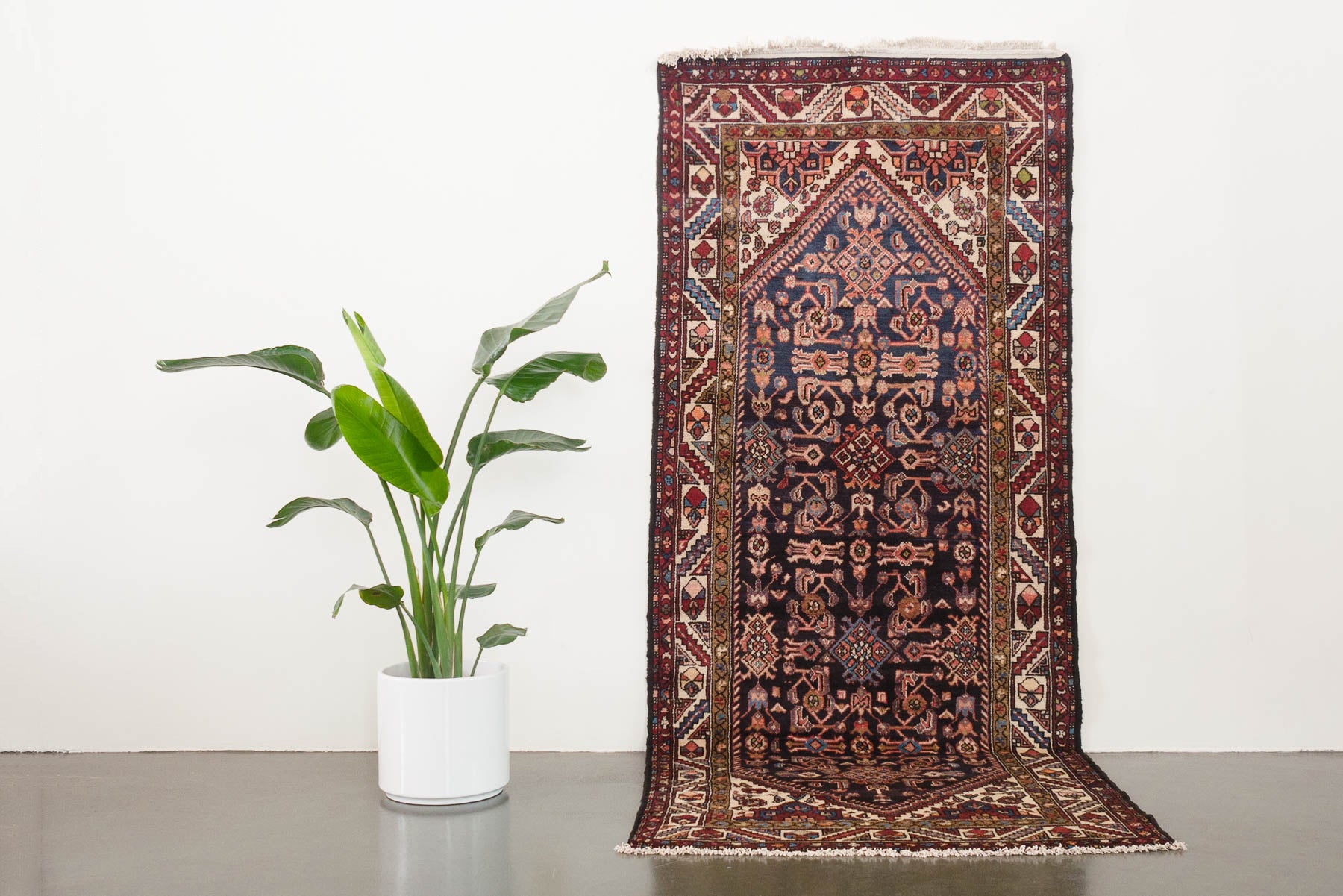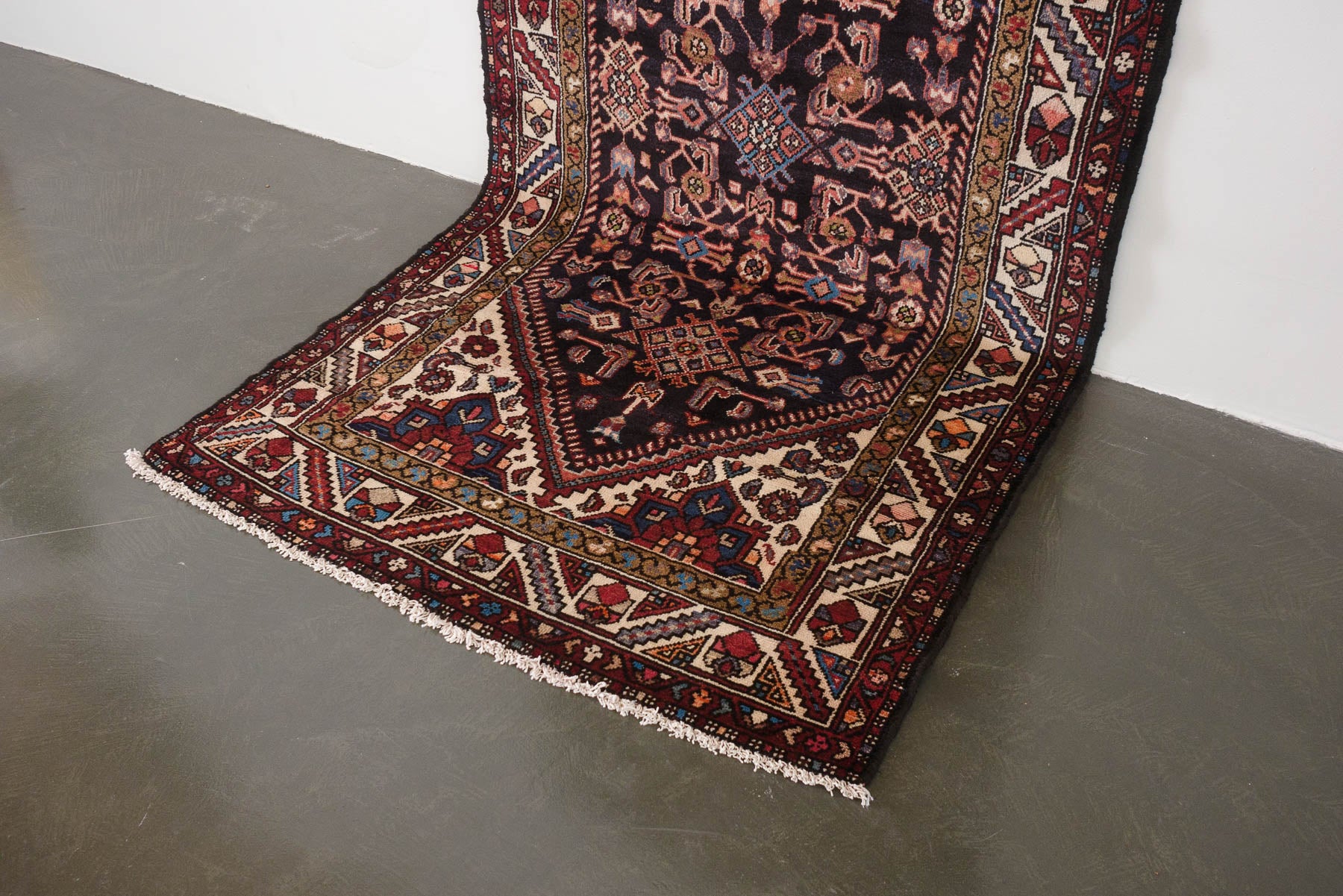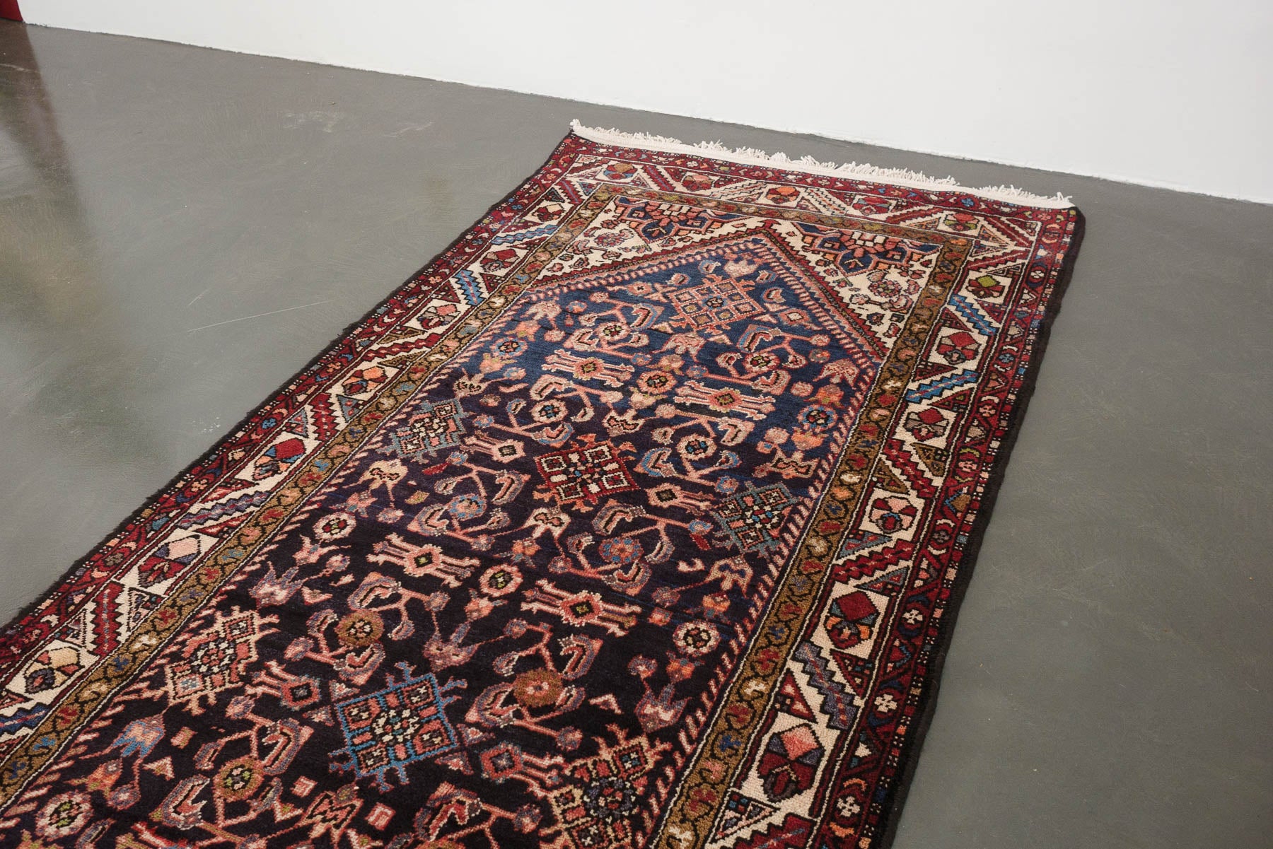 name: Orandorigin: Iran (Persian)style: rug, runner, carpet material: hand knotted woolcolors: red, pinks, blues, navy, greens, camel, cream, black age: vintage condition: good, age related wear - see pictures47" x 119" (closest standard rug size is 4x9.5)Free domestic shipping on all rugs.Contact us for an international shipping quote.