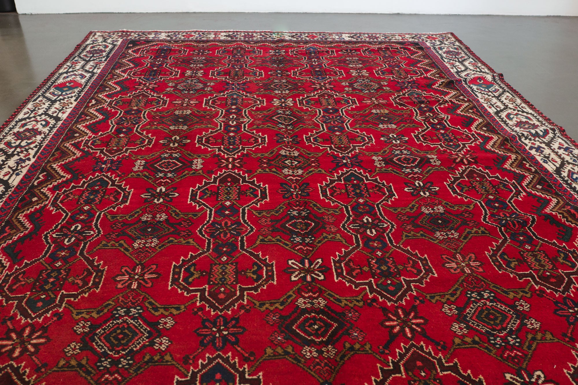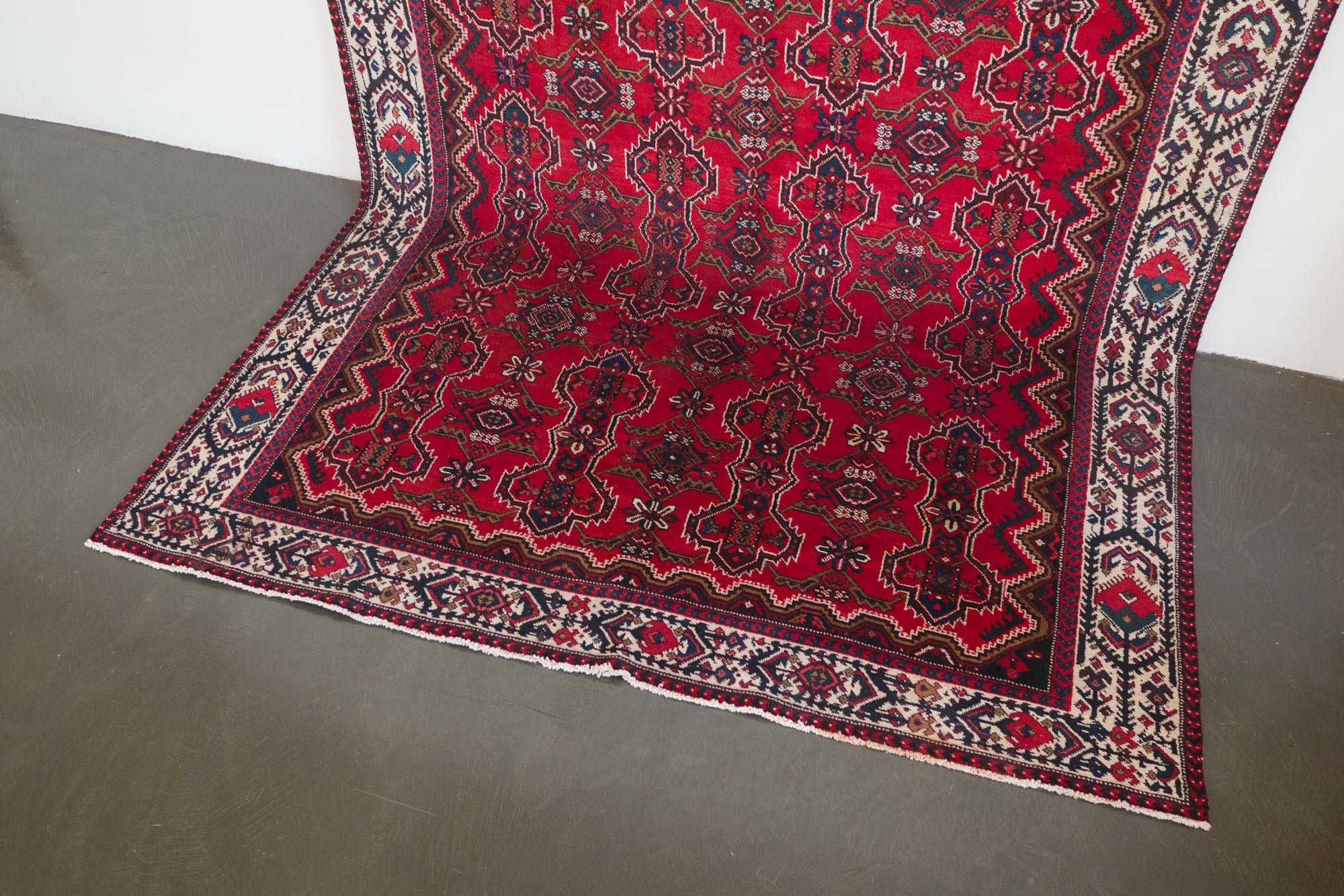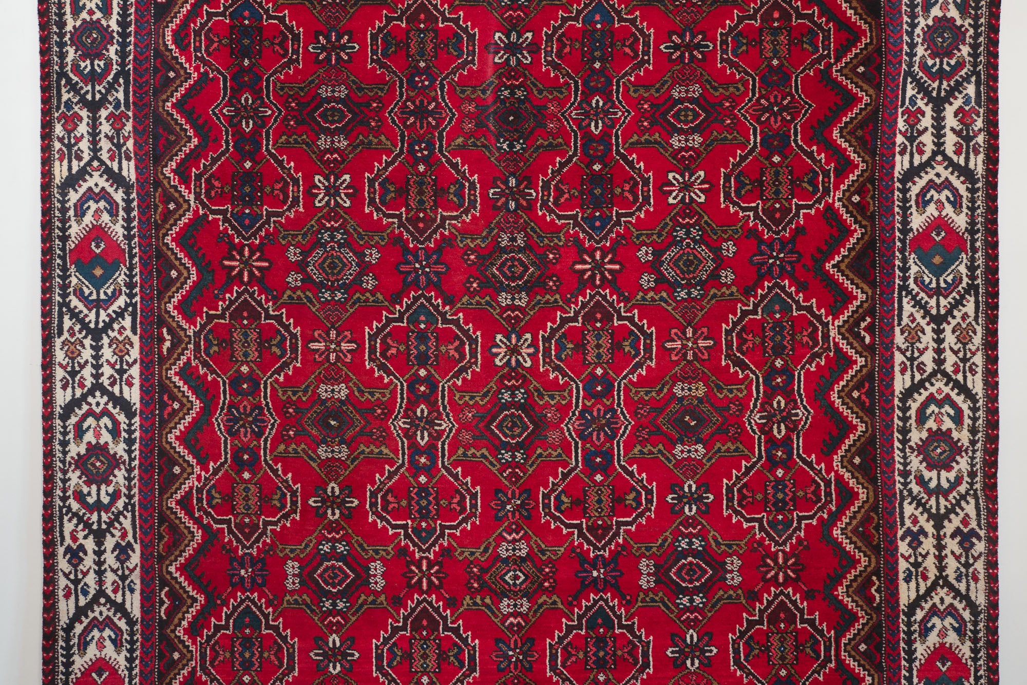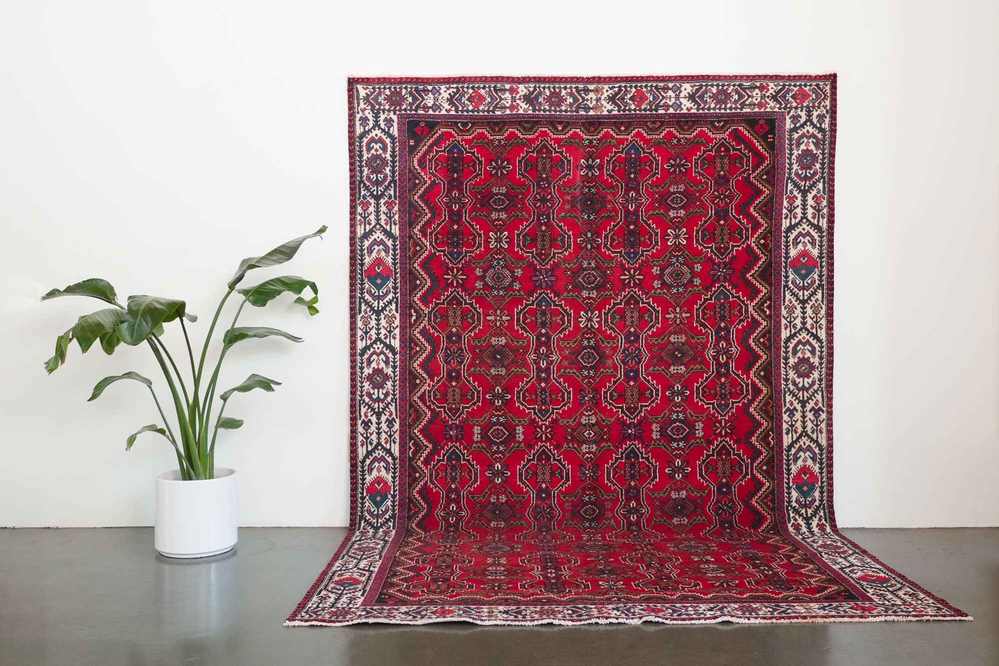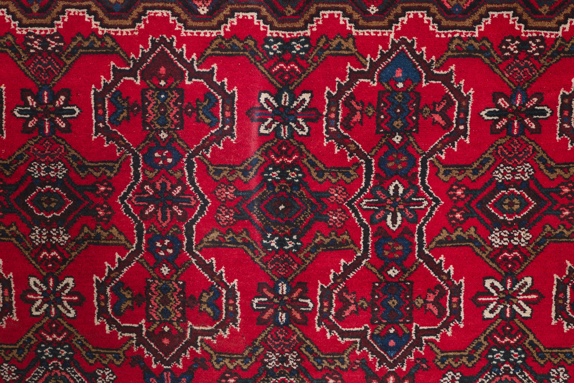 name: Hormozorigin: Persianstyle: traditional, rug, carpetmaterial: hand knotted woolcolor: reds, black, blue, green, browns, creamage: vintage (1940-1969)condition: good, age related wear - see picturesappraised value: $3,184
