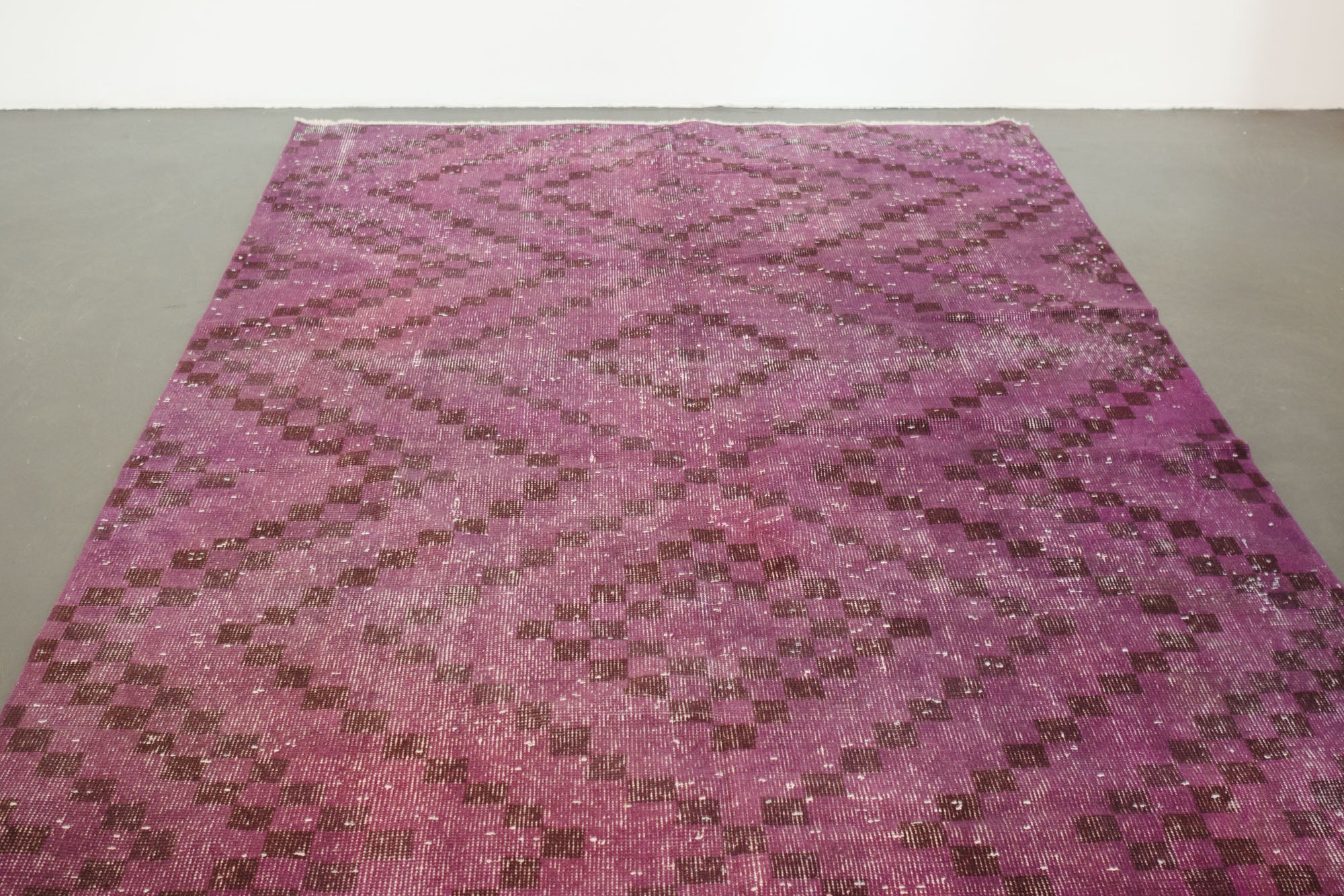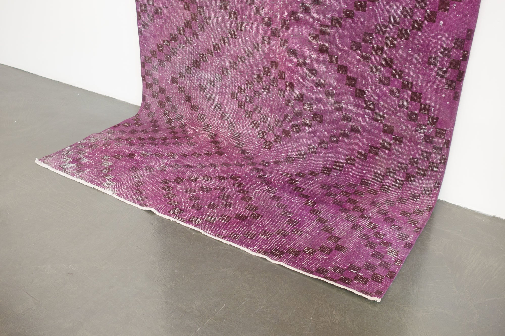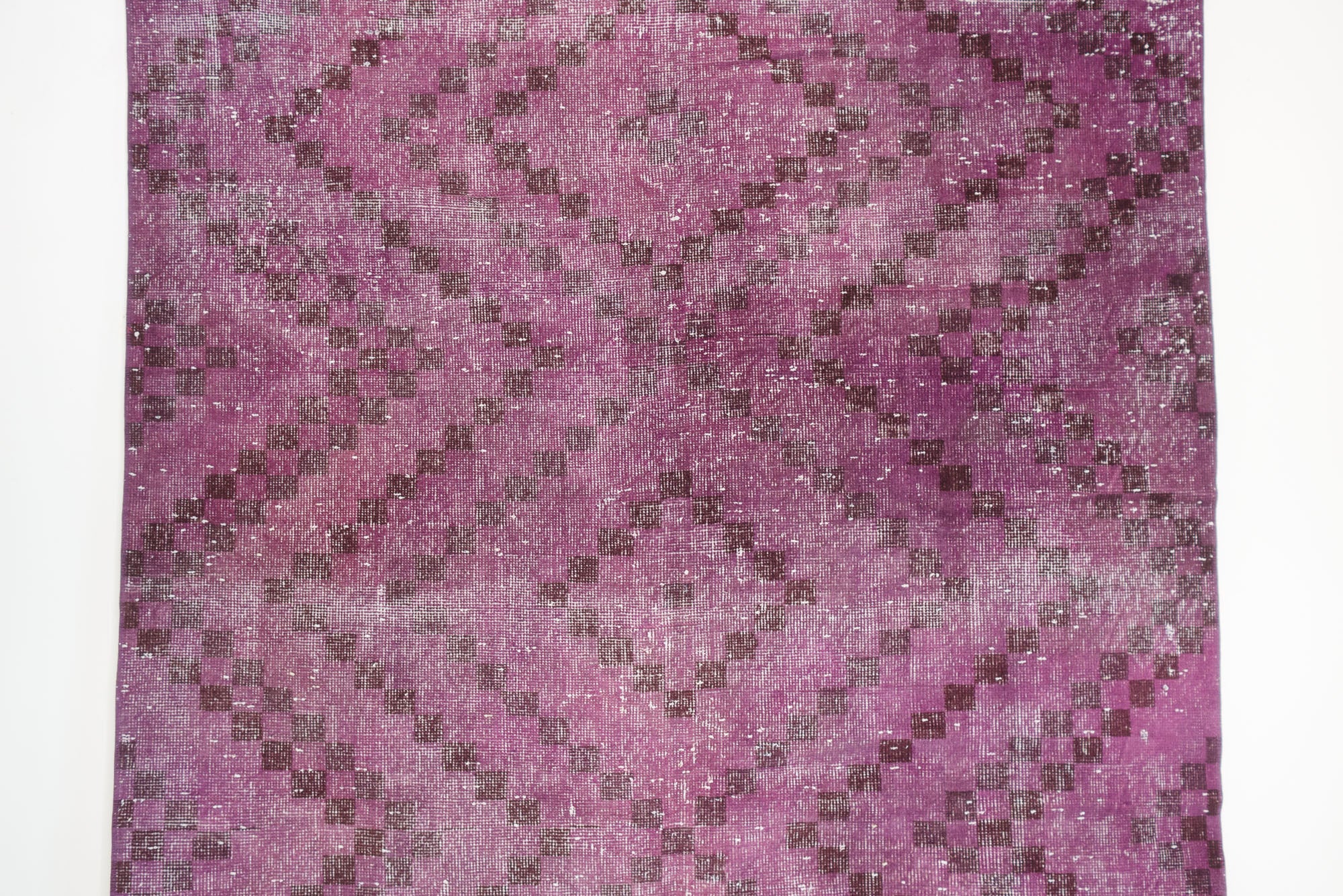 name: Bayrakorigin: Turkeystyle: overdye, geometric, rug, carpetmaterial: hand knotted woolcolor: purples, black, creamage: vintage (1940-1969)condition: good, age related wear - see picturesappraised value: $1,732sku: t-364