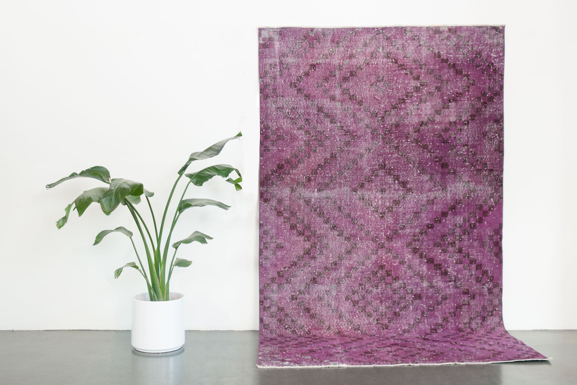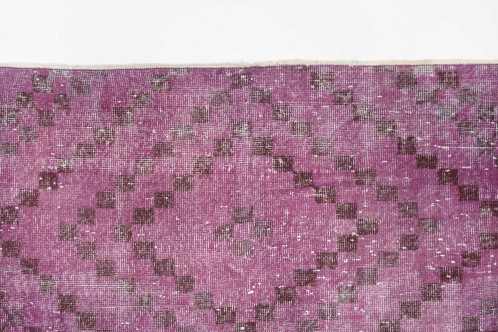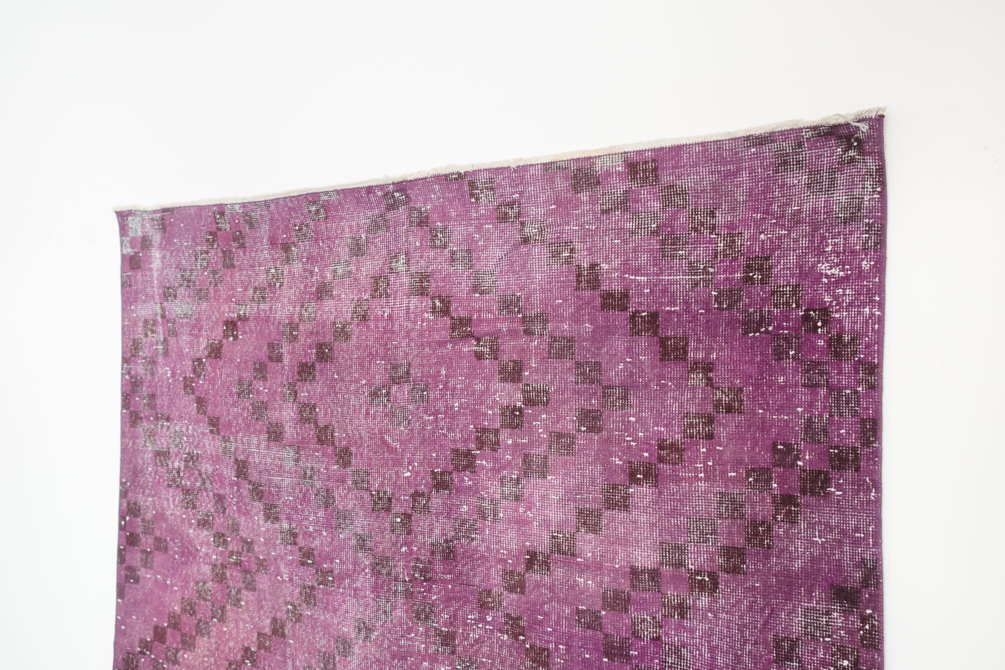 name: Bayrakorigin: Turkeystyle: overdye, geometric, rug, carpetmaterial: hand knotted woolcolor: purples, black, creamage: vintage (1940-1969)condition: good, age related wear - see picturesappraised value: $1,732sku: t-364