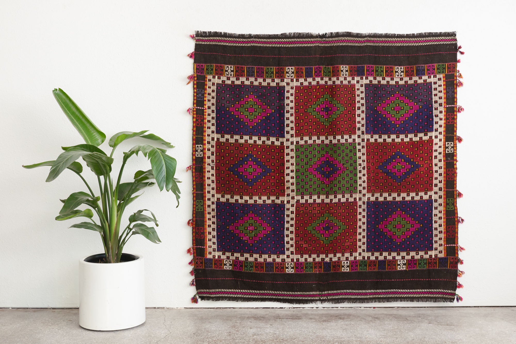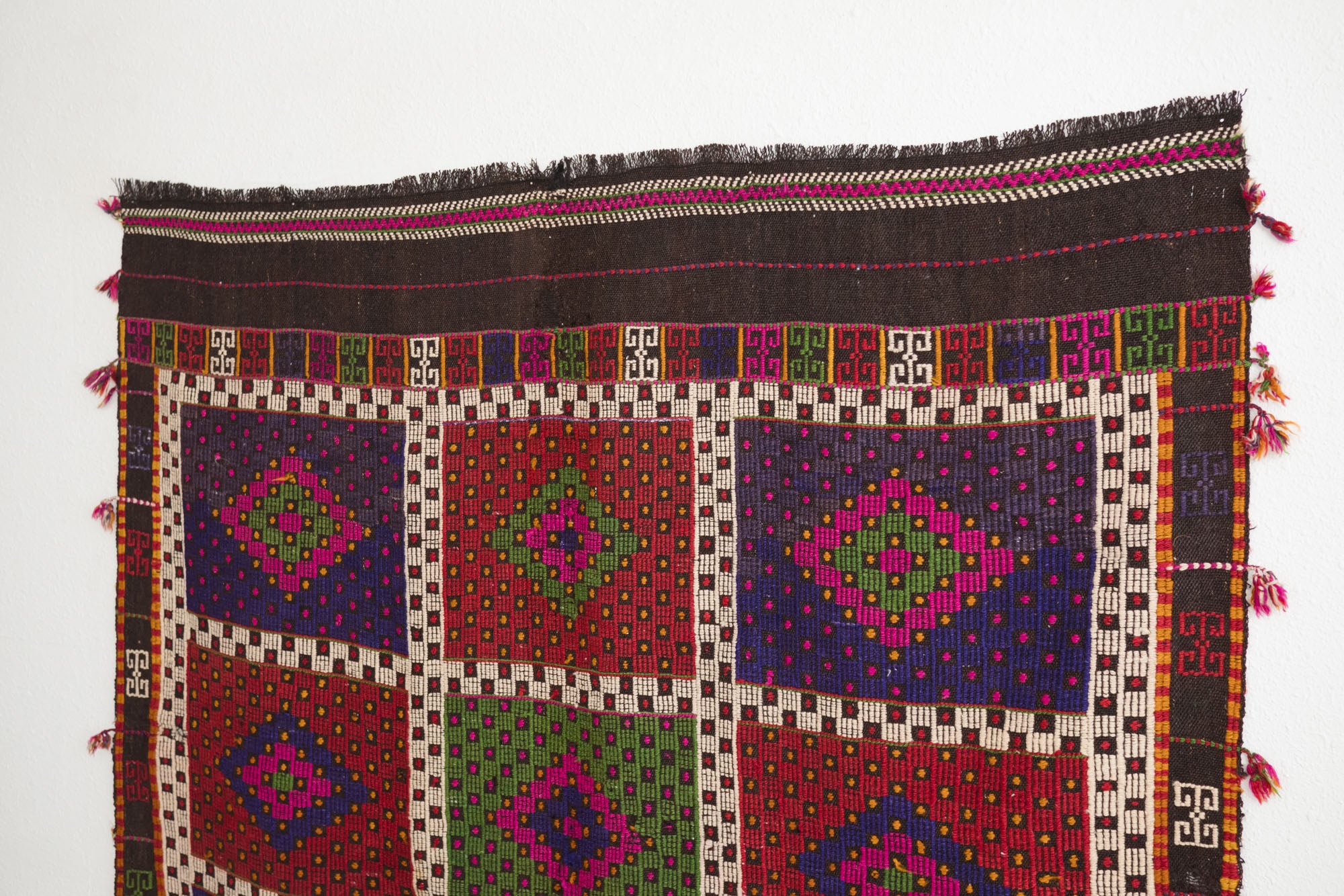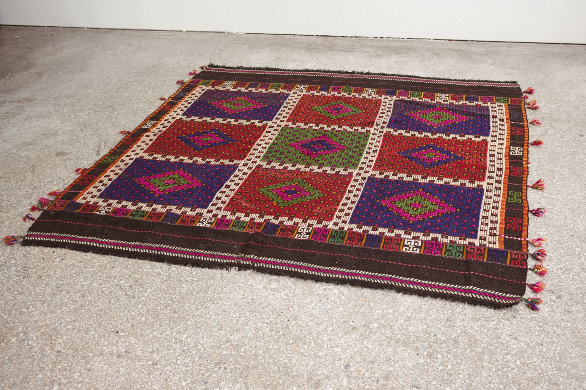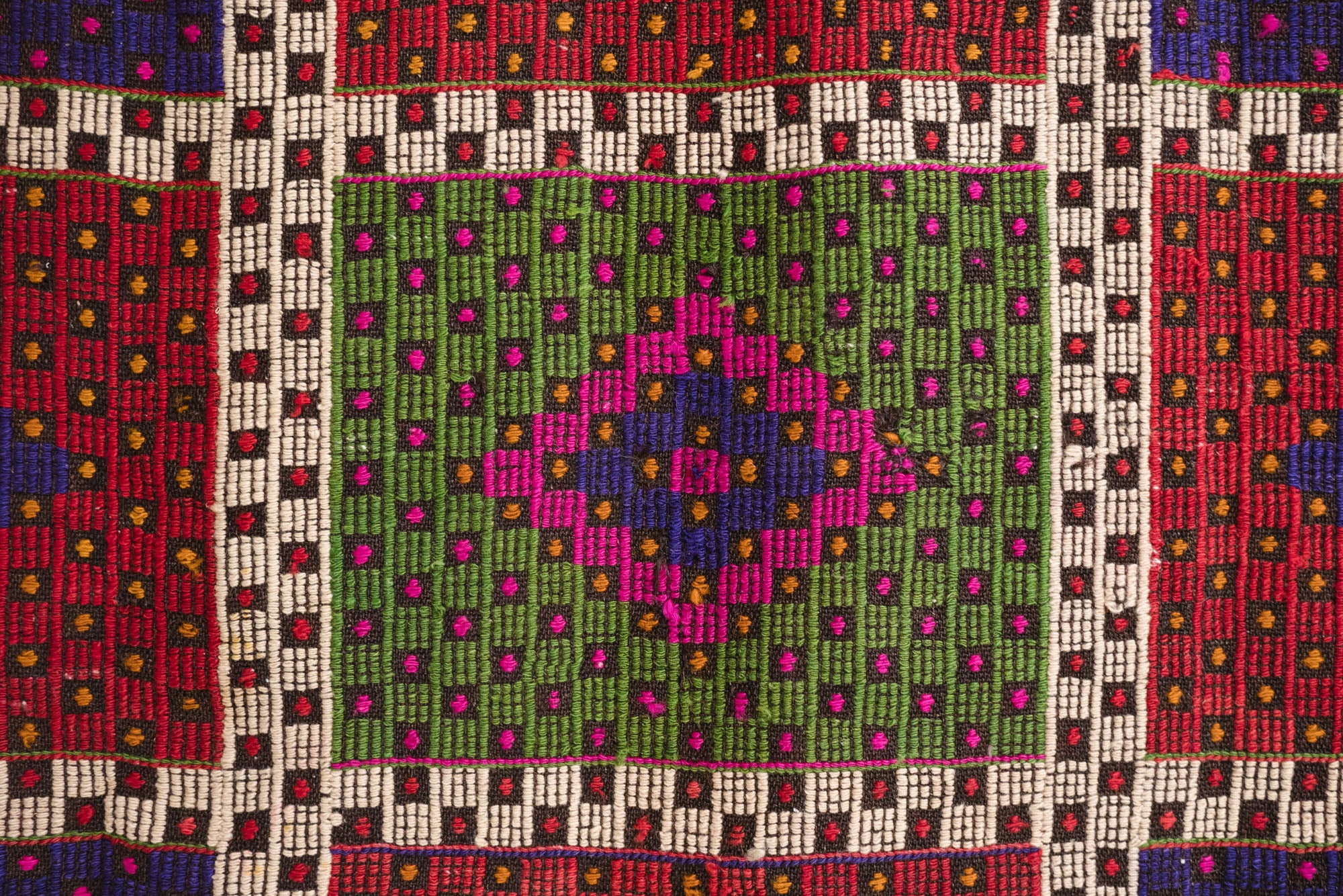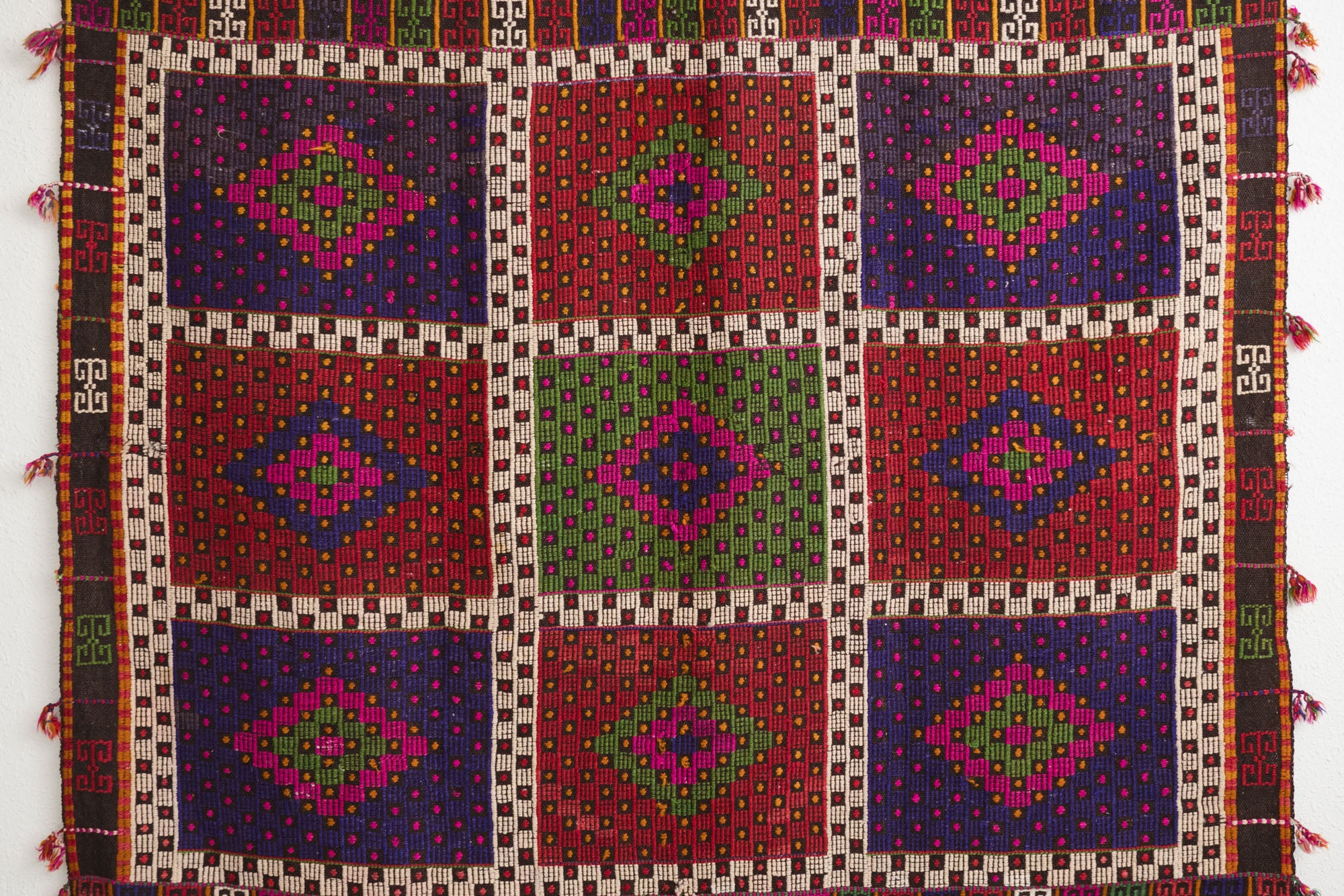 name: Hakanstyle: hand woven, Turkish, Yoruk, Soumak, rug, carpetmaterial: woolcolor: red, orange, pink, purple, green, creamage: vintagecondition: good, age related wear - see pictures