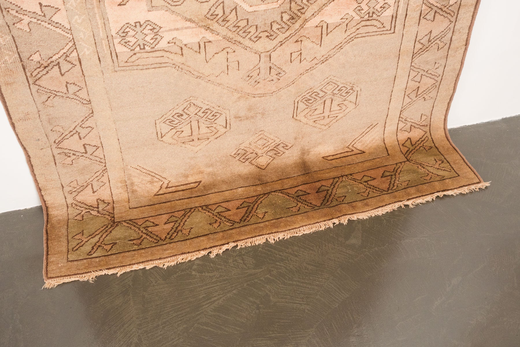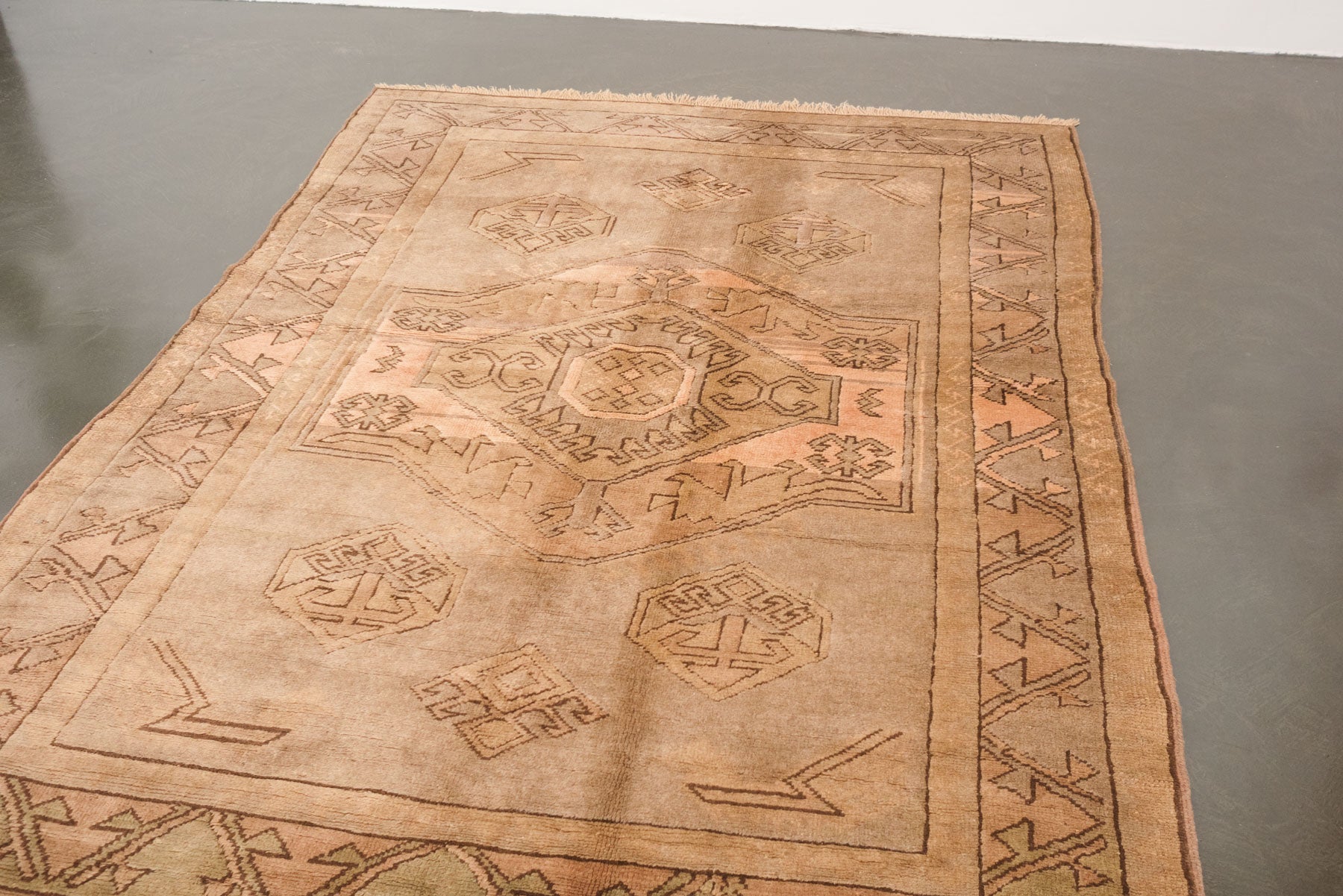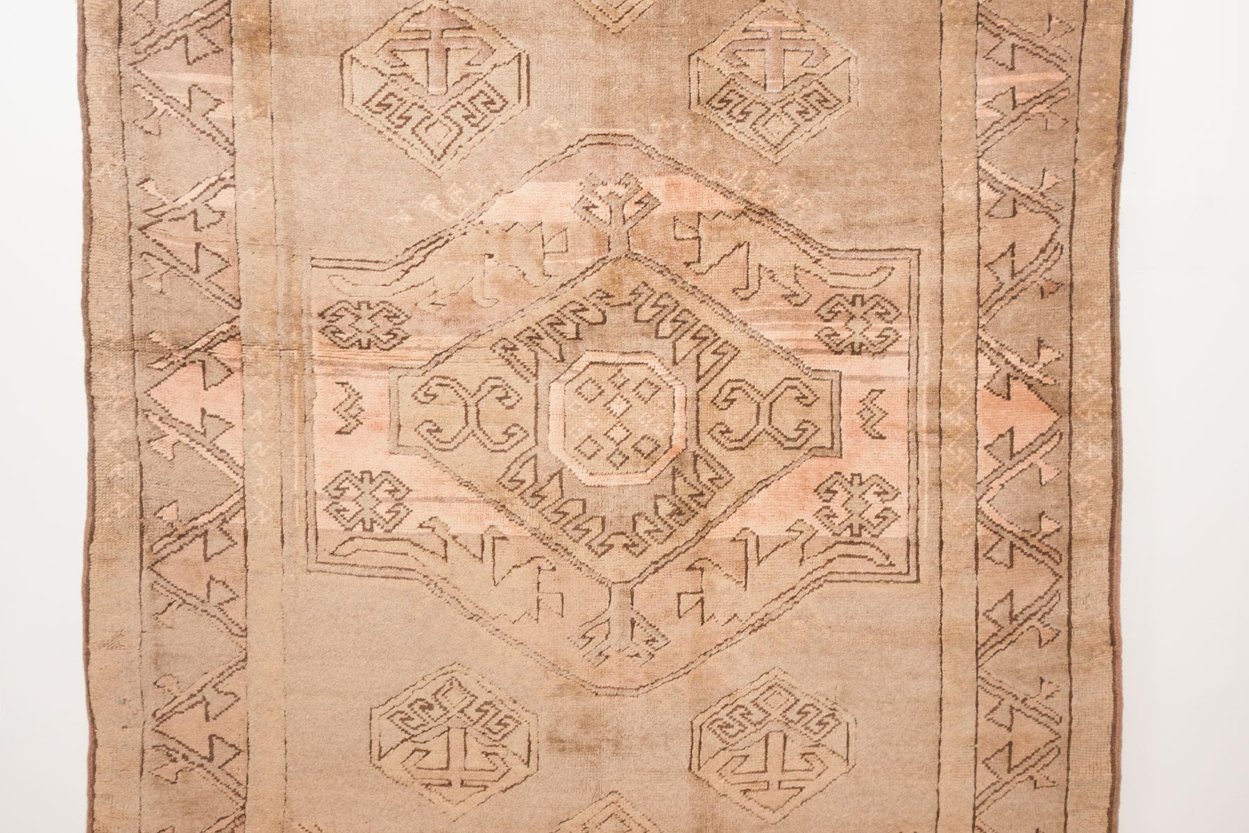 name: Caferorigin: Turkey, Shiravanstyle: sunwashed, rug, carpetmaterial: hand knotted wool colors: camel, pink, brownage: vintage condition: good, age related wear - see pictures