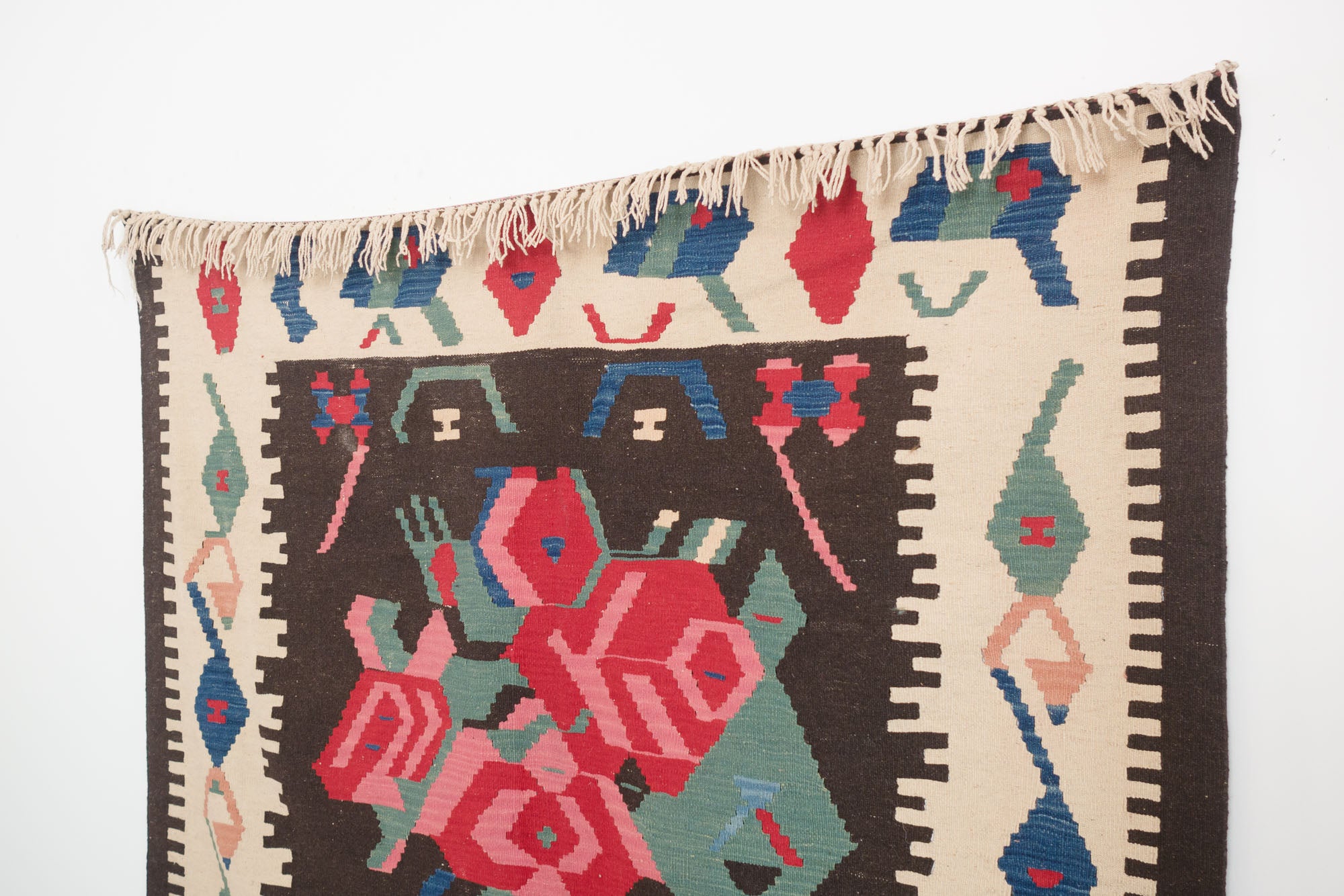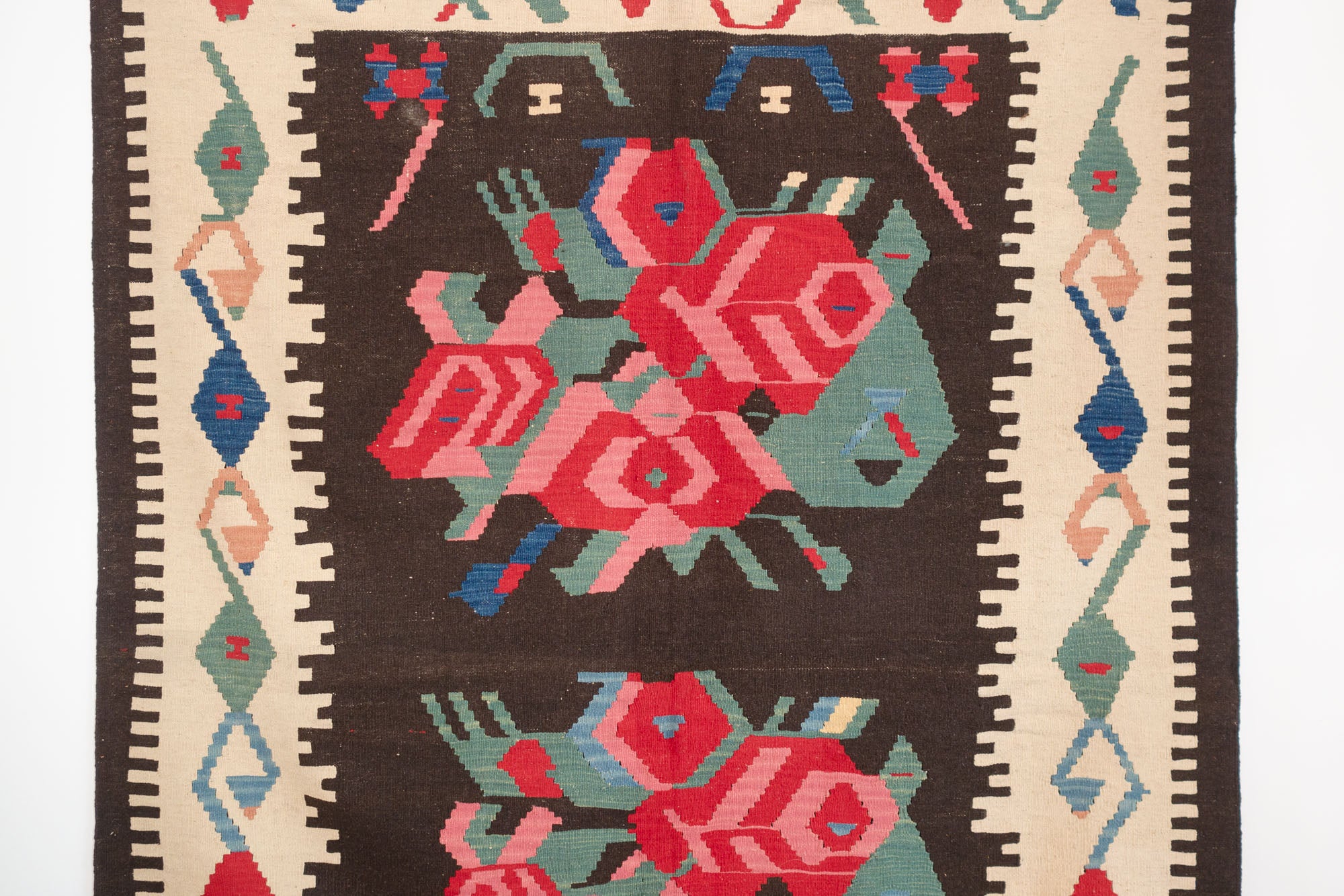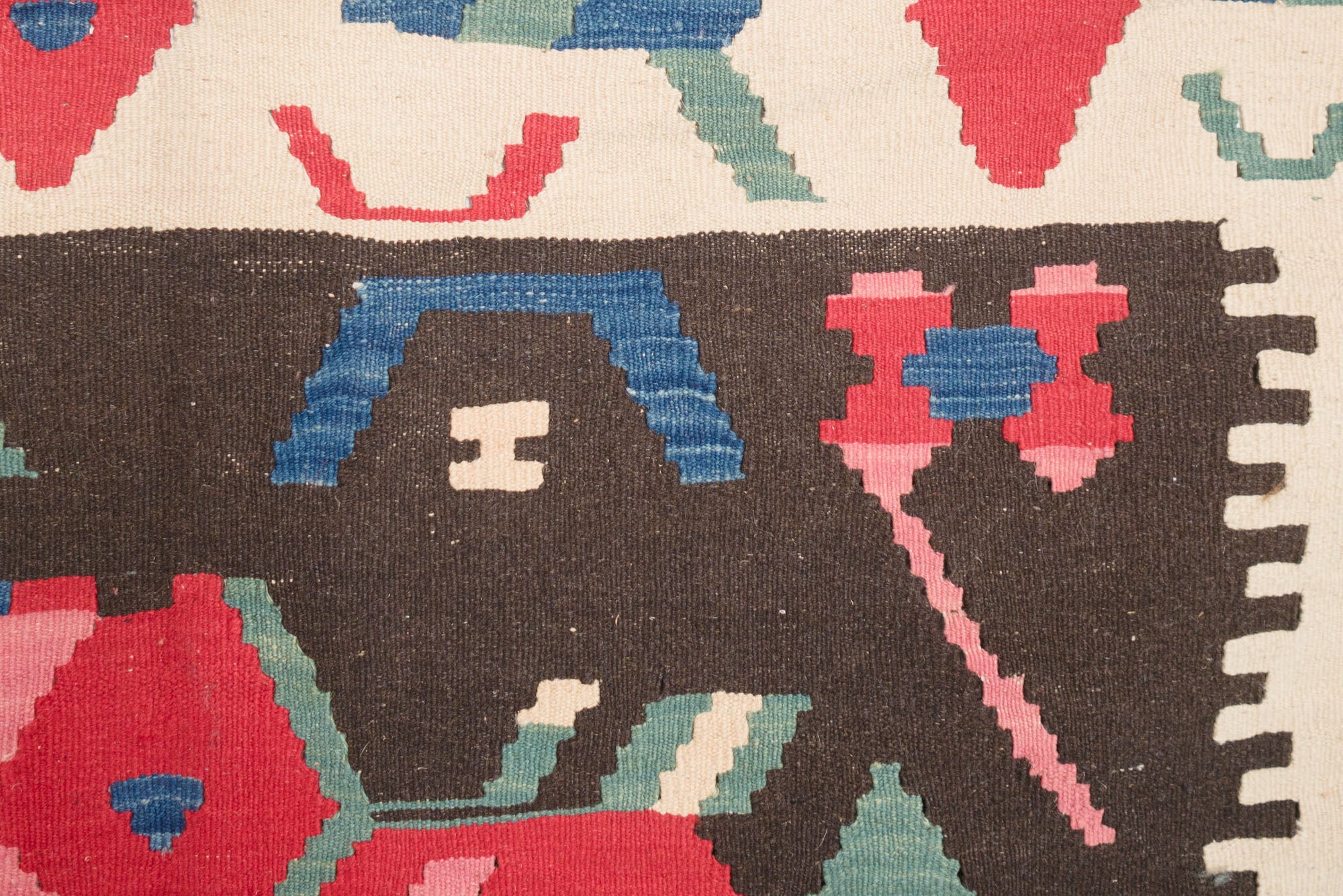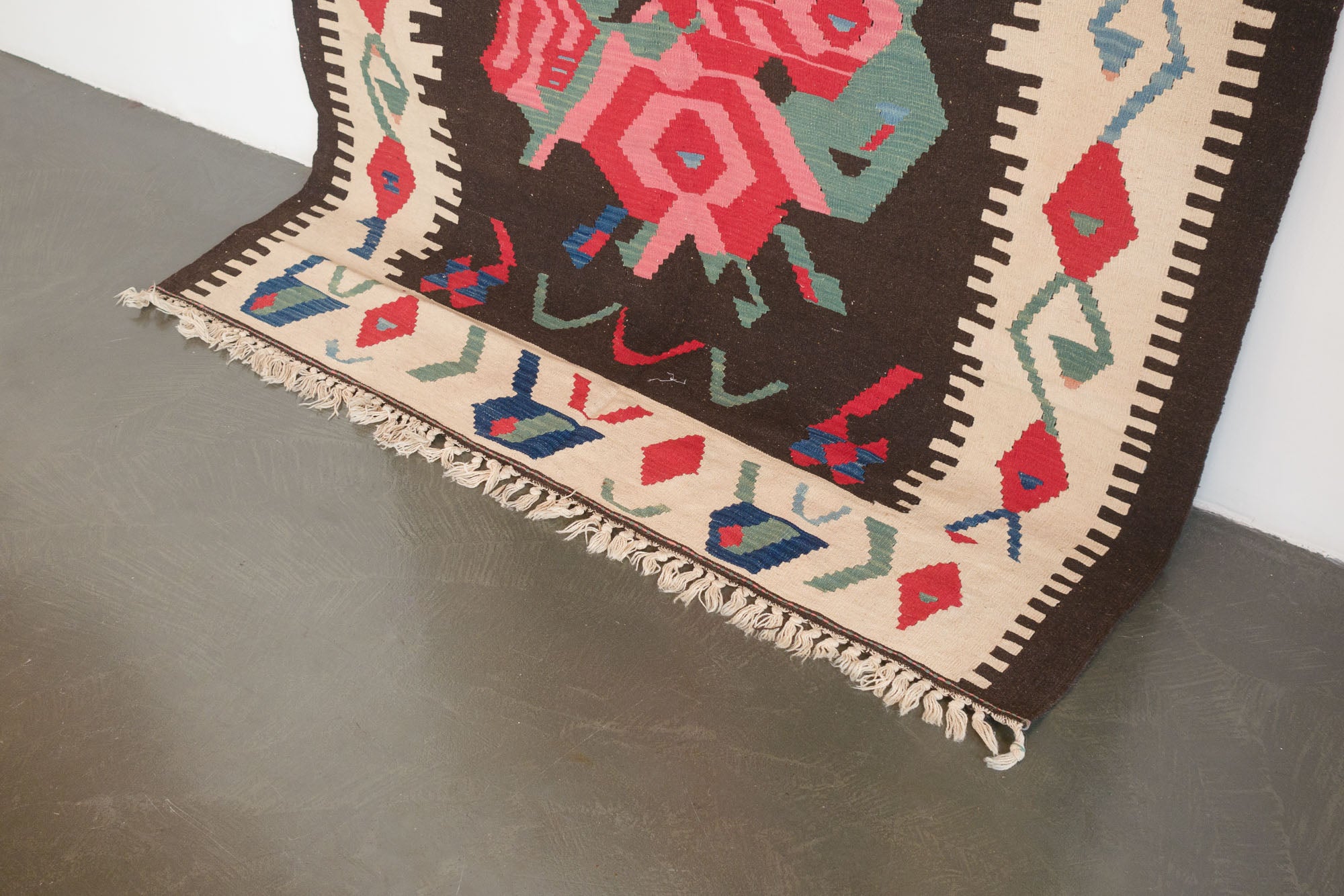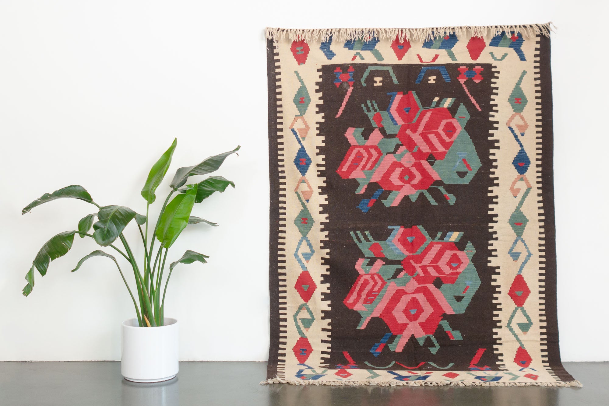 name: Farukhorigin: Afghanistanstyle: Ghafkazi, kilim, rug, carpet, floral, rosesmaterial: hand woven woolcolors: red, blues, black, cream, pink, green age: vintage, 1940-1970condition: good, age related wear - see picturesappraised value: $1676sku: a-431