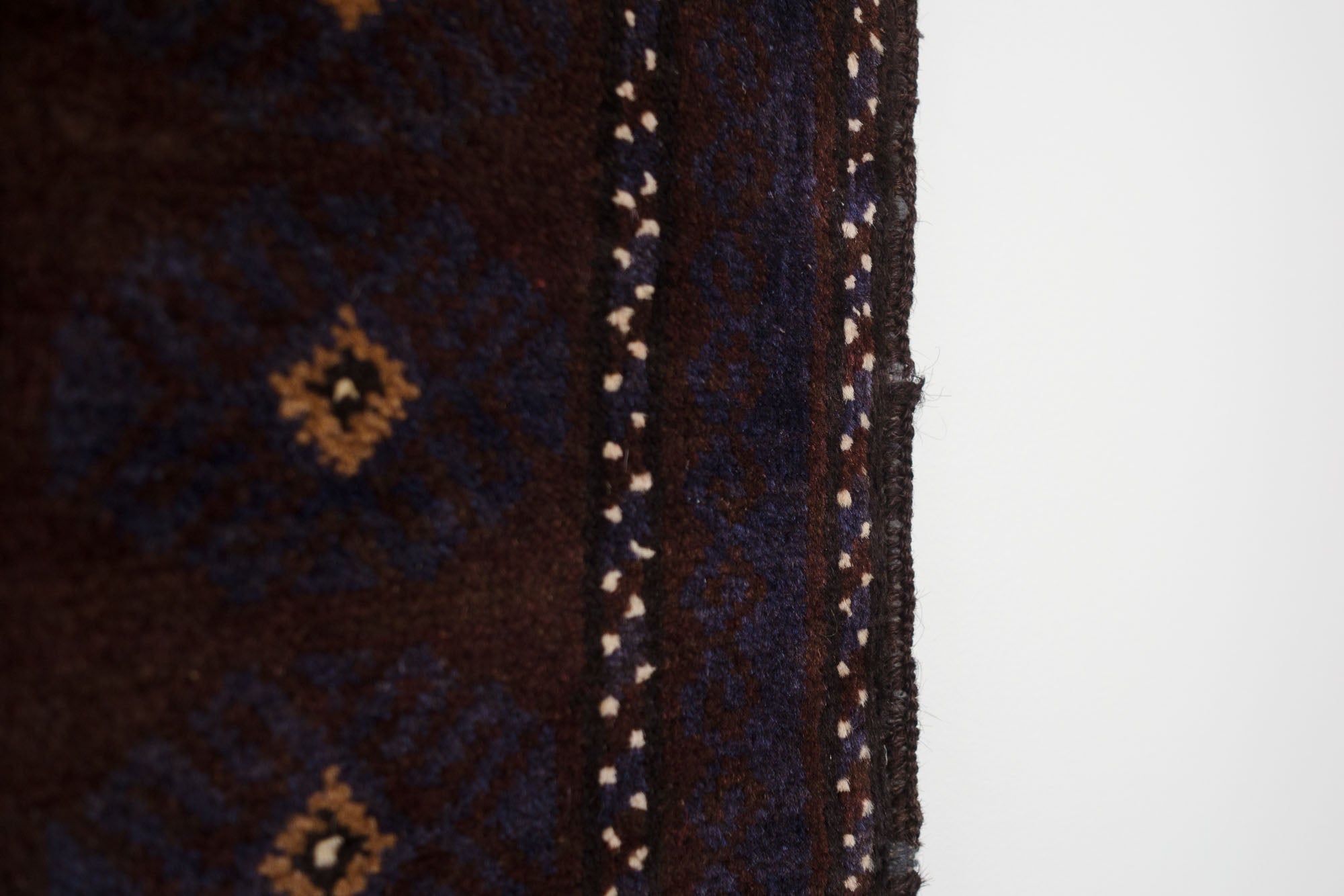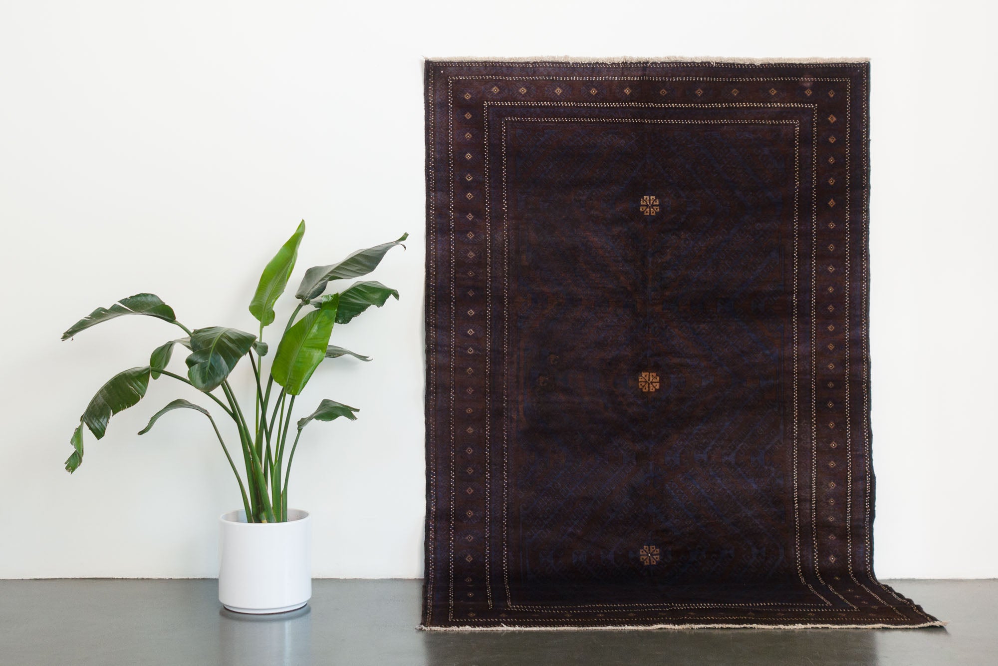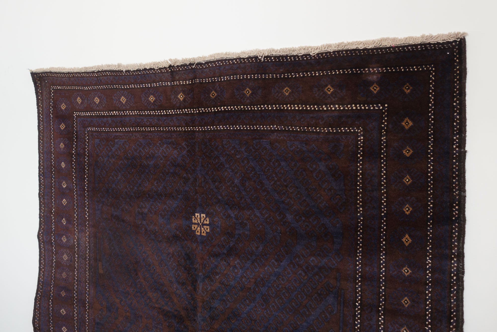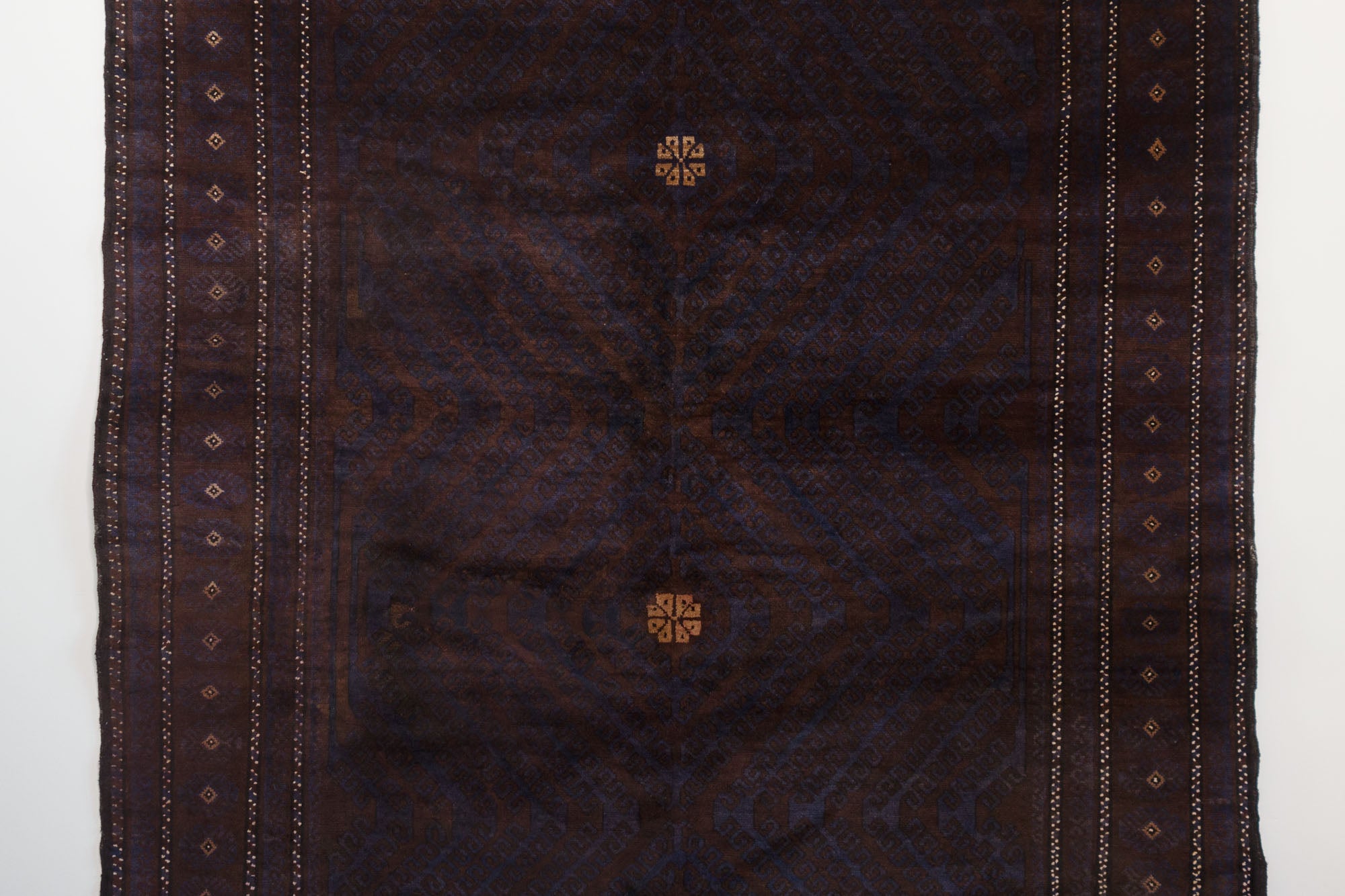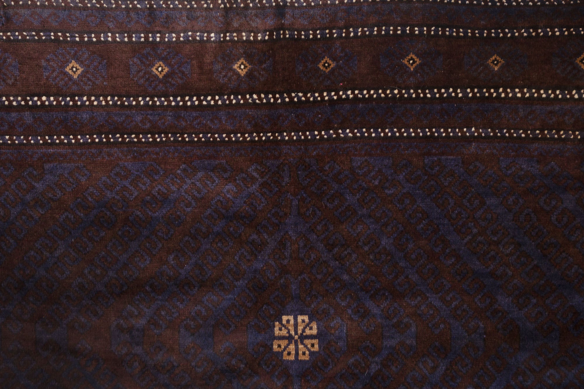 name: Yaganaorigin: Afghanistanstyle: teimani, rug, carpetmaterial: hand knotted woolcolors: purple, navy, cream, brownage: vintage, 1940-1969condition: good, age related wear - see picturesappraised value: $2124