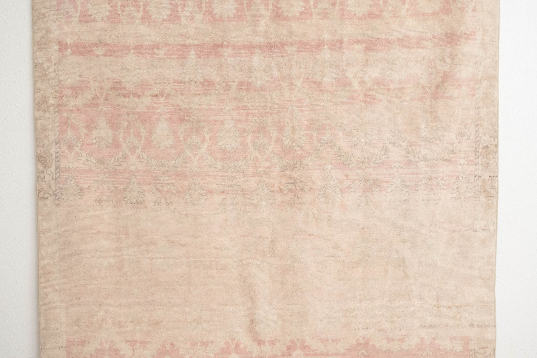 name: Billurstyle: hand knotted, Turkish, Melis, sunwashed, rug, carpetmaterial: woolcolors: pink, cream, camel, tan, gray, blue, violetage: vintage condition: good, age related wear - see pictures