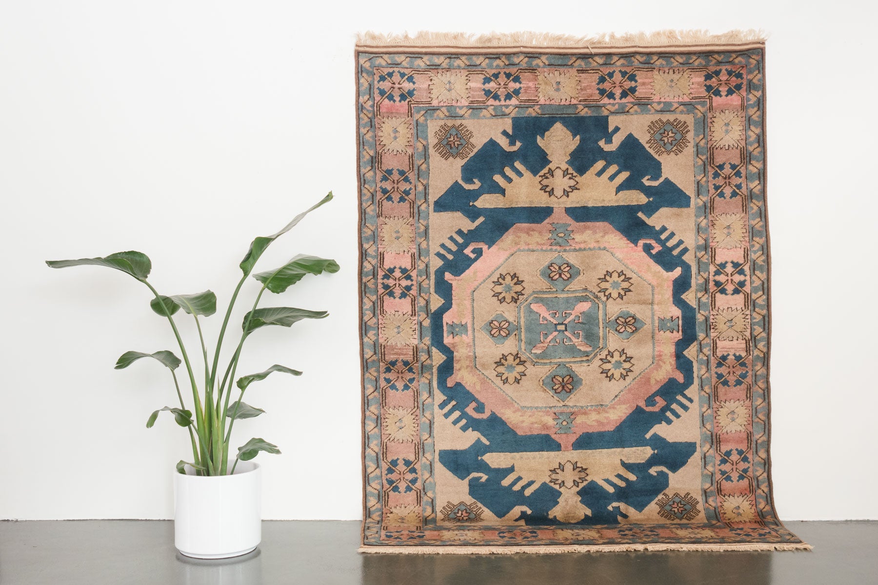 name: Dilaverorigin: Turkey, Shiravan style: rug, carpetmaterial: hand knotted woolcolors: pink, blues, camel, grey, cream age: vintage condition: good, age related wear - see pictures