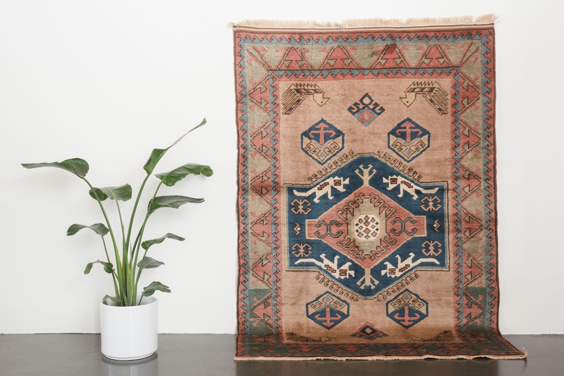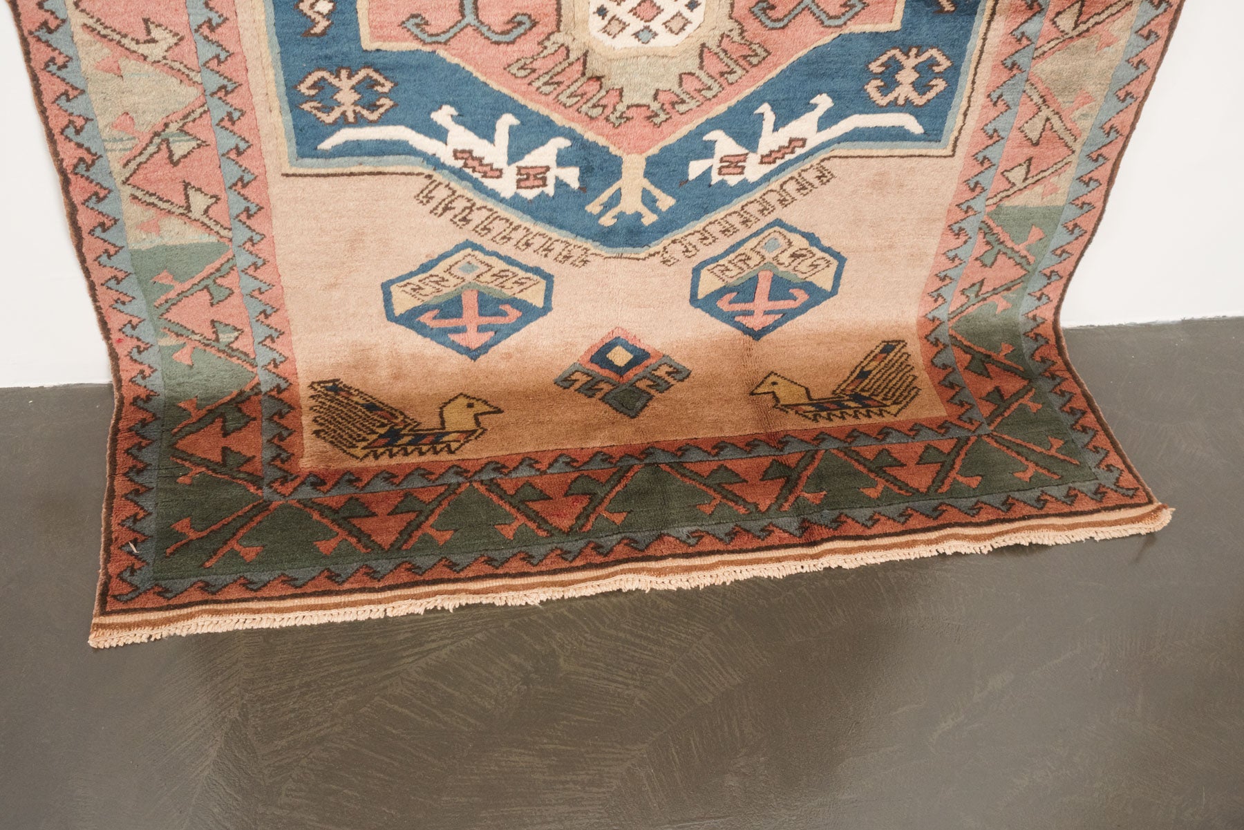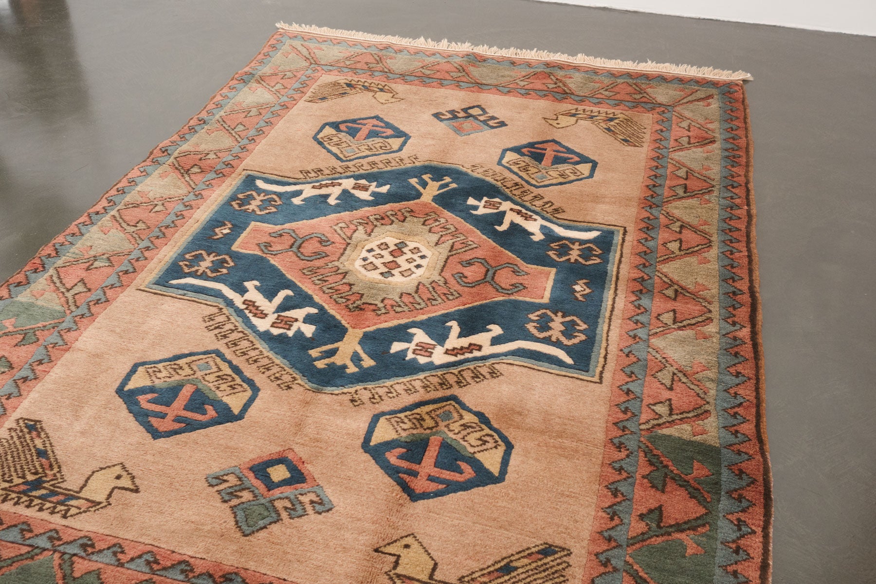 name: Elaorigin: Turkey, Shiravanstyle: rug, carpetmaterial: hand knotted woolcolors: red, salmon, blues, lt green, brown, camel, cream age: vintage condition: good, age related wear - see pictures