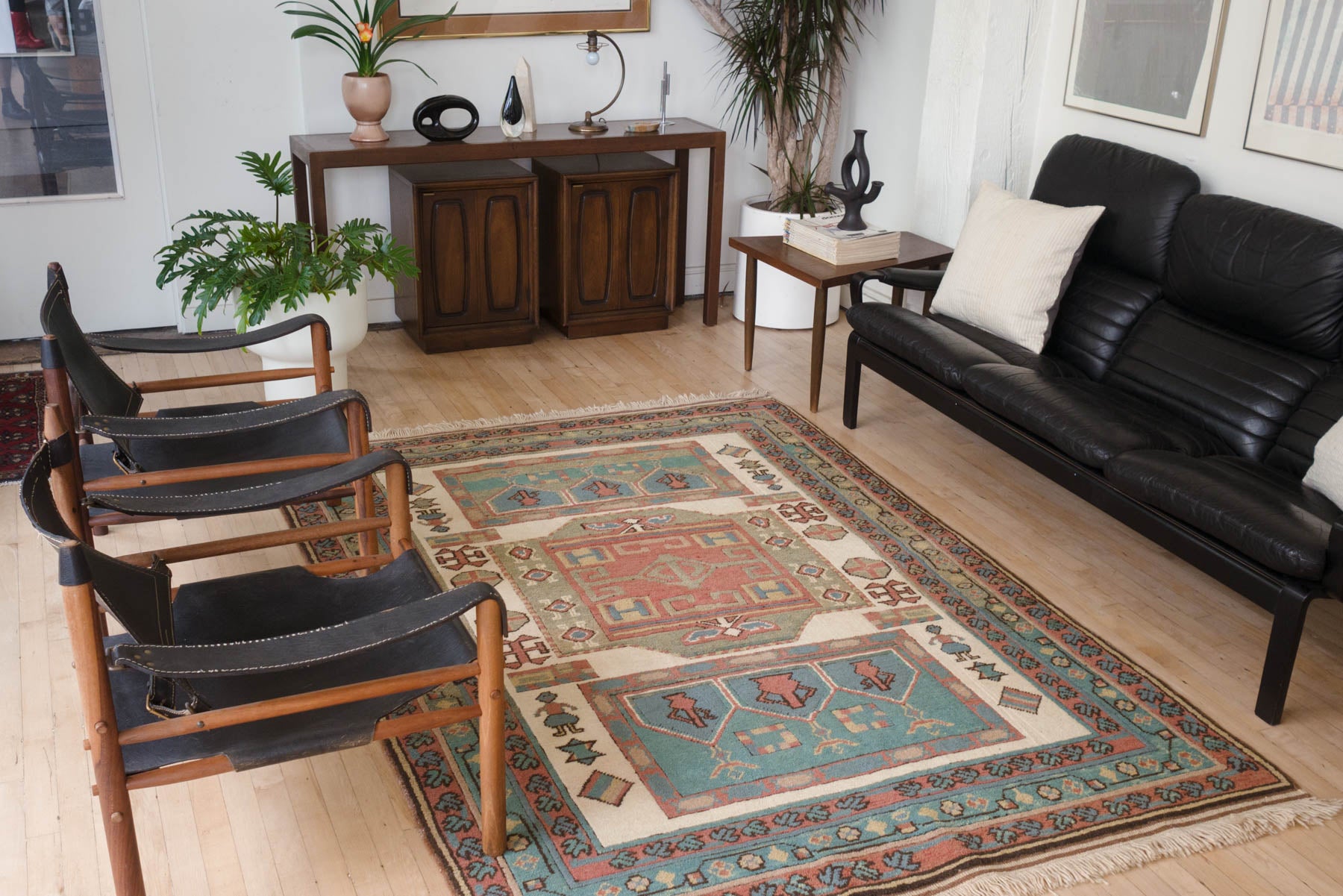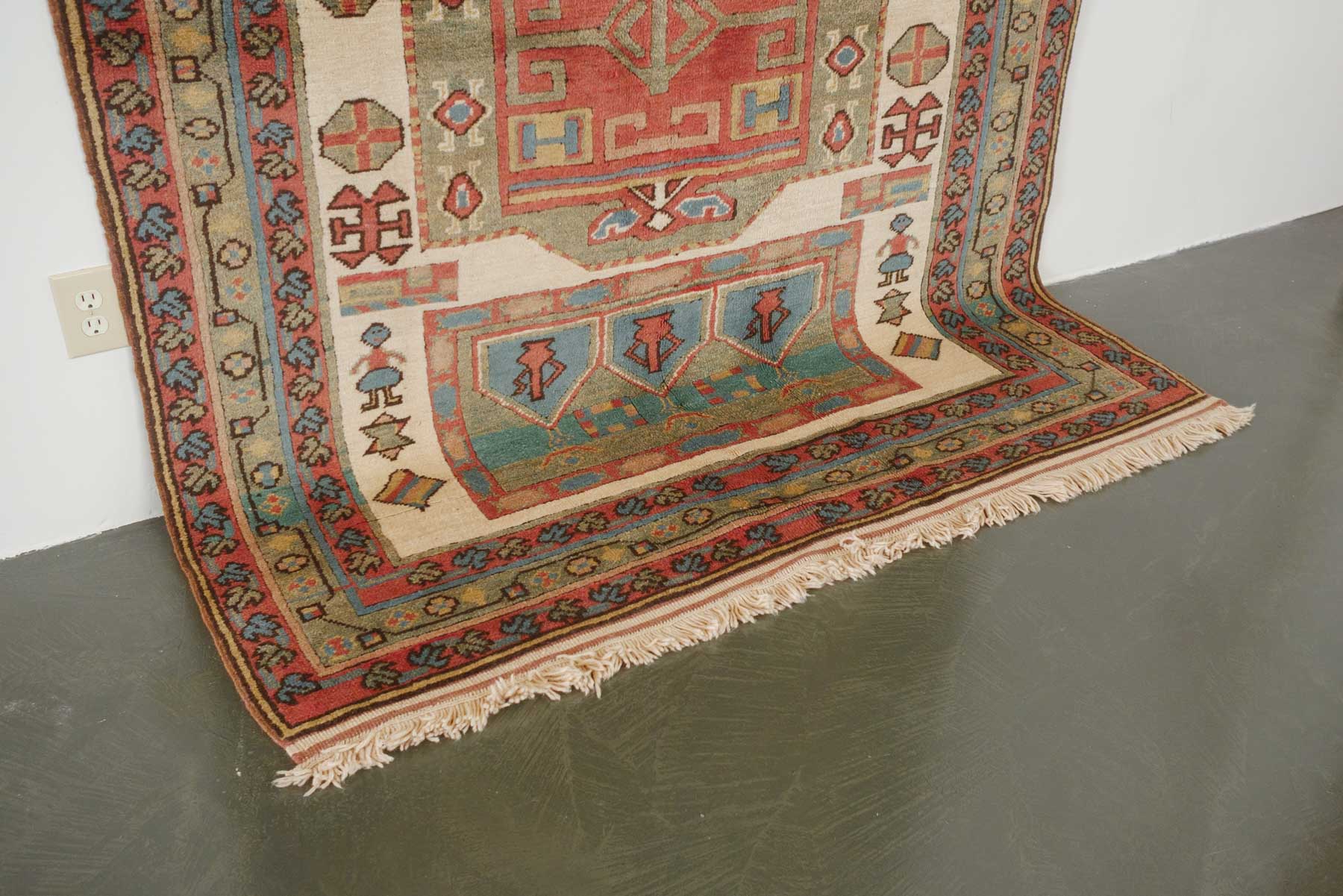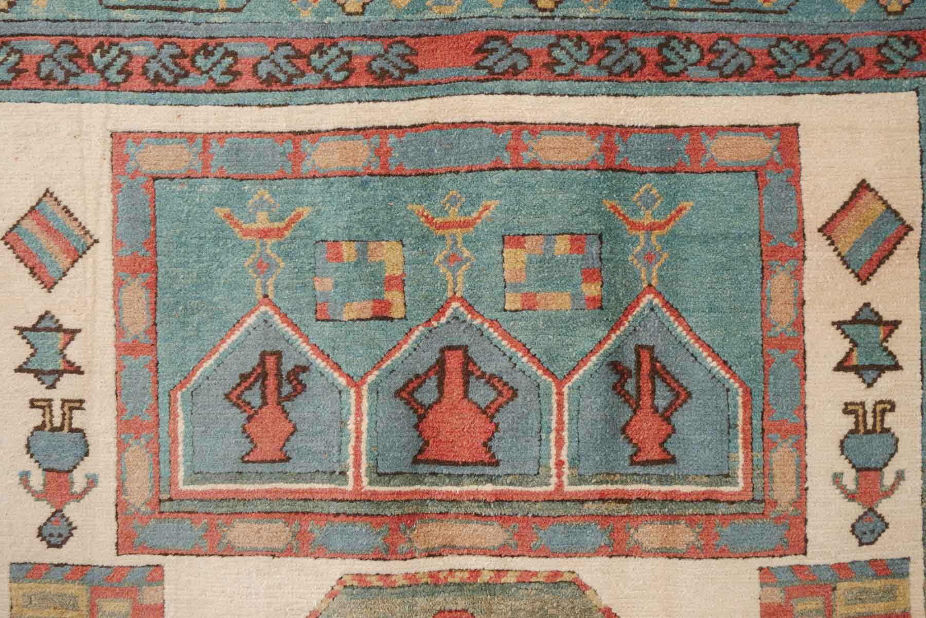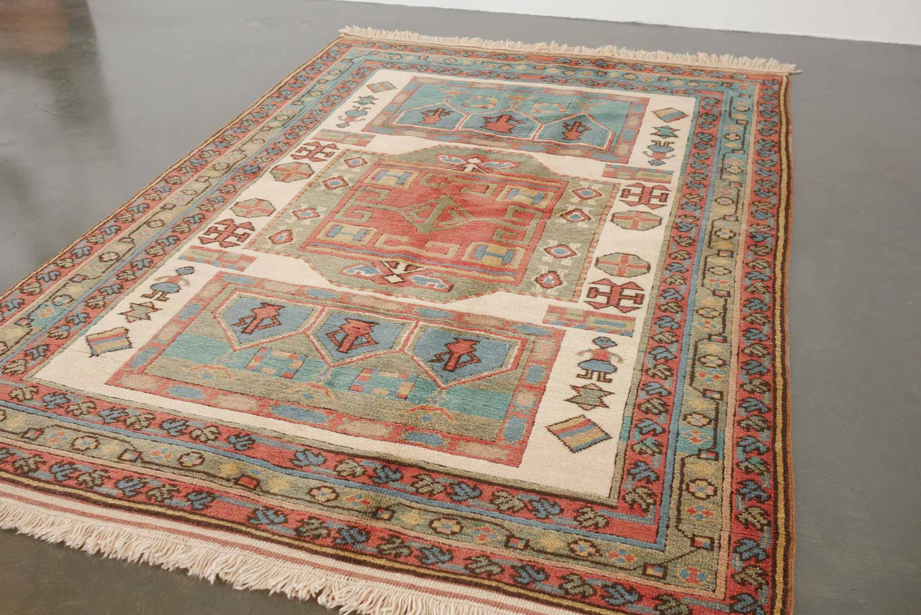 name: Ertanorigin: Turkey, Shiravanstyle: rug, carpet material: hand knotted woolcolors: red, blue, camel, black, creamage: vintage condition: good, age related wear - see pictures
