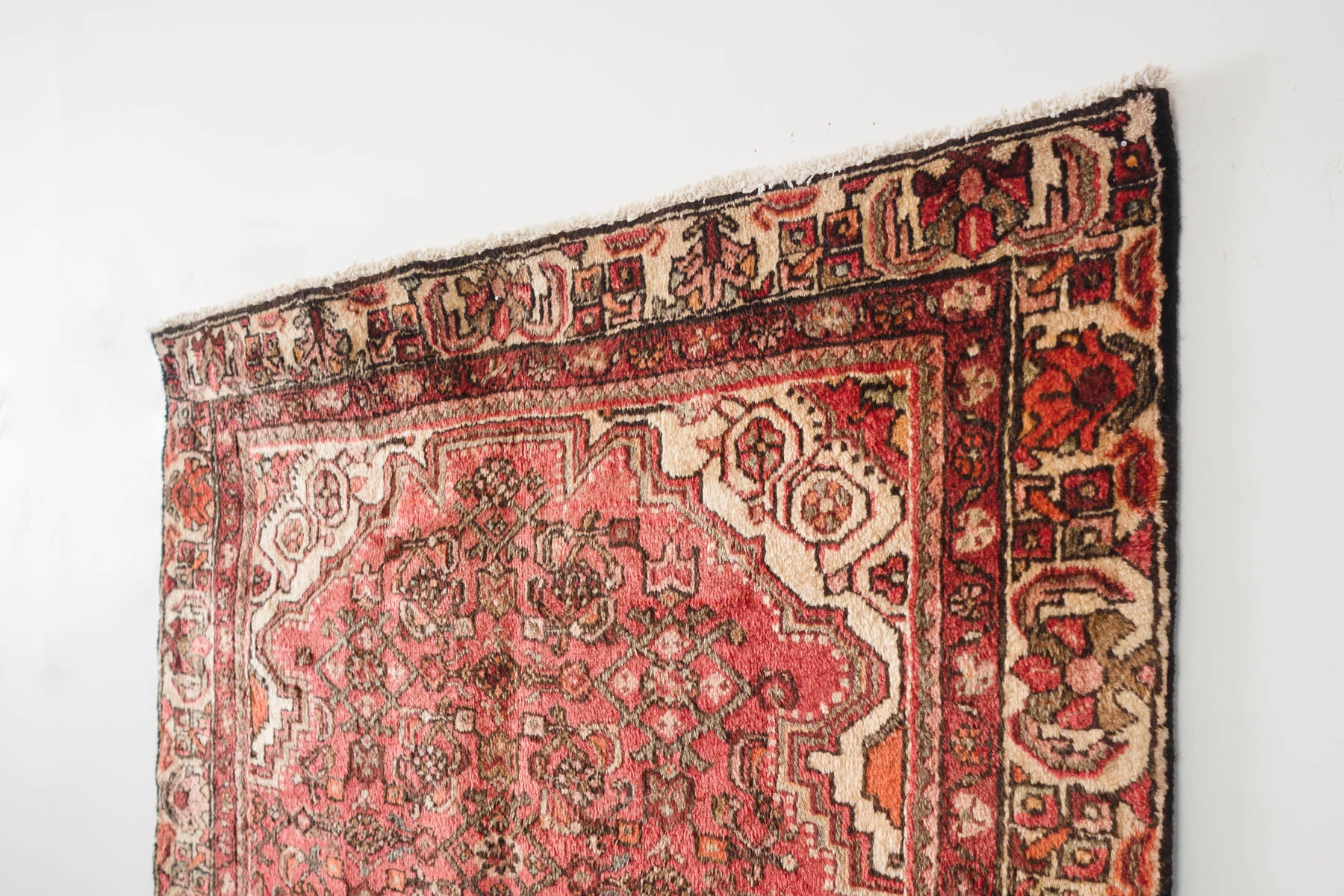 name: Salmakorigin: Iran (Persian)style: rug, carpet material: hand knotted woolcolors: red, cream, browns, orange, green, pinkage: vintage, 1940-1970condition: good, age related wear - see picturesappraised value: $2,62858" x 90"(closest standard rug size is 5x7.5)Free domestic shipping on all rugs.Contact us for an international shipping quote.