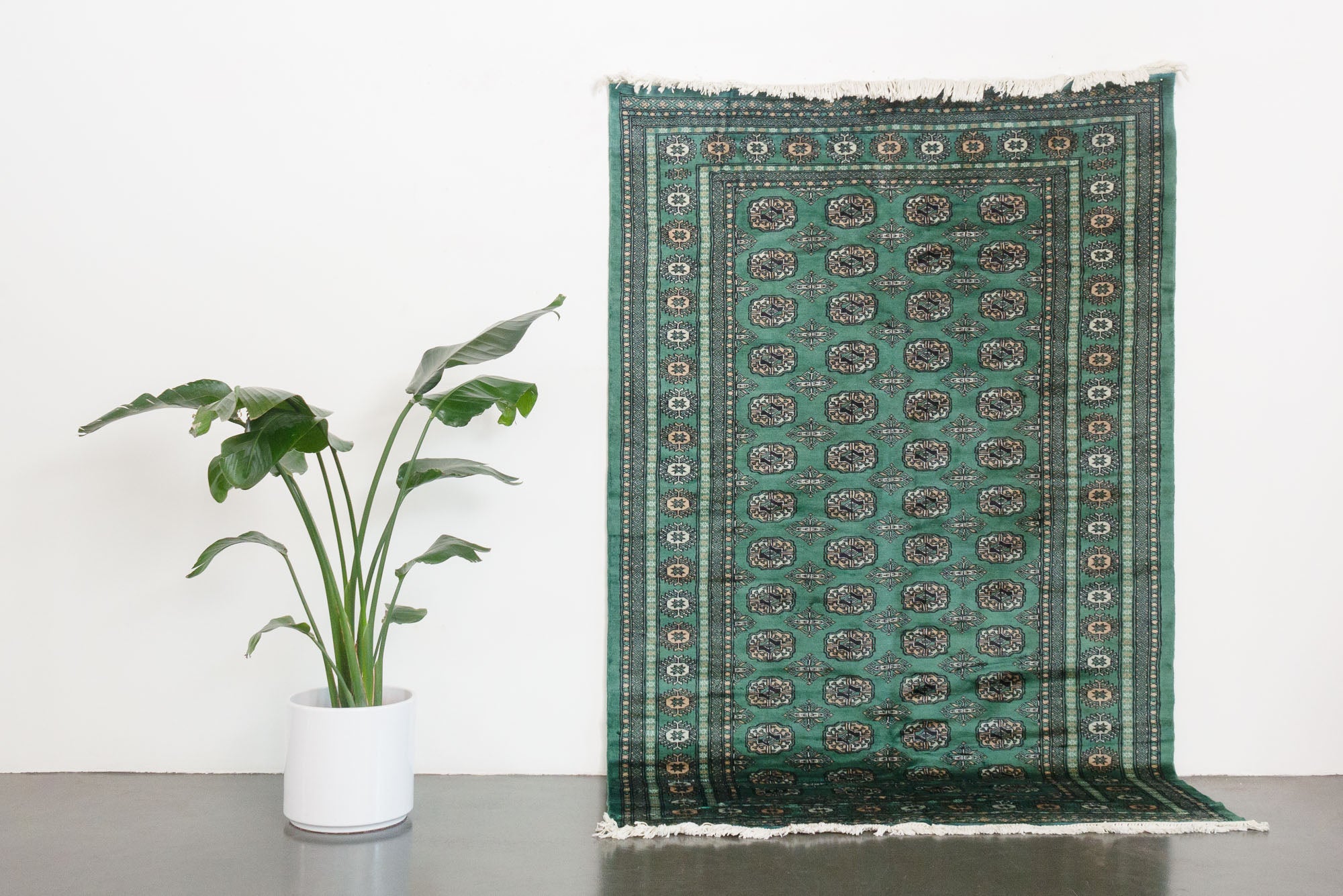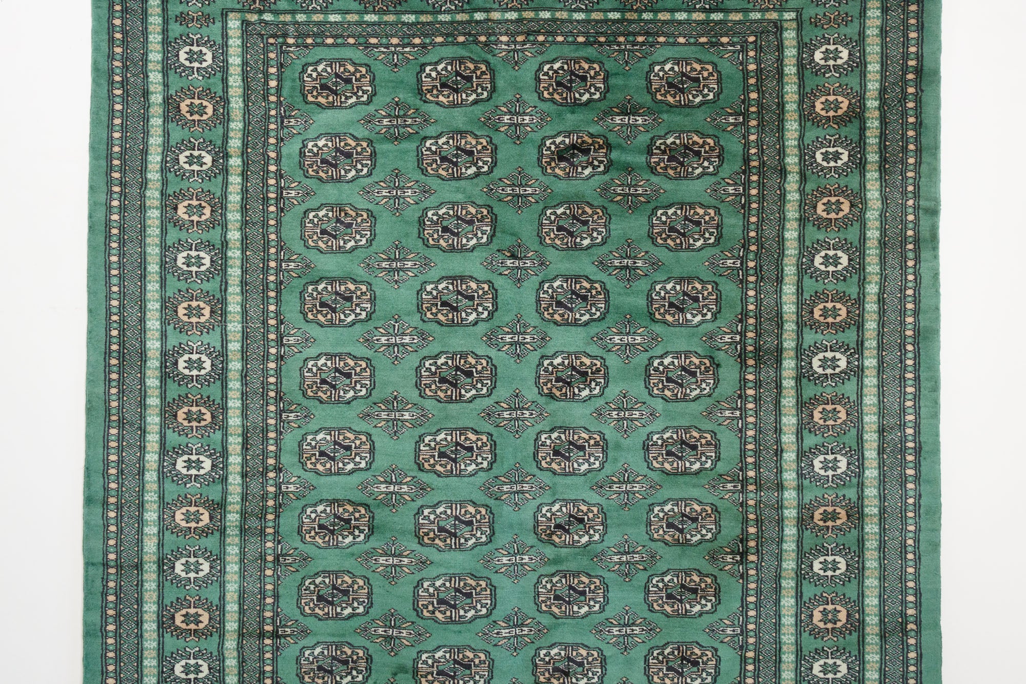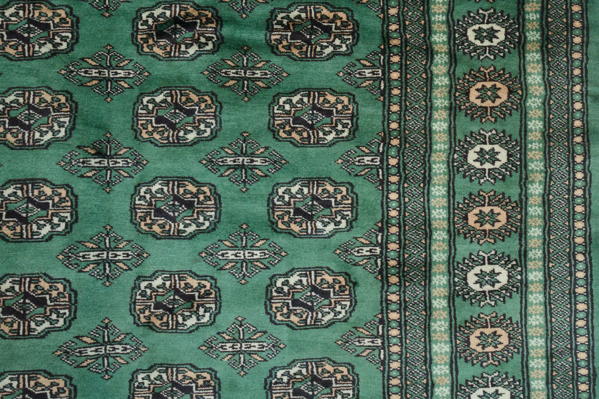 name: Kafiorigin: Pakistan, Peshawar, Bokhara style: rug, carpetmaterial: hand knotted woolcolors: greens, black, camel, creamage: vintagecondition: good, age related wear - see picturesappraised value: $1,748