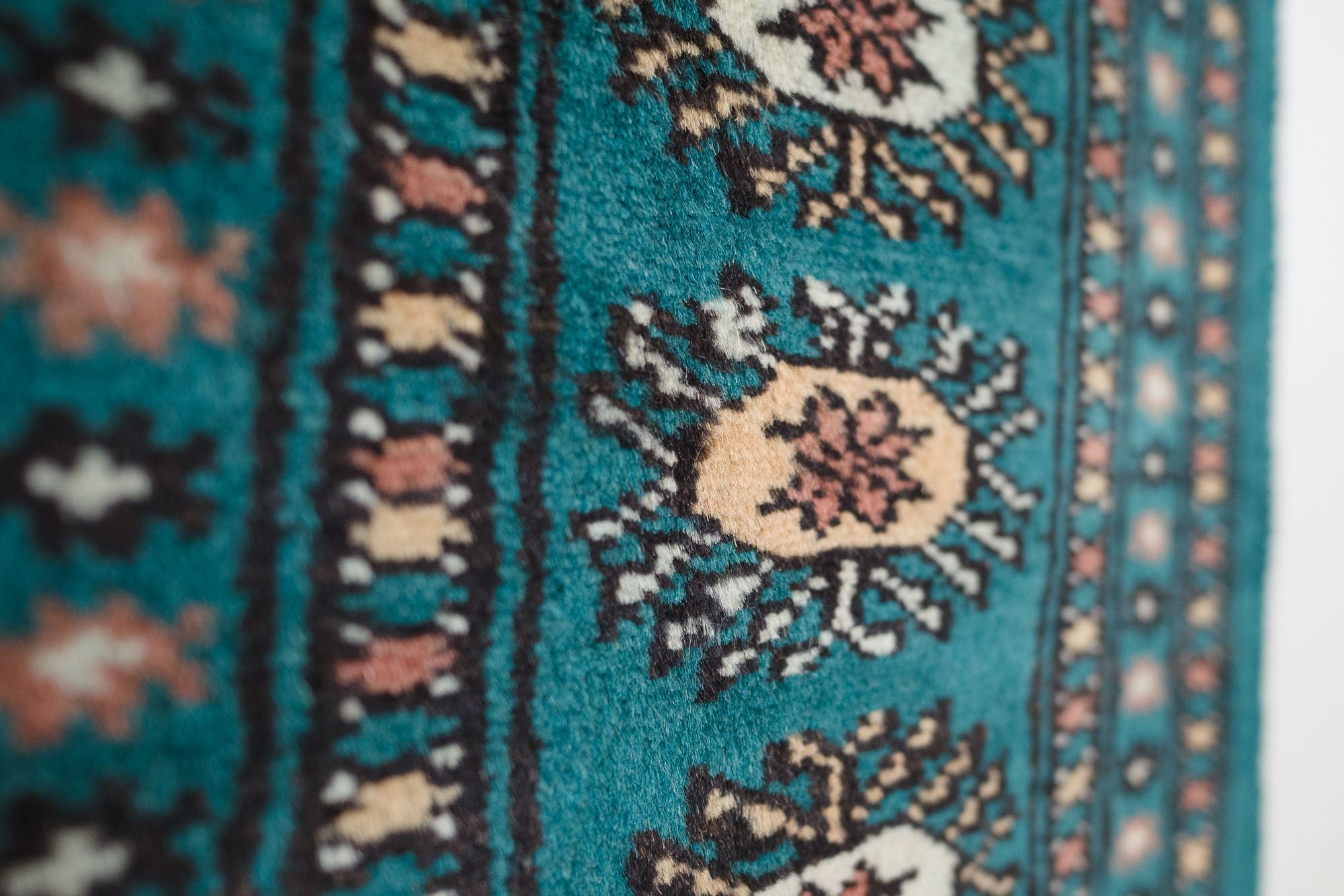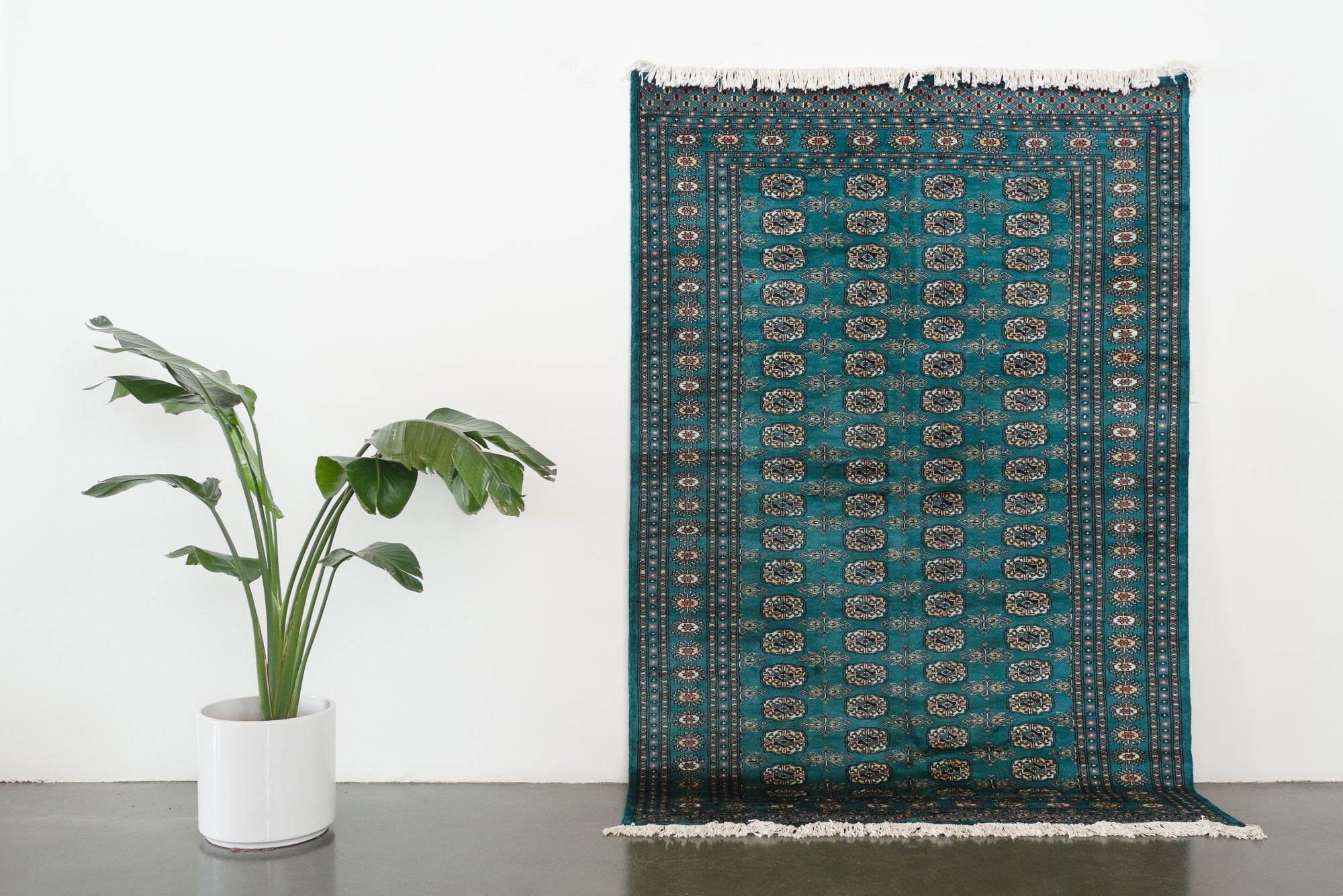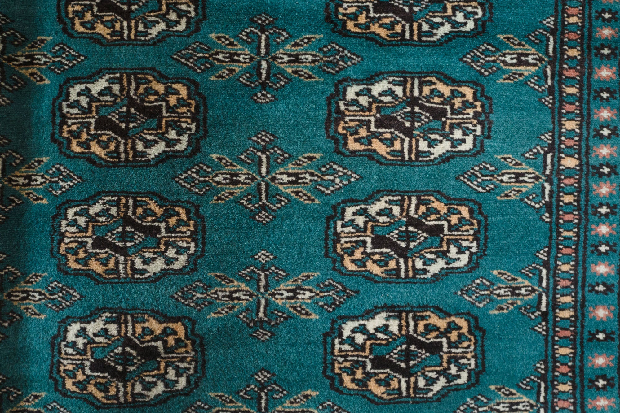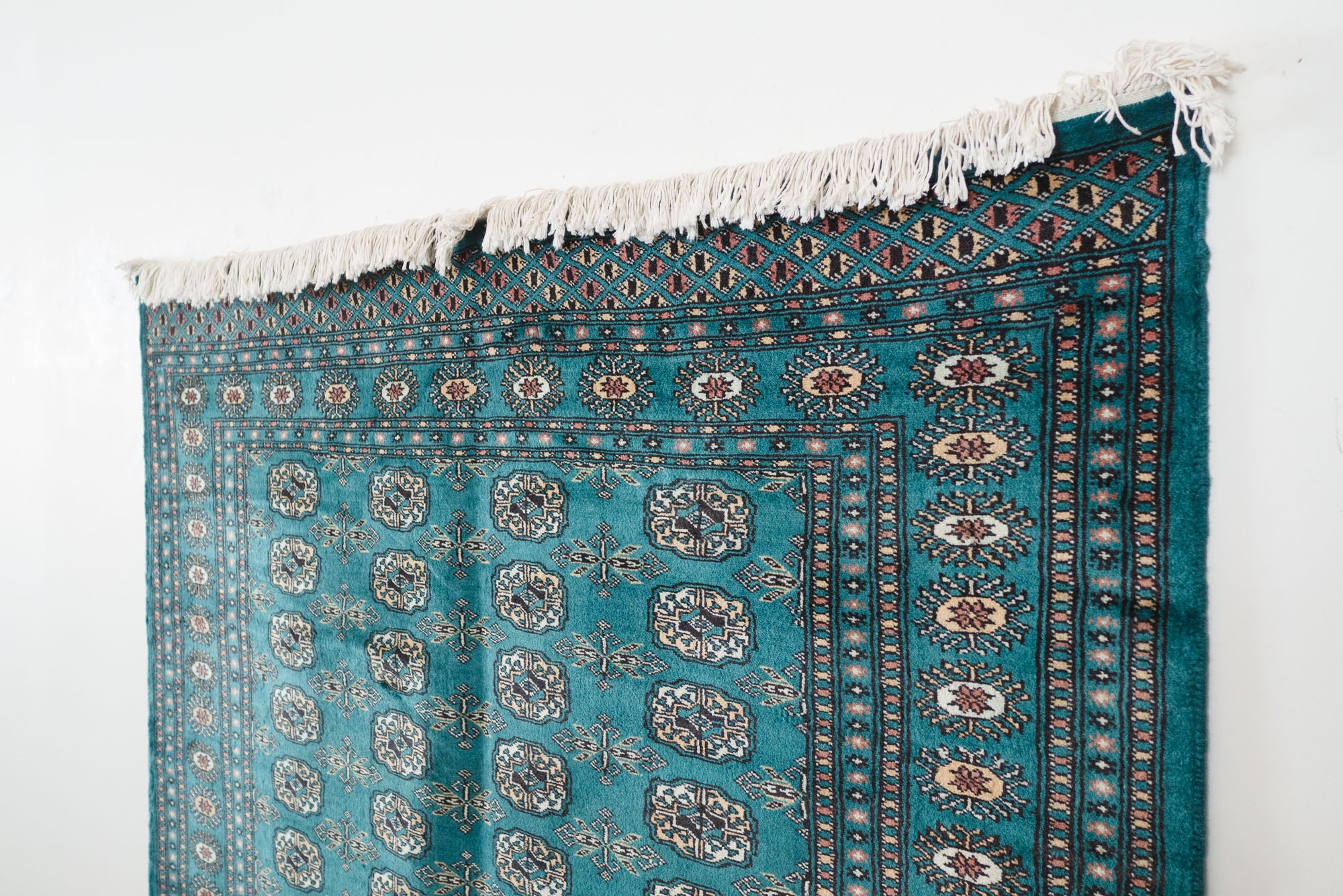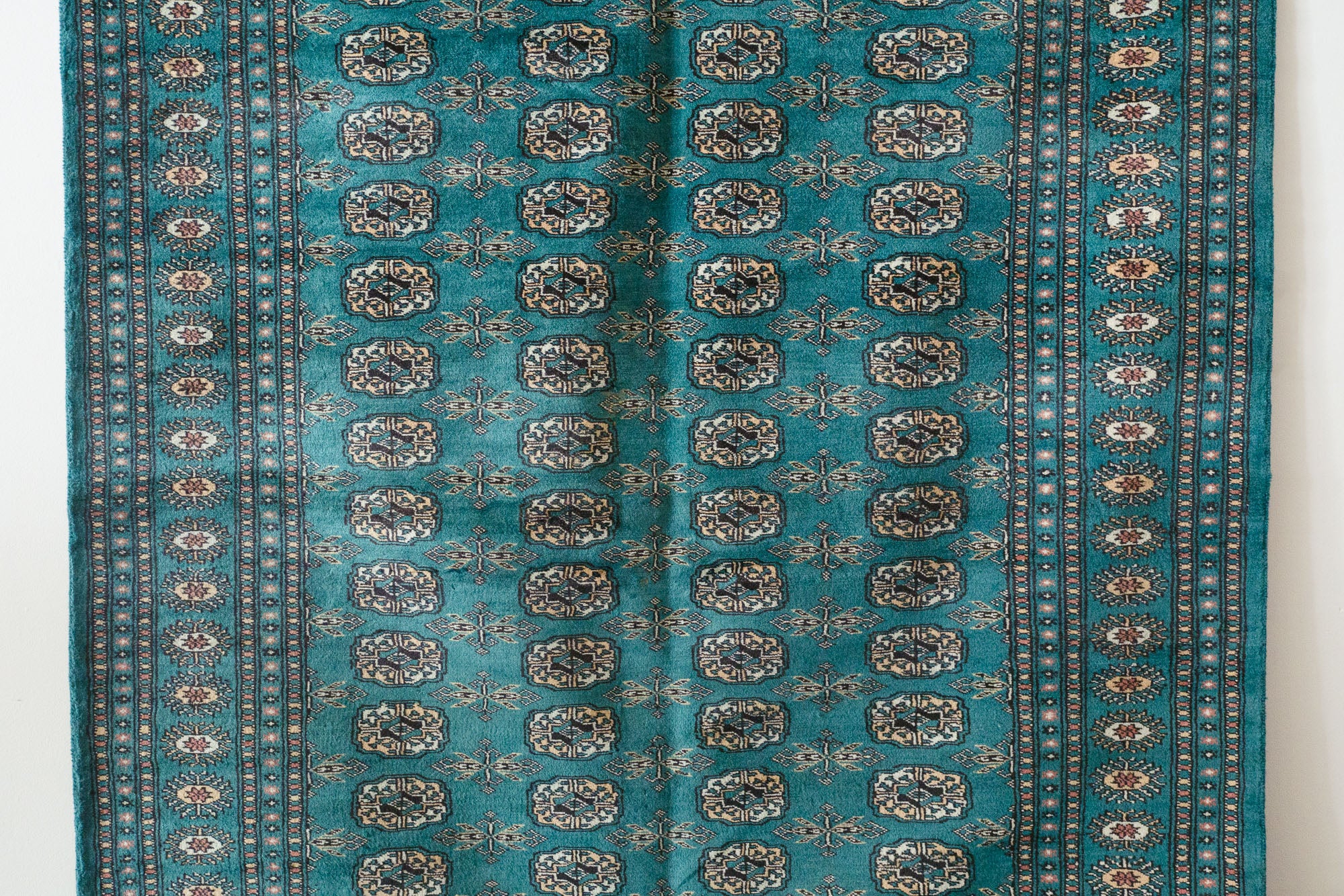 name: Kiranorigin: Pakistanstyle: peshawar bokhara, rug, carpetmaterial: hand knotted woolcolors: green, black, red, peach, creamage: vintage, 1940-1970condition: good, age related wear - see picturesappraised value: $1760sku: pk-224