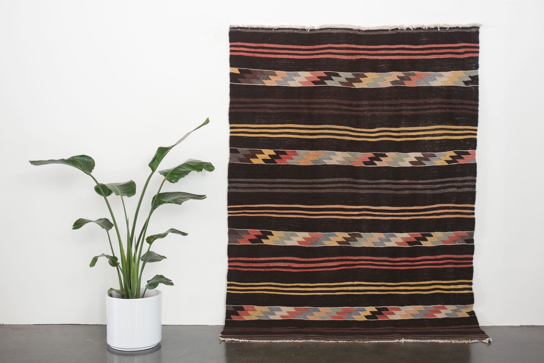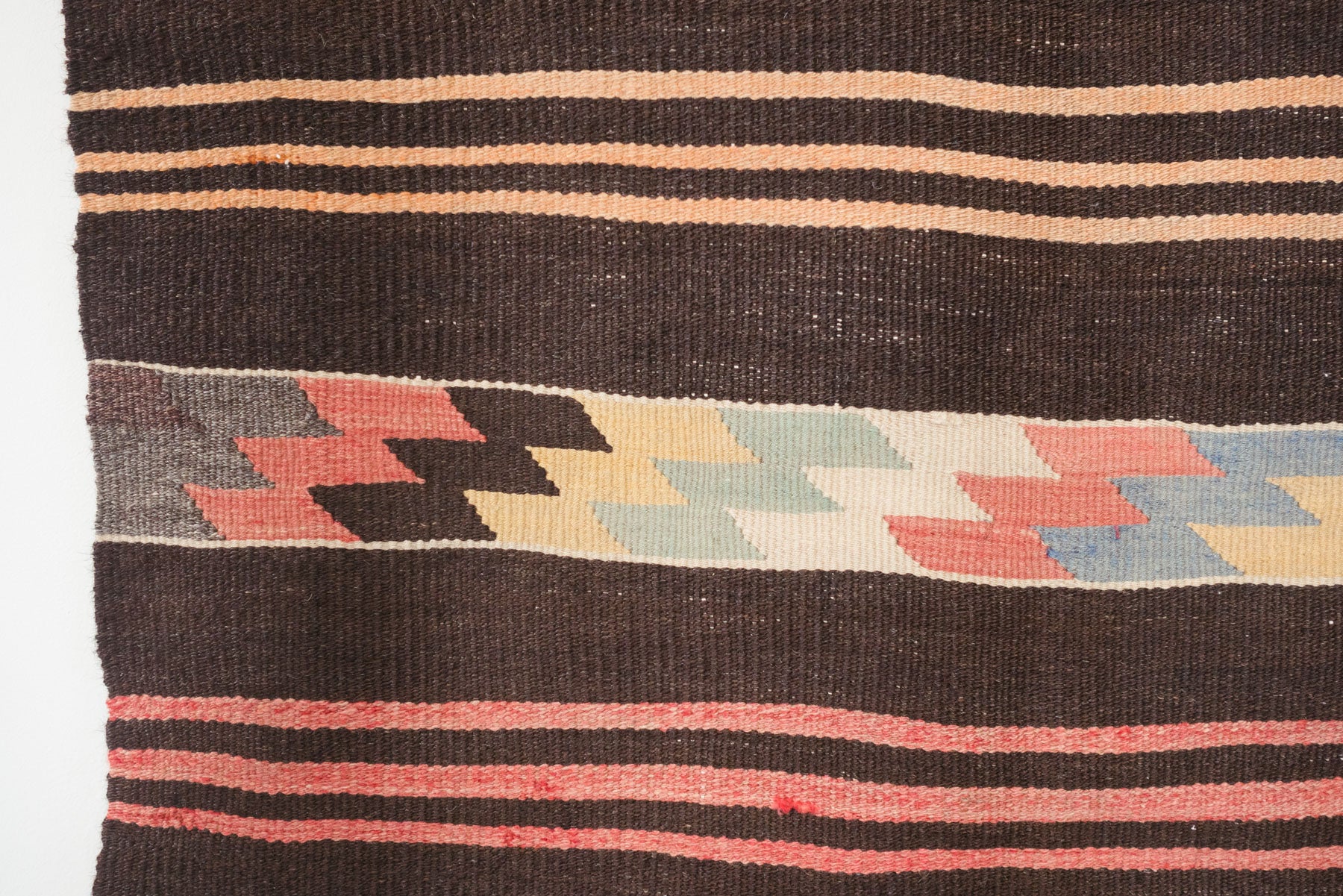 name: ErmanOrigin: Turkeystyle: kilim, rug, carpetmaterial: hand woven woolcolors: red, pink, yellow, blue, gray, black, brownage: vintage condition: good, age related wear - see picturessku: t-289