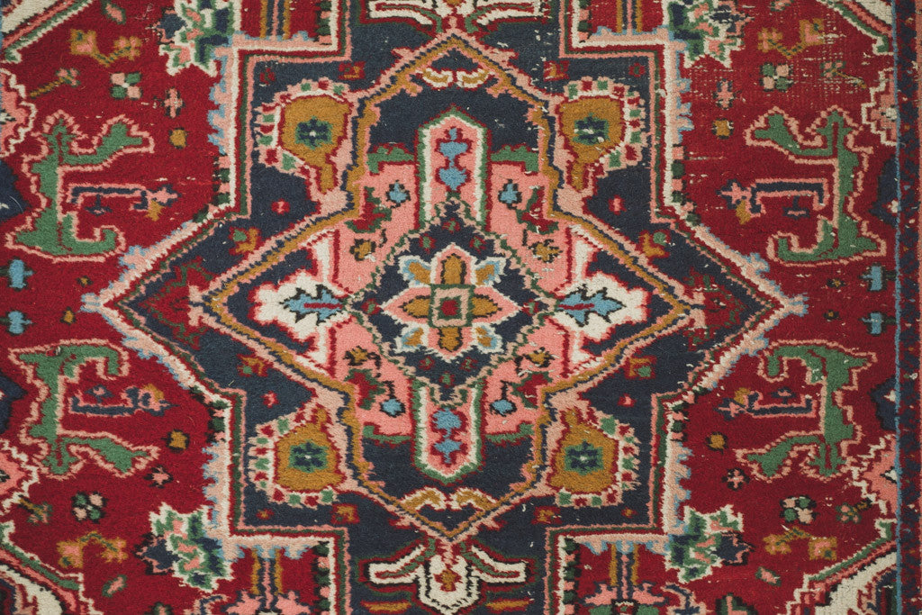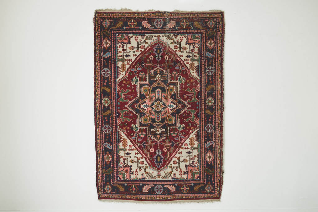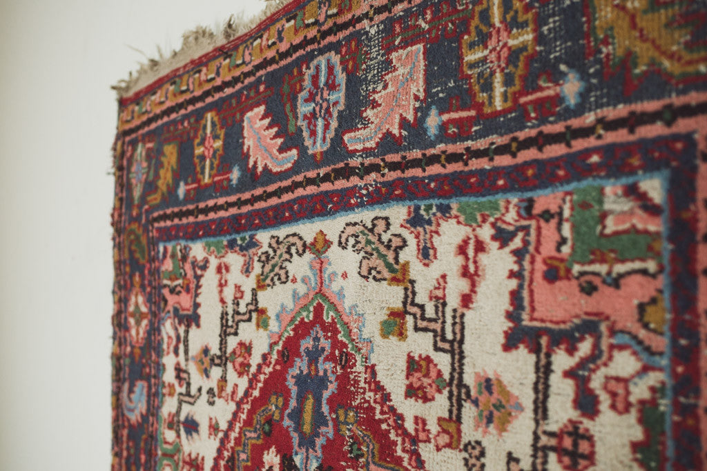 This vintage Persian hand-knotted wool rug has a red, white and navy base with pink, green, light blue, gold and black accents. It's in good overall shape with age related wear. See pictures for detailed condition.