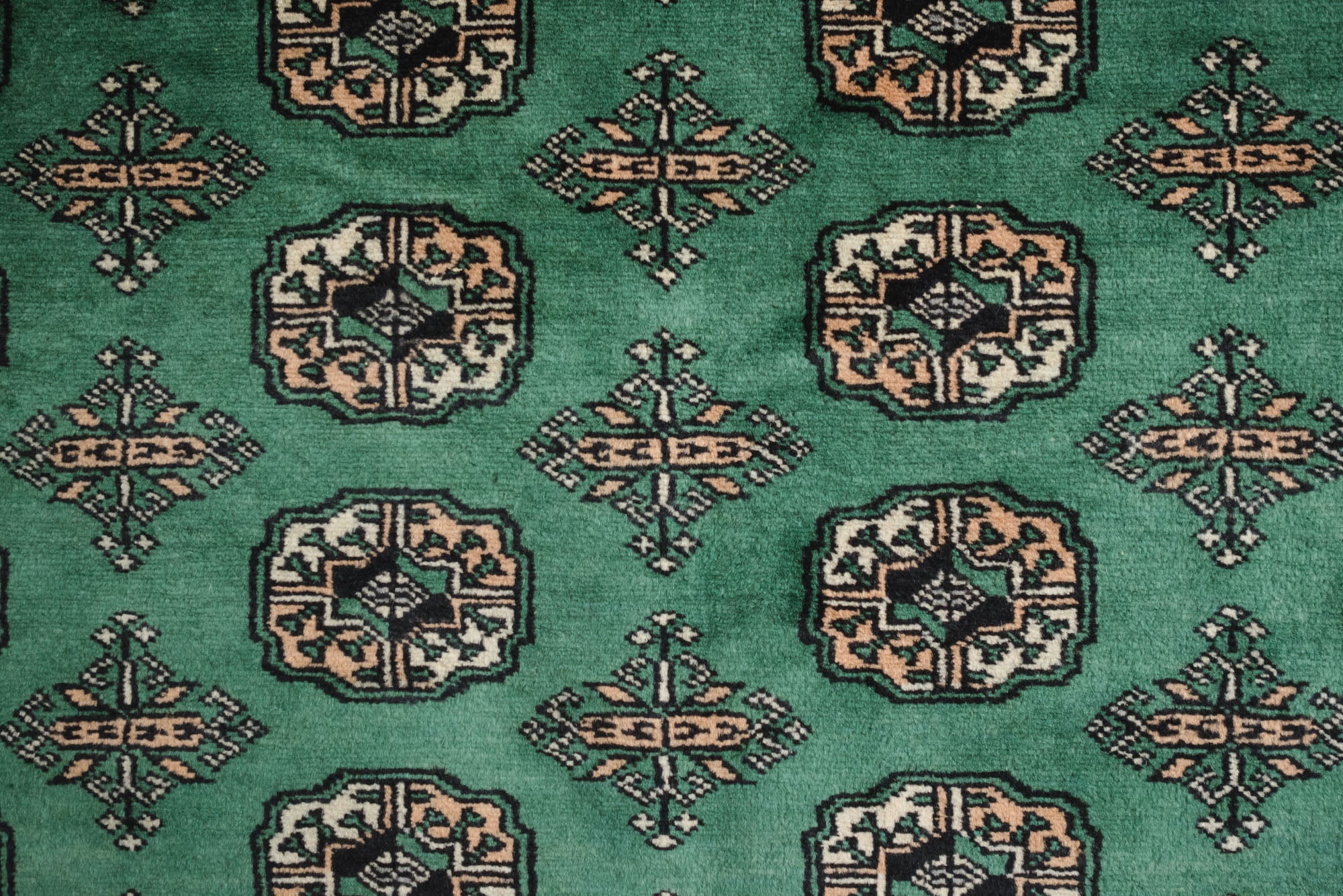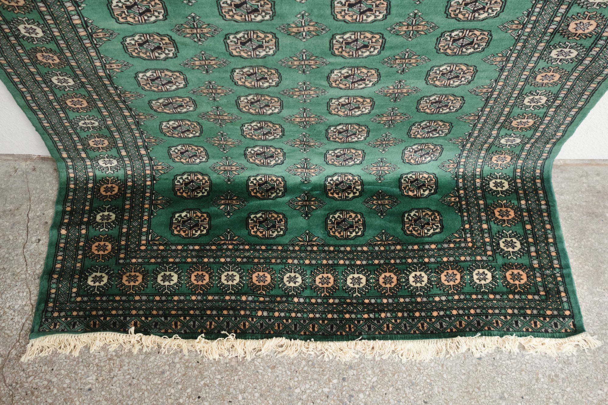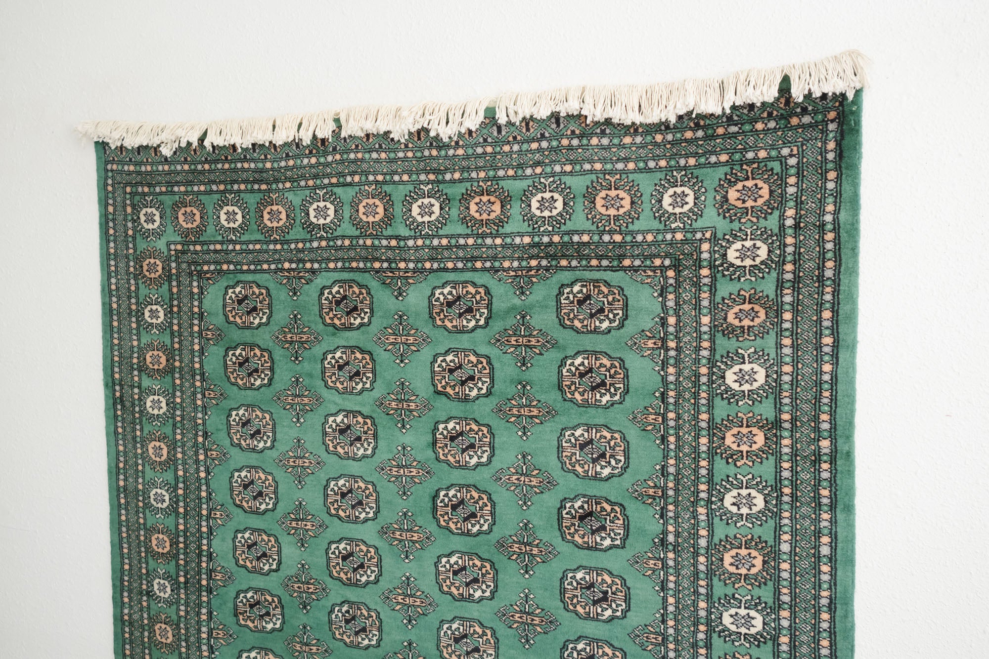 name: Bazishstyle: hand knotted, Pakistani, Peshawar, Bokhara, rug, carpetmaterial: woolcolors: green, gray, cream, tan, blackage: vintage condition: good, age related wear - see pictures