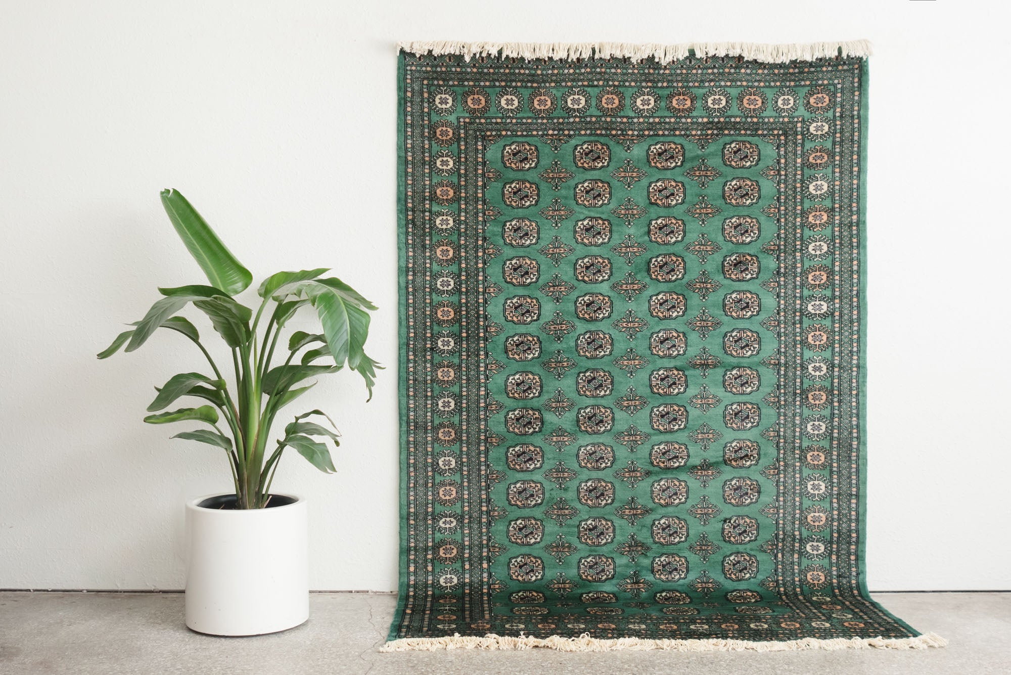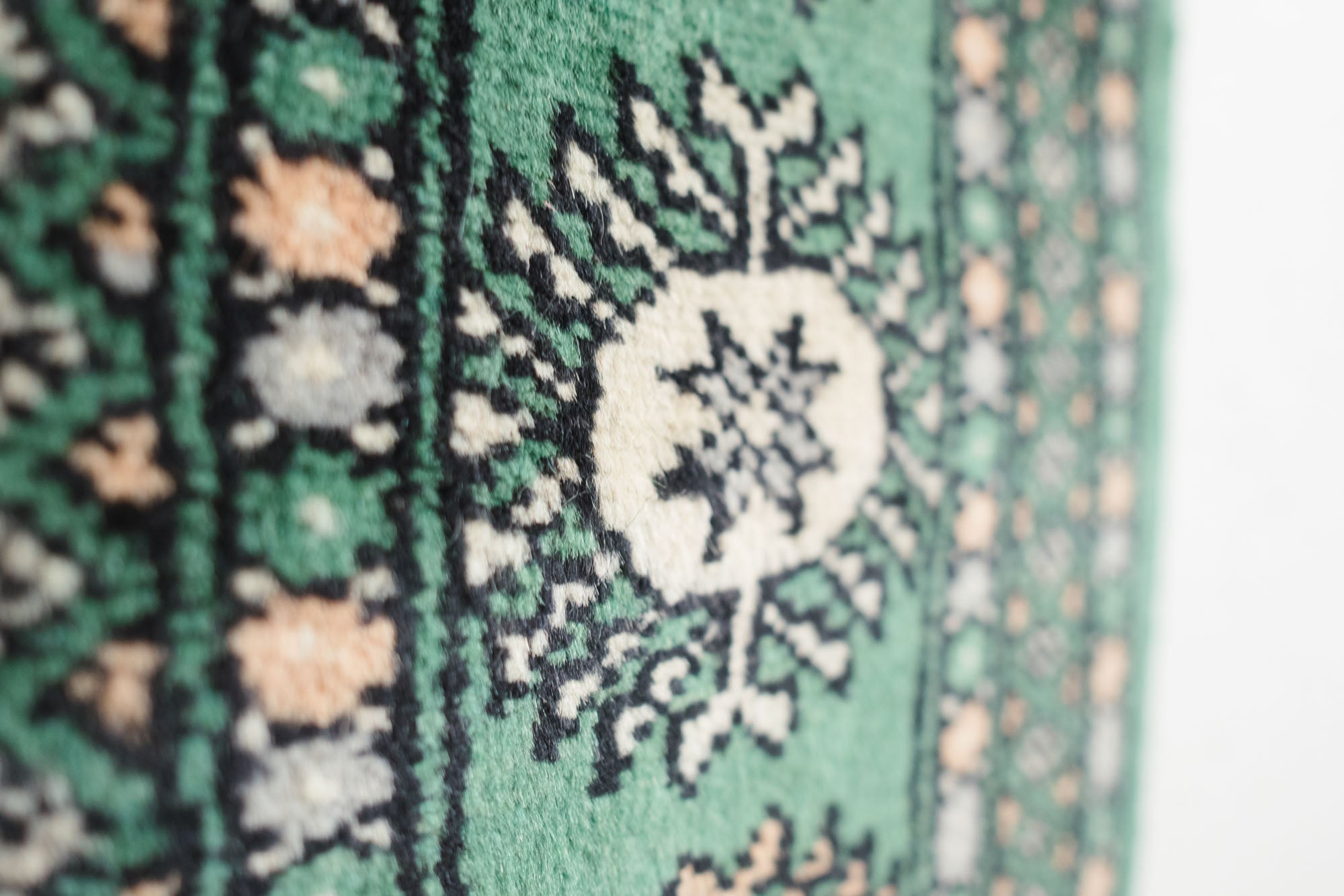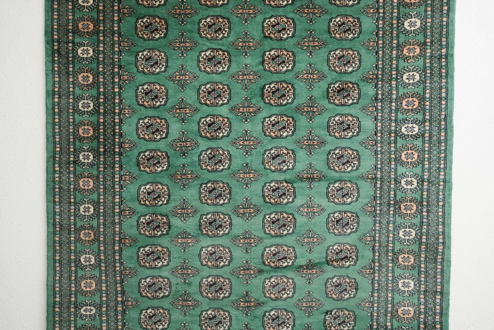 name: Bazishstyle: hand knotted, Pakistani, Peshawar, Bokhara, rug, carpetmaterial: woolcolors: green, gray, cream, tan, blackage: vintage condition: good, age related wear - see pictures