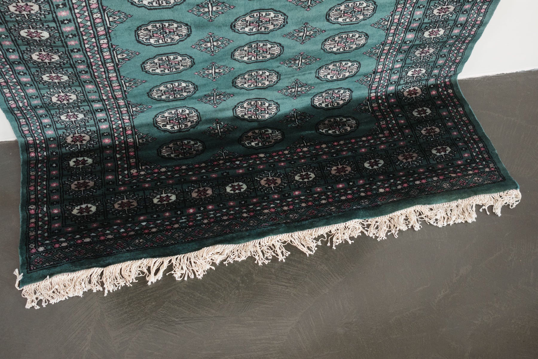 name: Dahbalstyle: hand knotted, Pakistani, Peshawar, Bokhara, rug, carpetmaterial: woolcolors: green/teal, black, cream, pink, mauve, grayage: newcondition: good, age related wear - see pictures