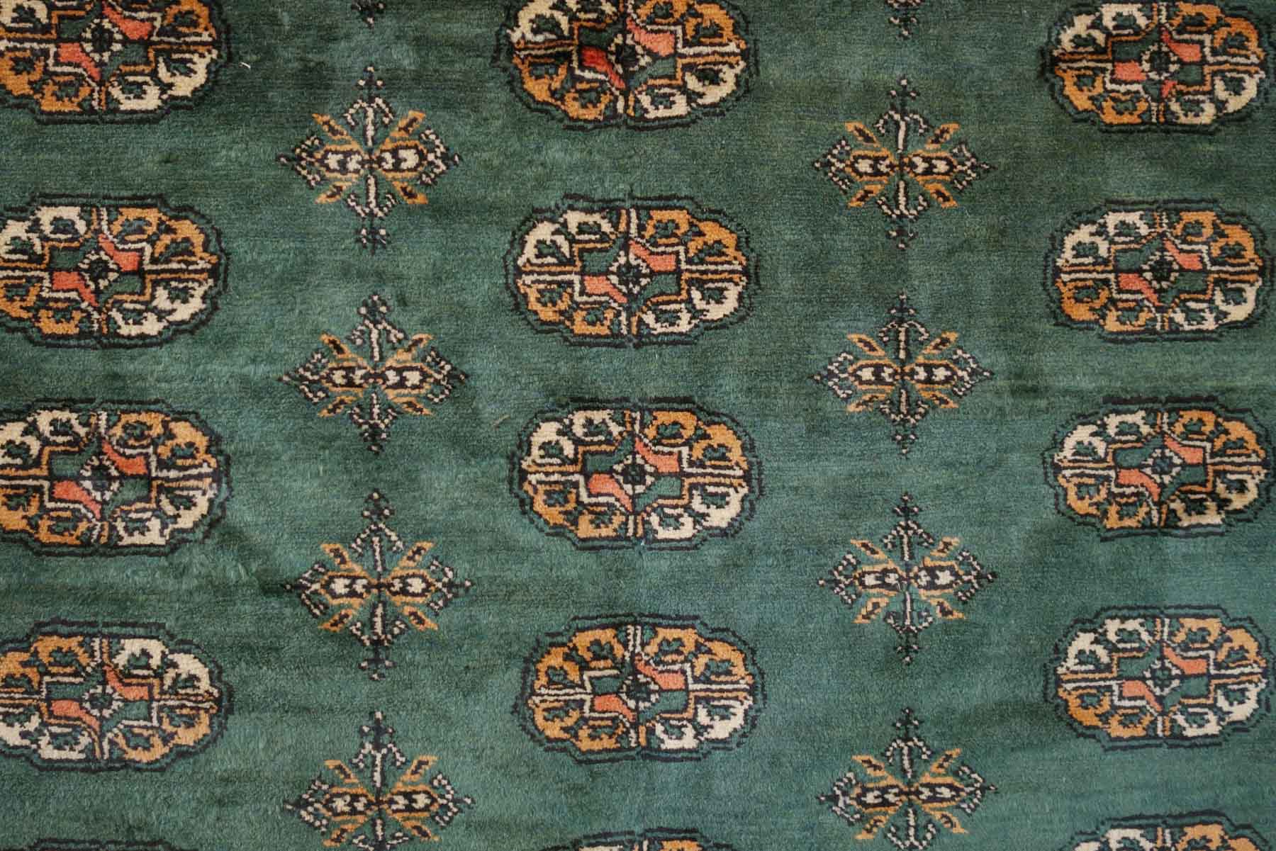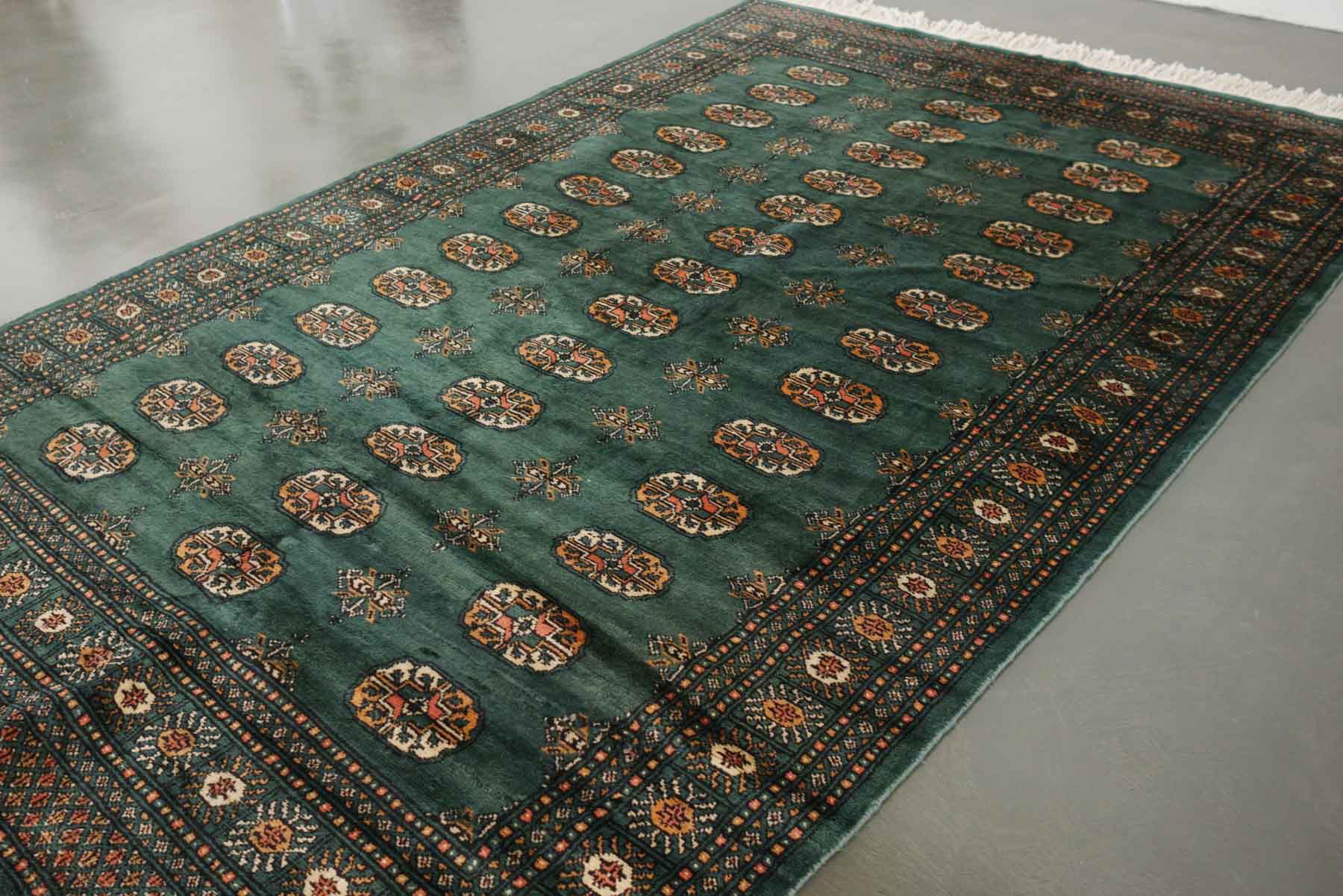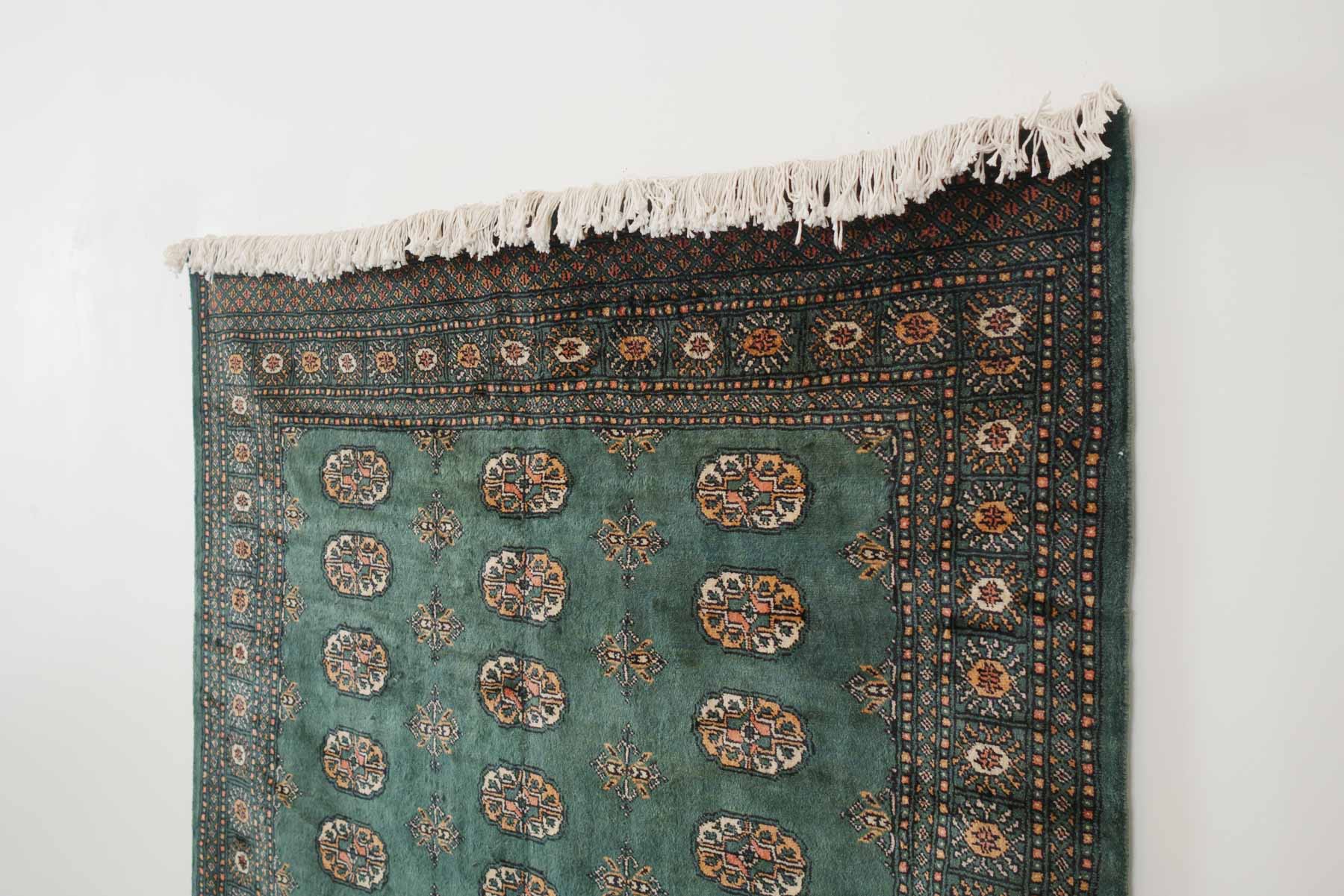 name: Daudistyle: hand knotted, Pakistani, rug, carpet material: woolcolors: green, tan, beige, sienna age: vintage condition: good, age related wear / small hole - see pictures