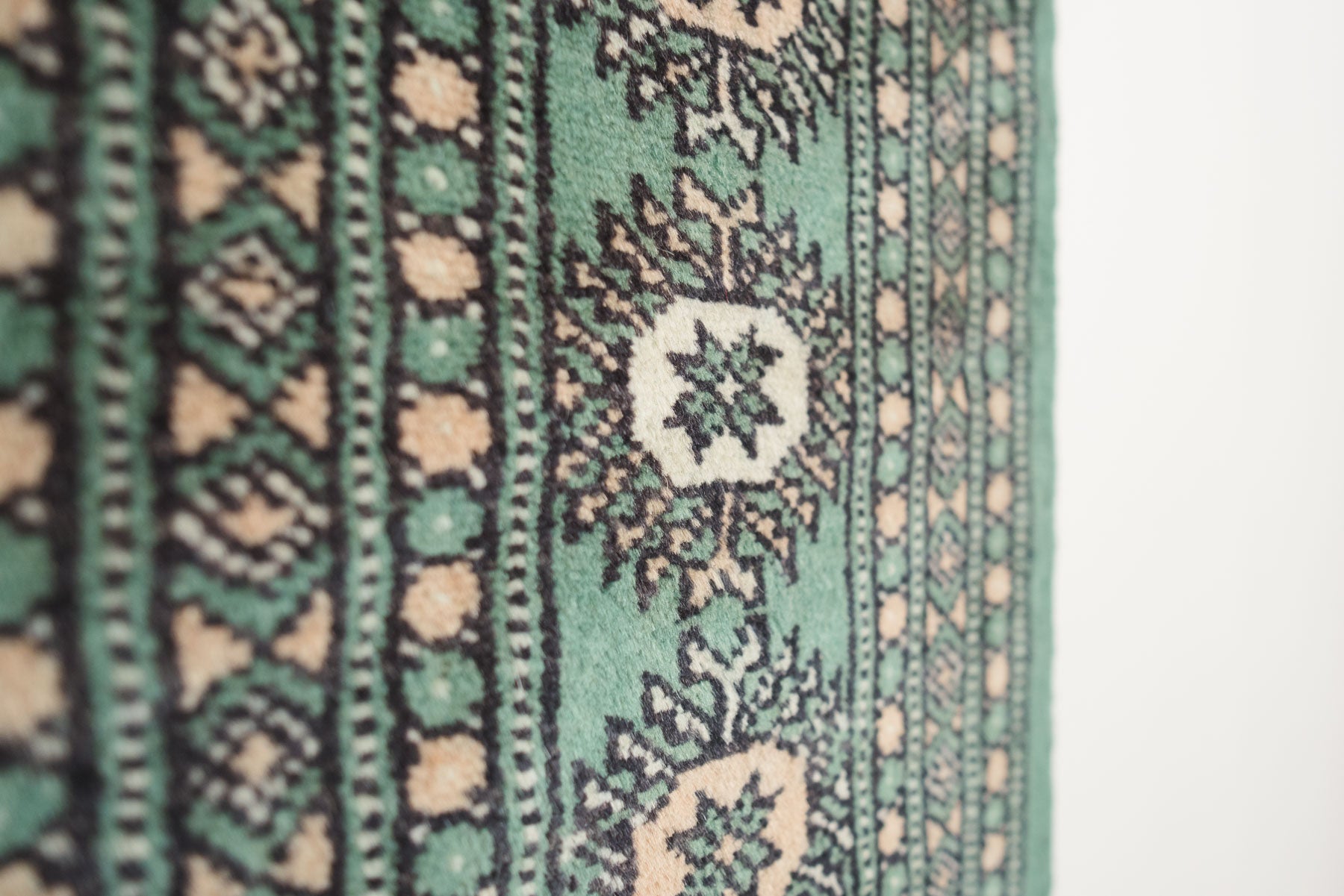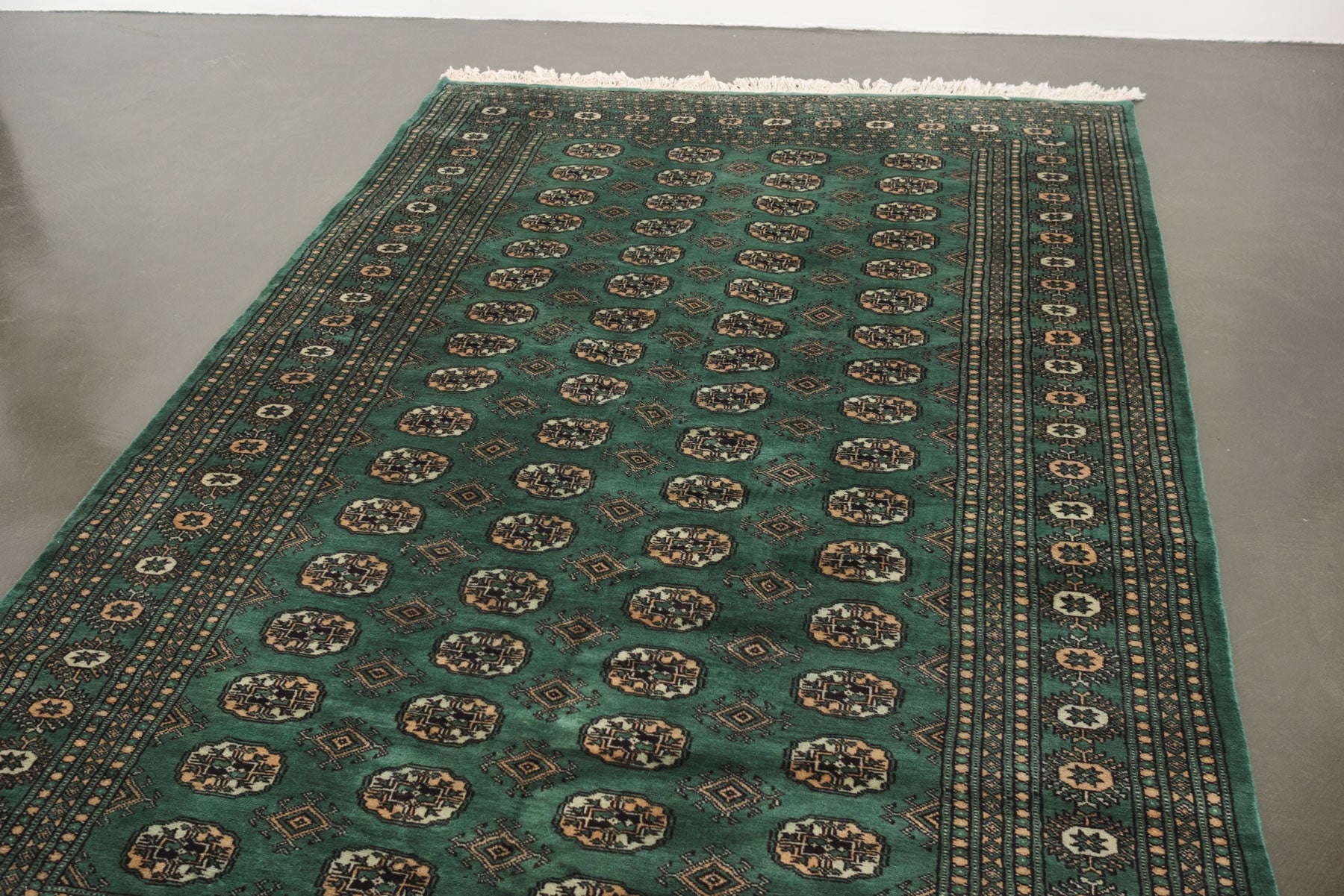 name: Taous style: hand knotted, Pakistani, Peshawar, Bokhara, rug, carpet material: wool colors: green, cream, camel, black age: new condition: good, age related wear - see pictures