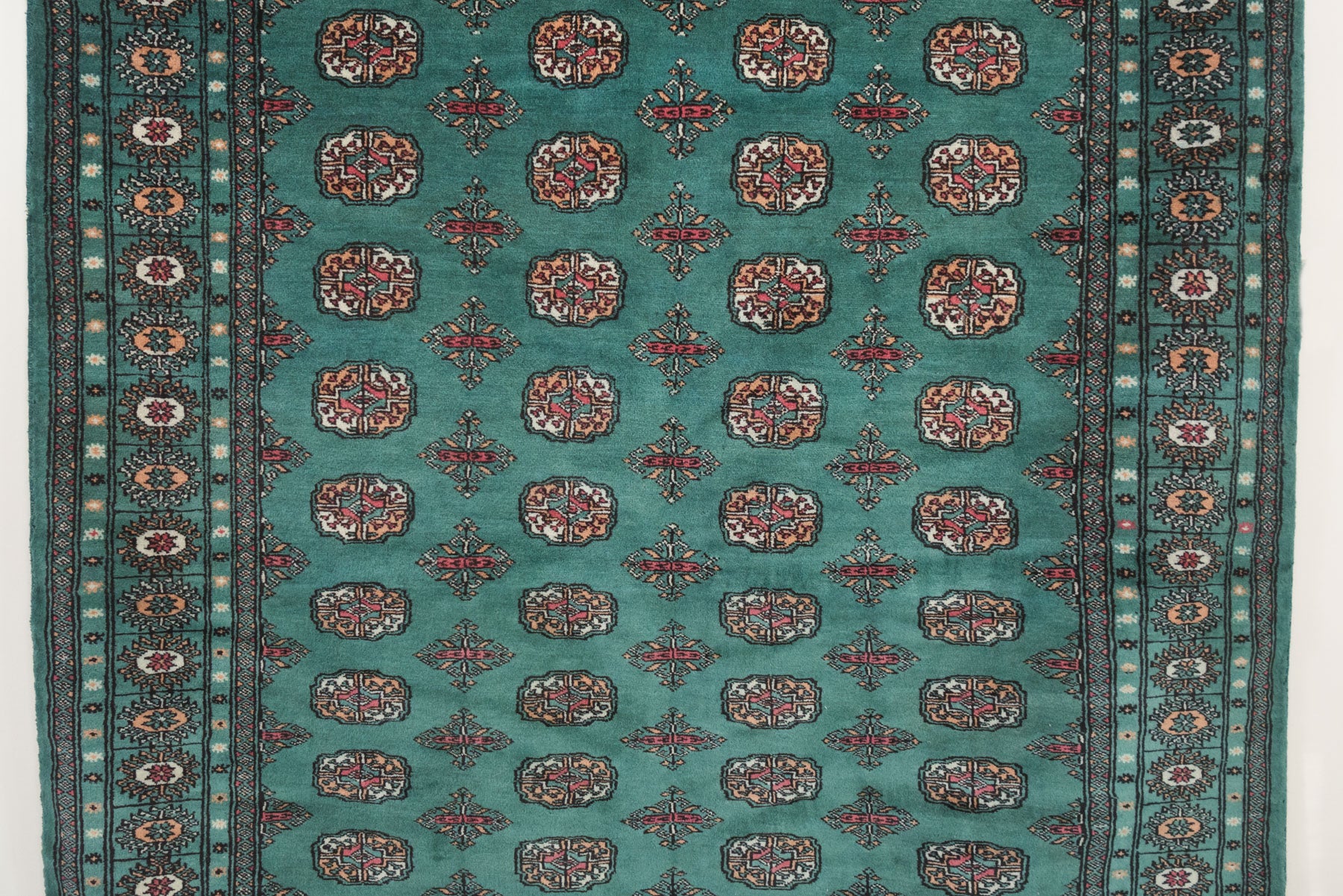 name: Busrahstyle: hand knotted, Pakistani, Peshawar, Bokhara, rug, carpetmaterial: woolcolors: teal, orange, rose, black, creamage: newcondition: good, age related wear - see pictures