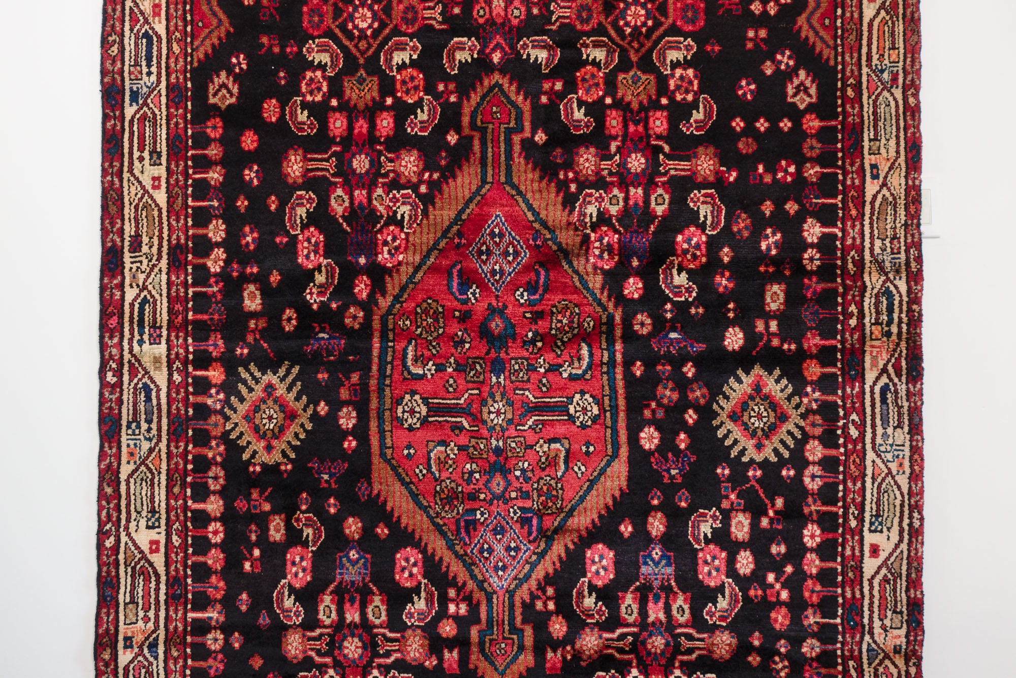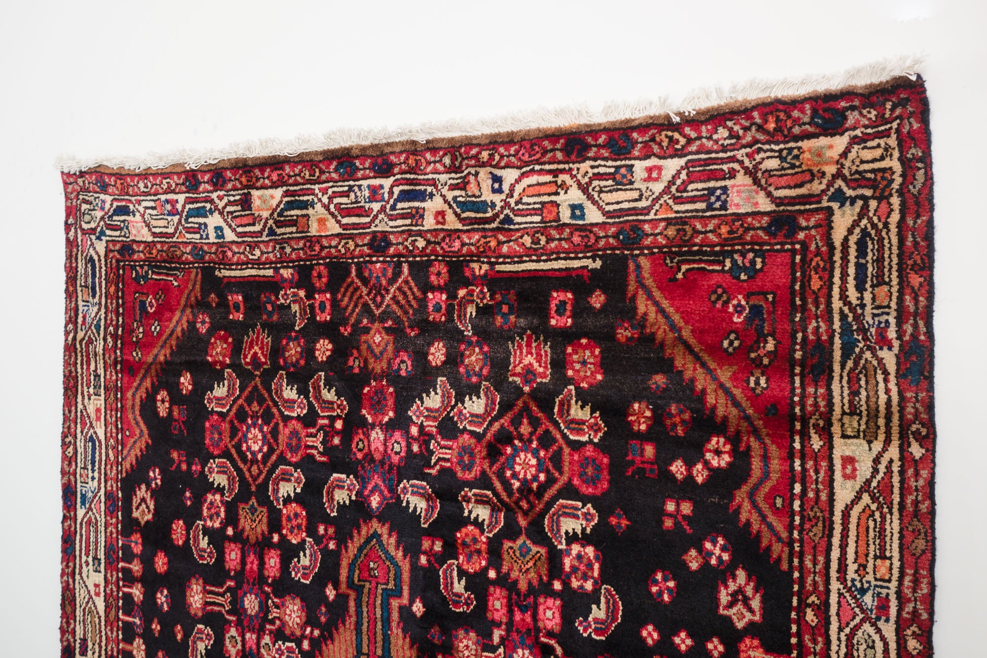 name: Mehrjooorigin: Iran (Persian)style: rug, carpetmaterial: hand knotted woolcolors: black, red, pink, tan, cream, blueage: vintage, 1940-1970condition: good, age related wear - see picturesappraised value: $2376sku: p-1115