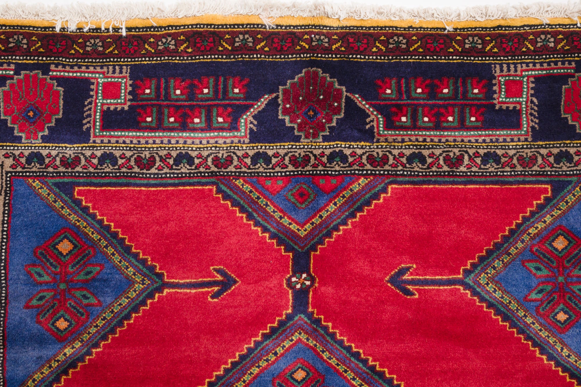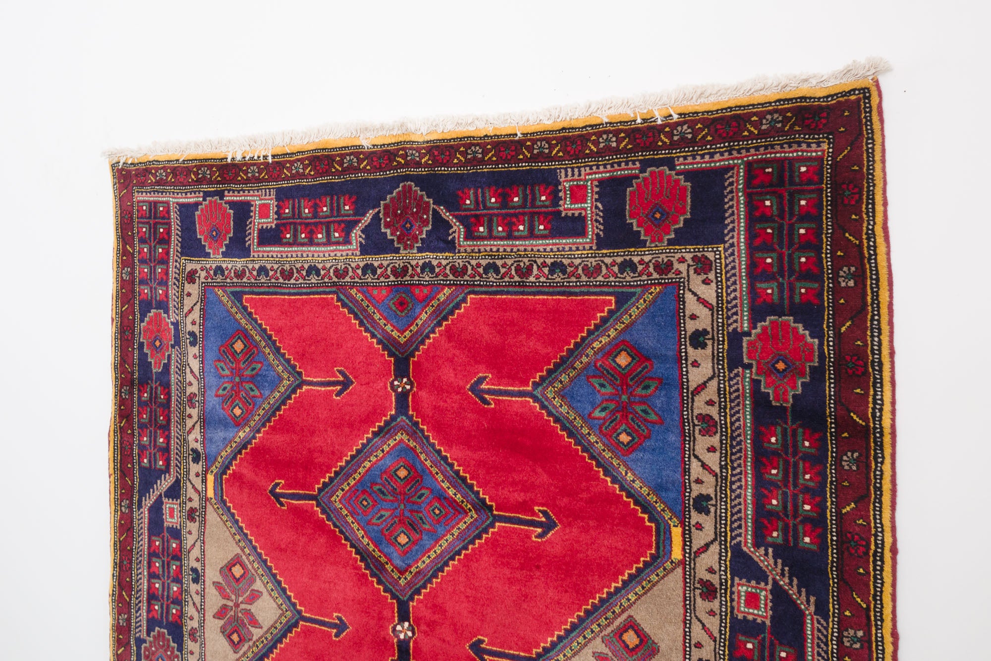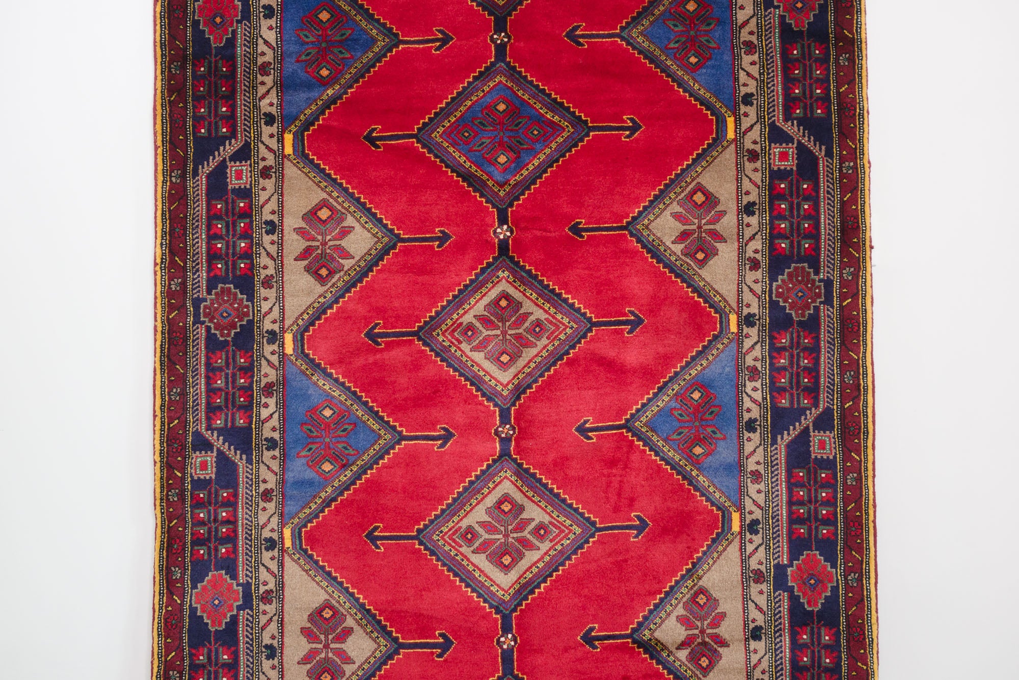 name: Miladorigin: Iran (Persian)style: koliai, rug, carpetmaterial: hand knotted woolcolors: red, blue, navy, brown, teal, yellow, orangeage: vintage, 1940-1970condition: good, age related wear - see picturesappraised value: $2516sku: p-1123