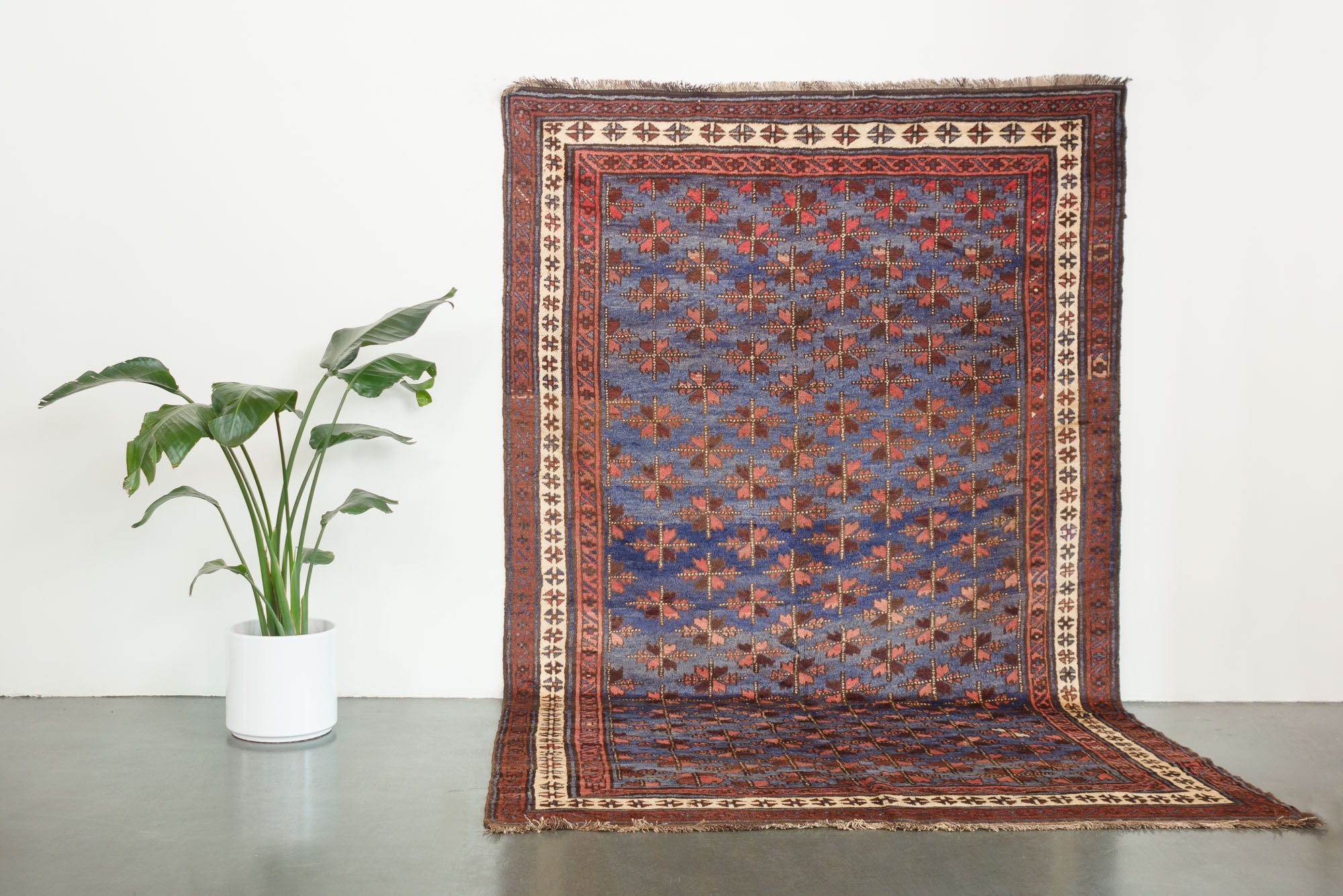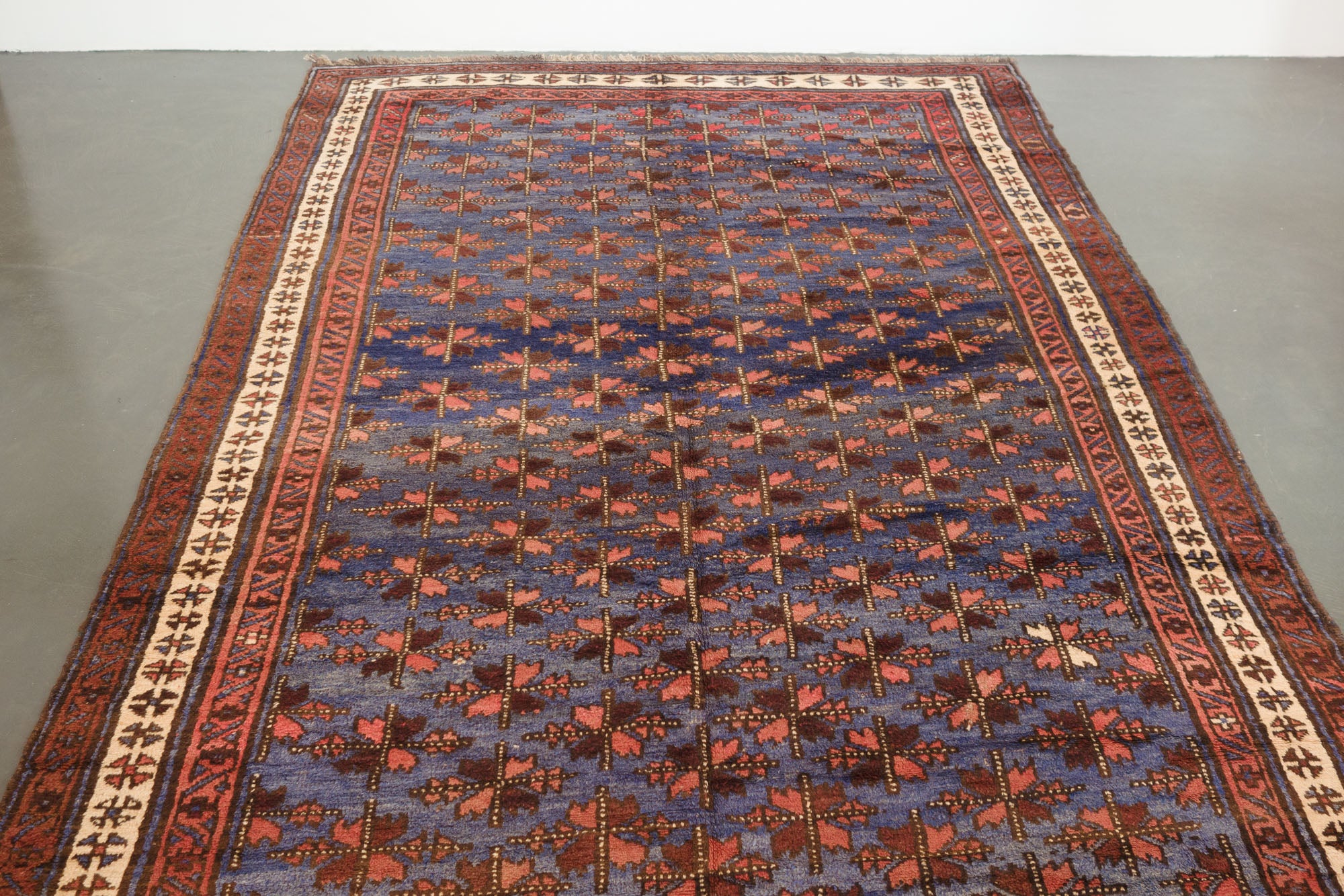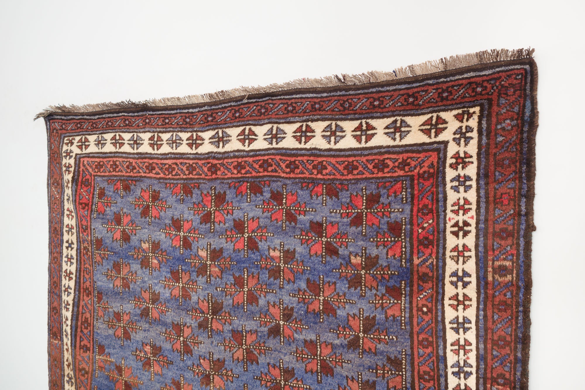 name: Zaryaborigin: Afghanistanstyle: Rizbaft, rug, carpetmaterial: hand knotted woolcolor: blues, browns, cream, redsage: vintage (1940-1969)condition: good, age related wear - see picturesappraised value: $2,972sku: a-393