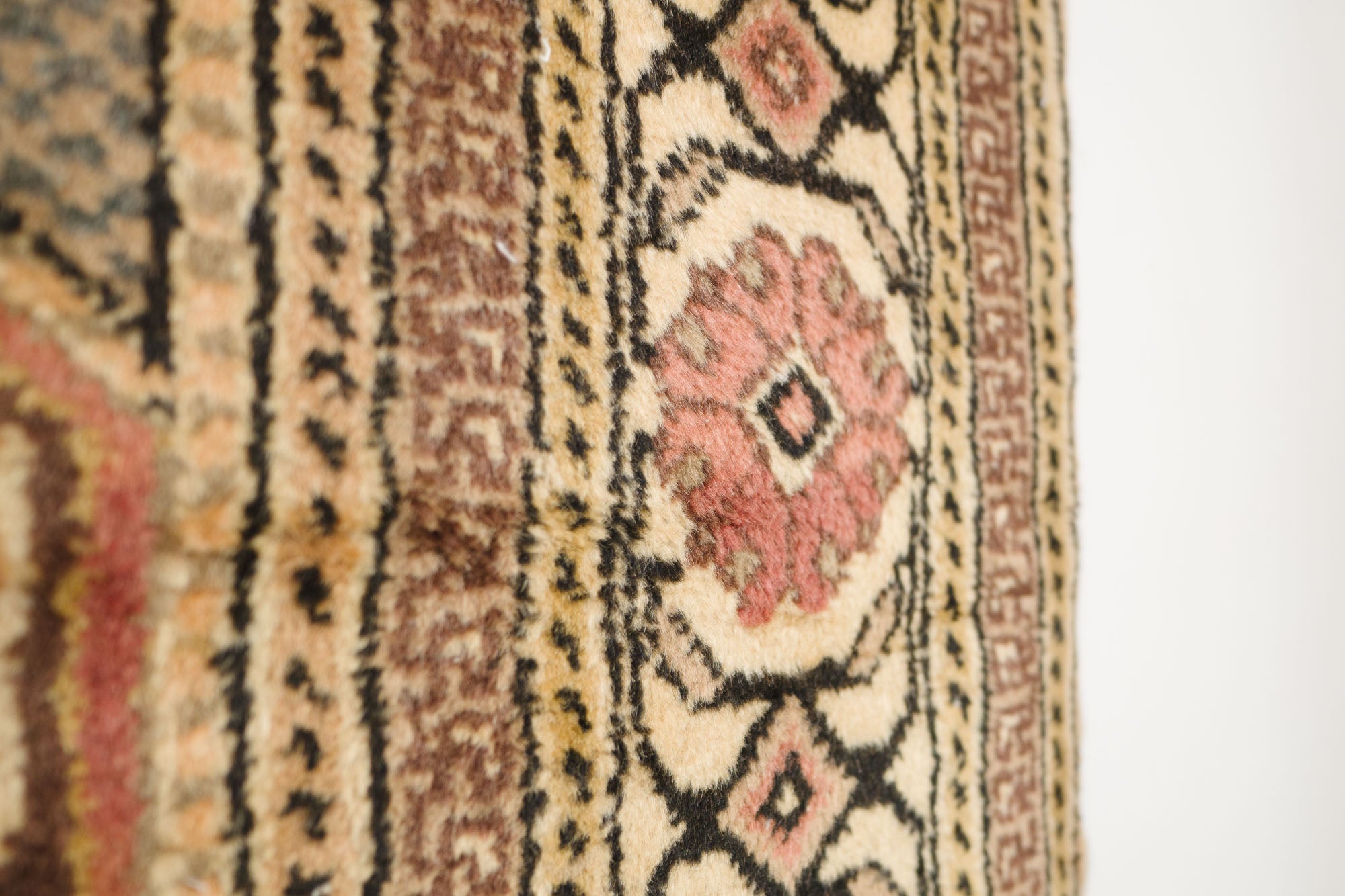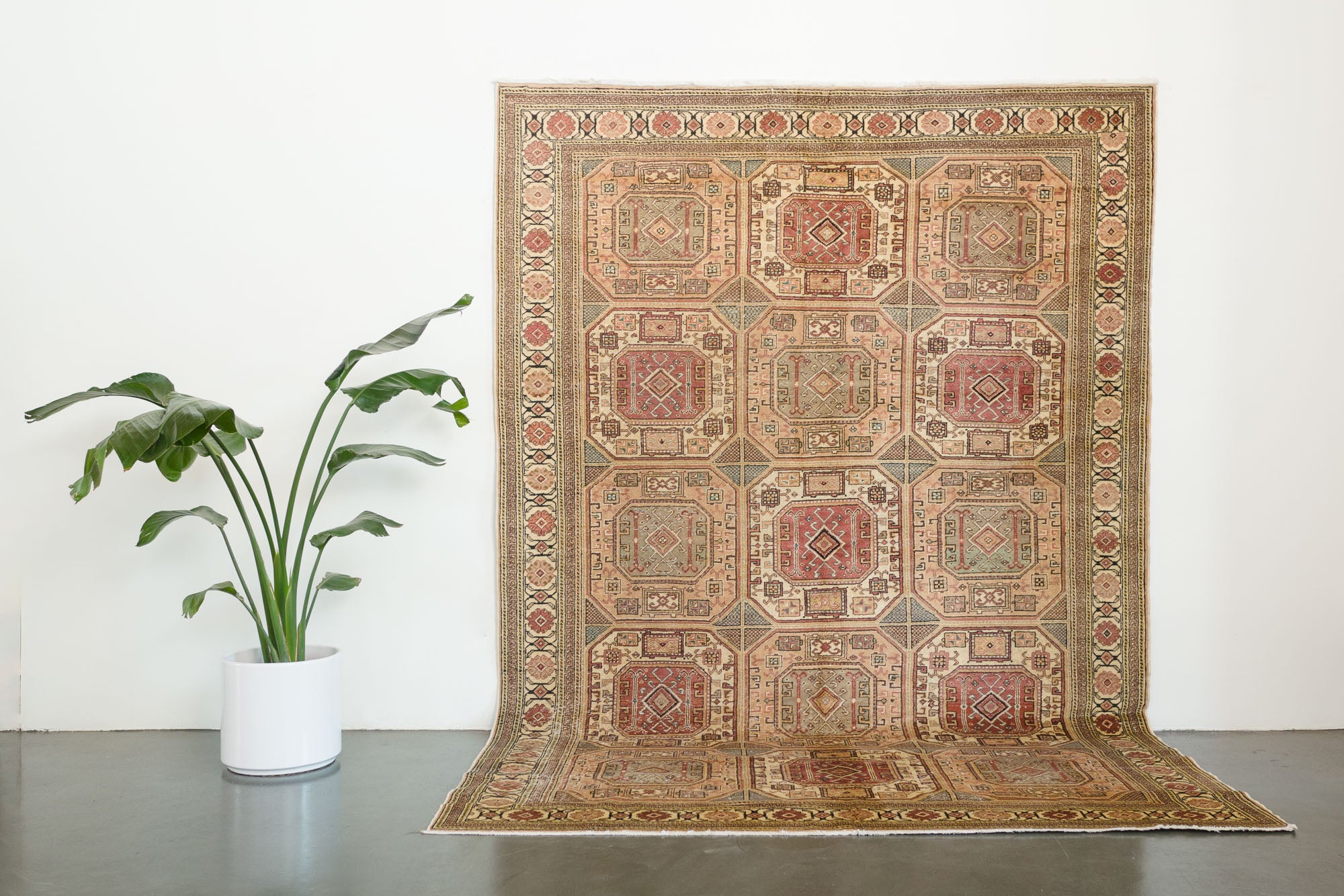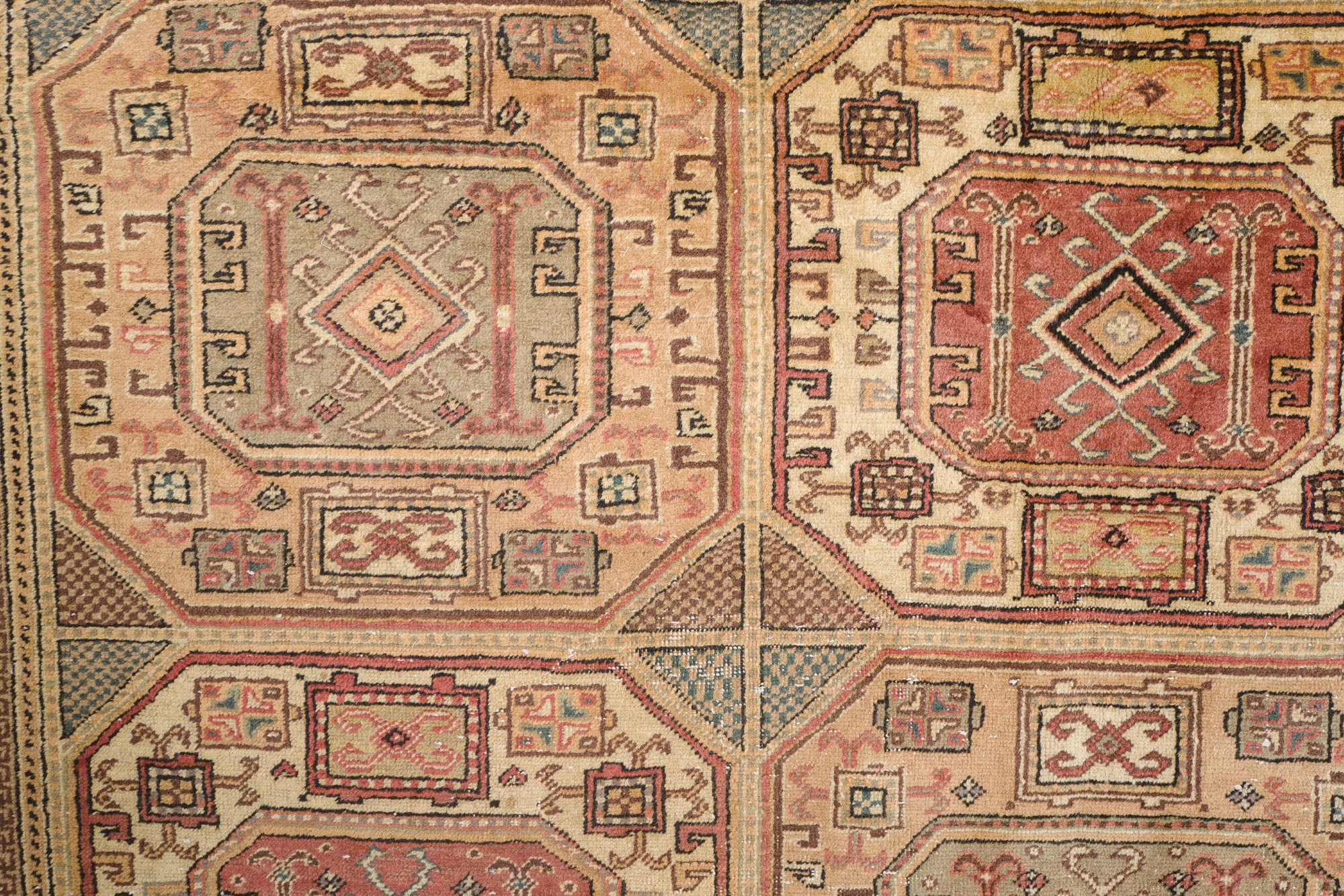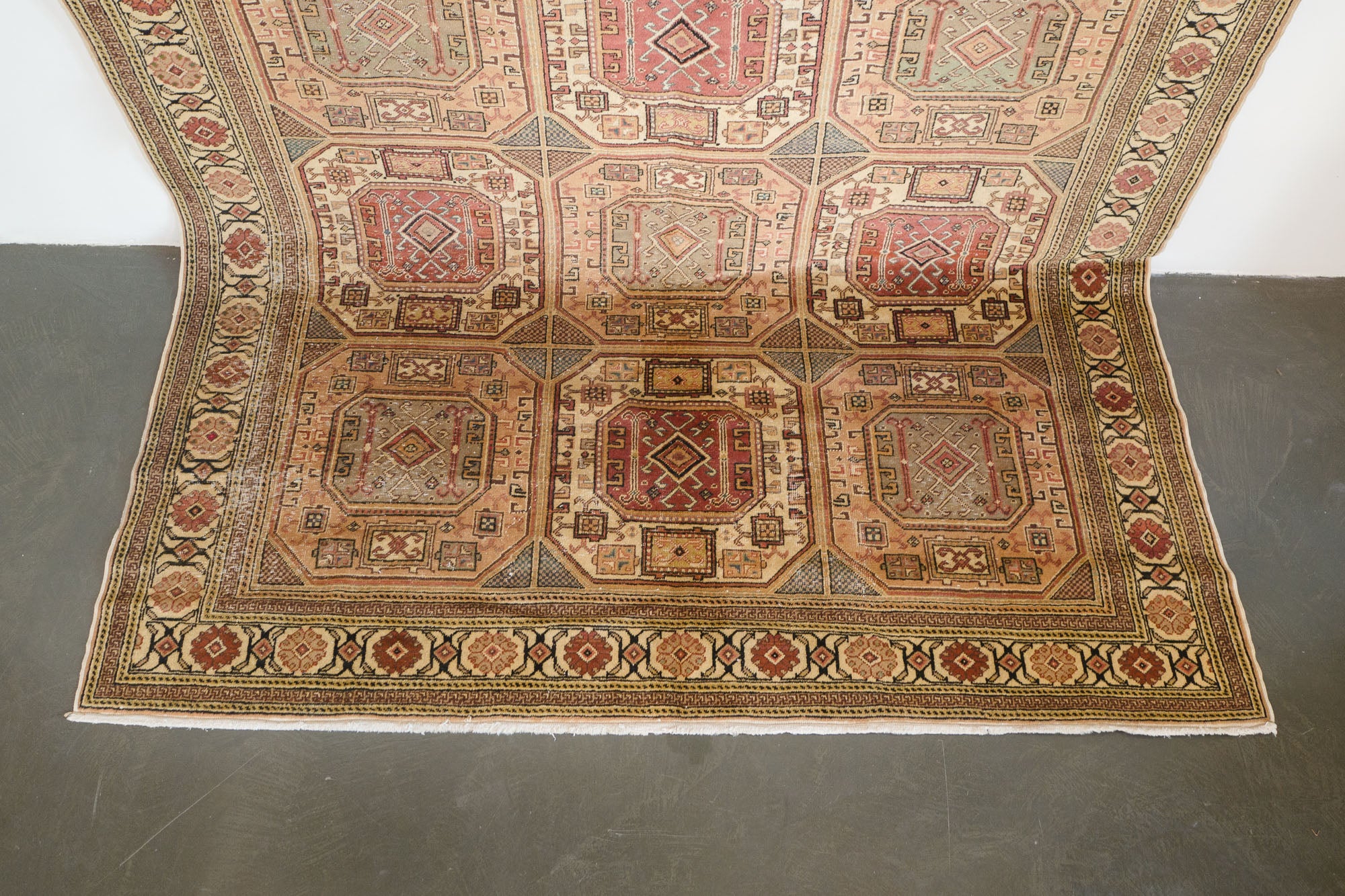 name: Sarihanorigin: Turkeystyle: Keisari, geometric, rug, carpet, material: hand knotted woolcolor: pink, gray, greens, browns, cream, blackage: vintage (1940-1969)condition: good, age related wear - see picturesappraised value: $3,156
