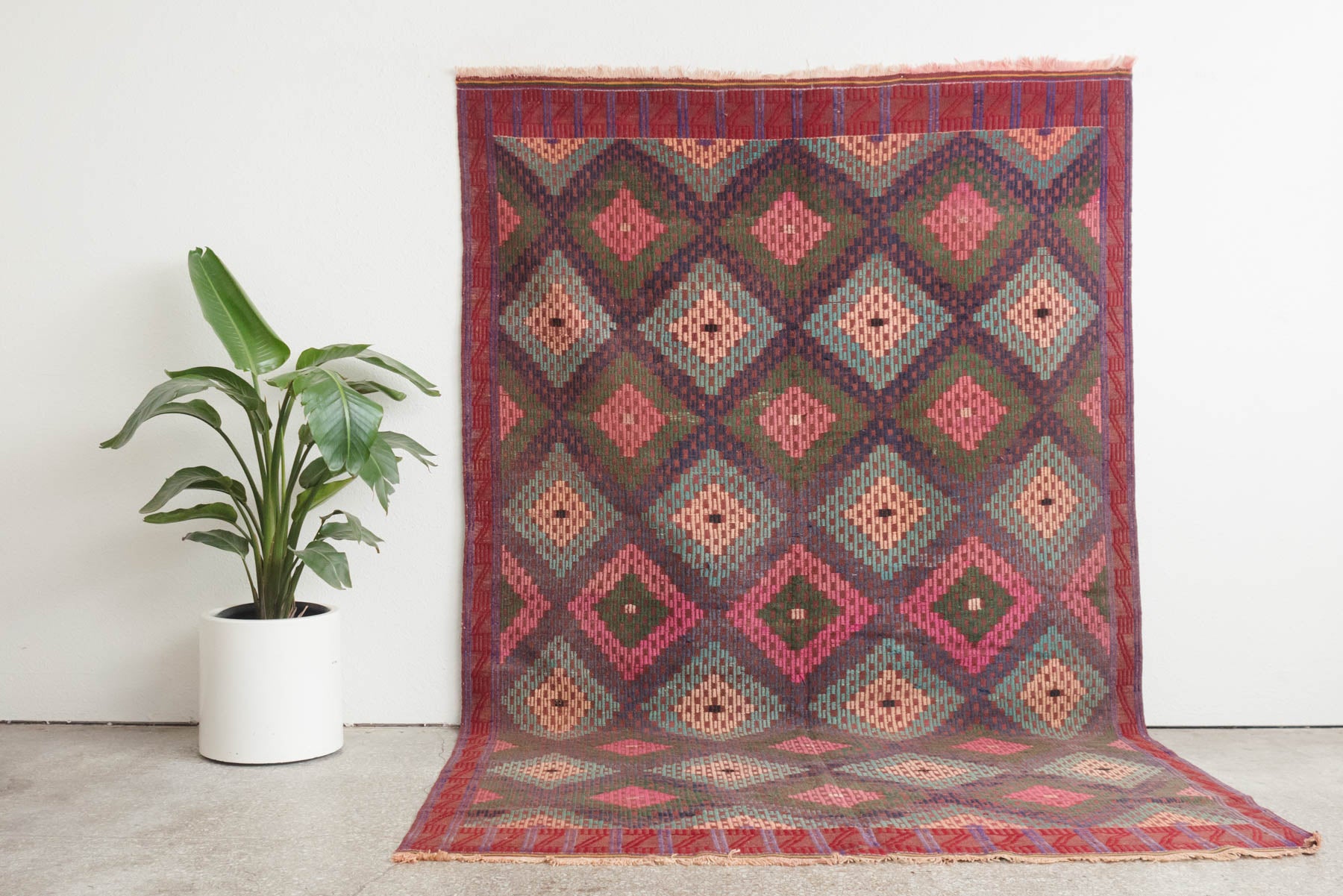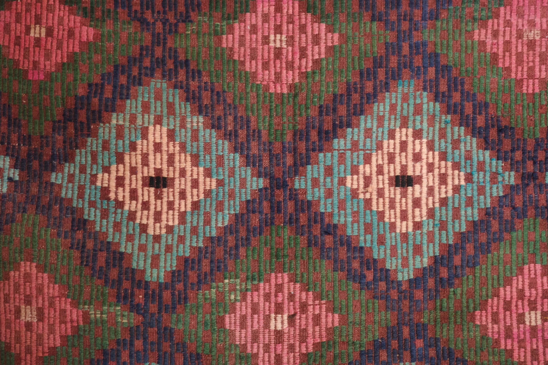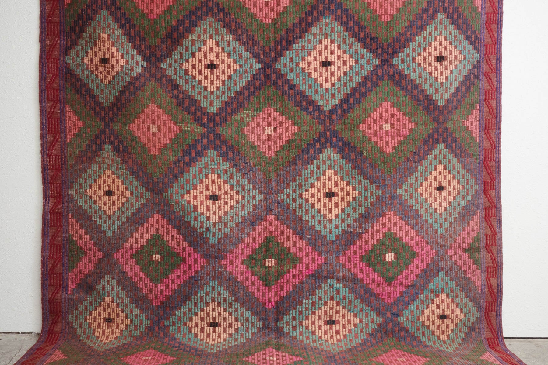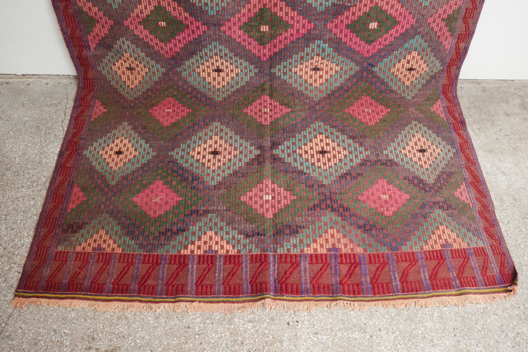 name: Aygunorigin: Turkey, Yoruk, Soumakstyle: flat weave, kilim, rug, carpetmaterial: hand woven woolcolors: reds, pink, green, blue, violet, creamage: vintage condition: good, age related wear - see pictures
