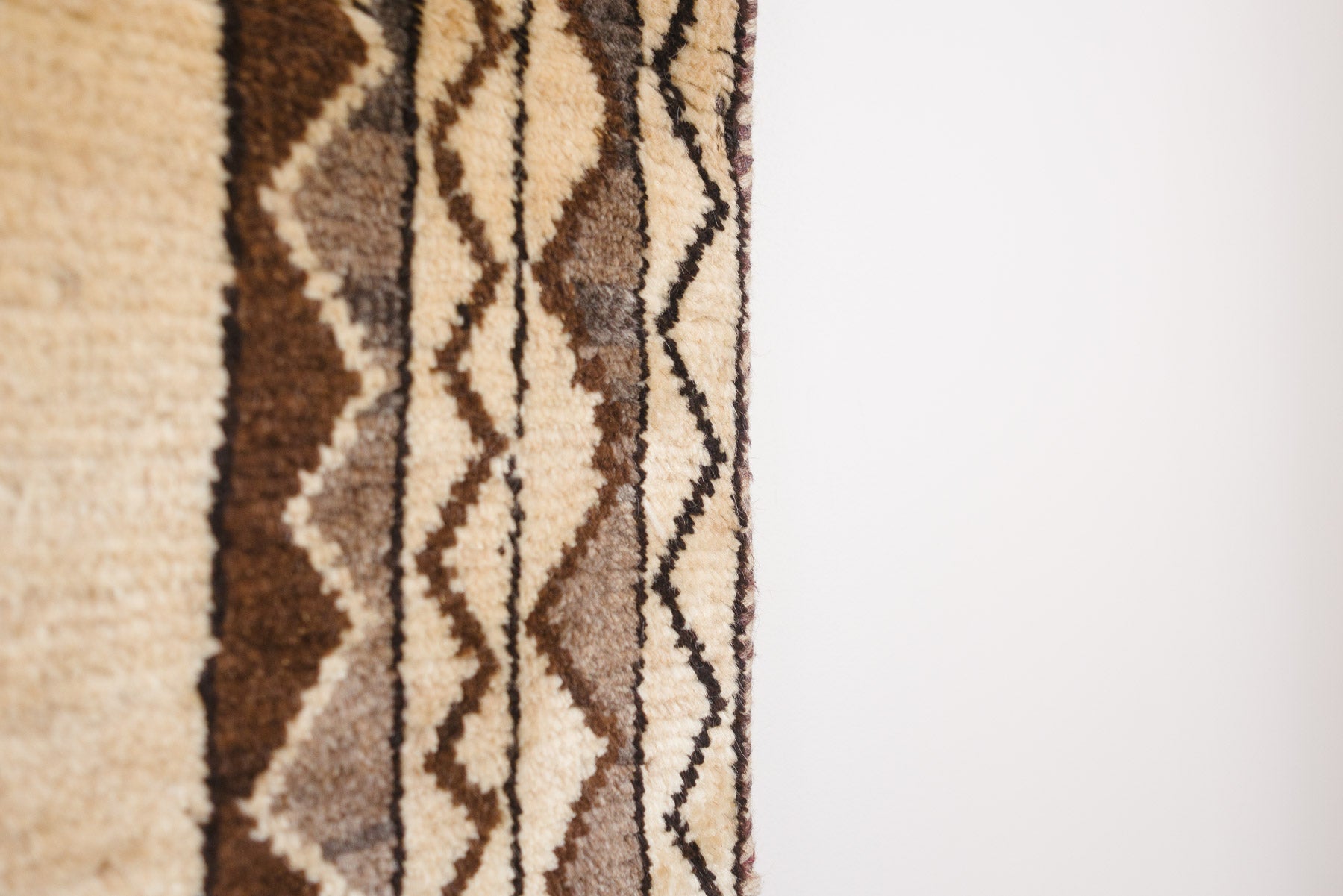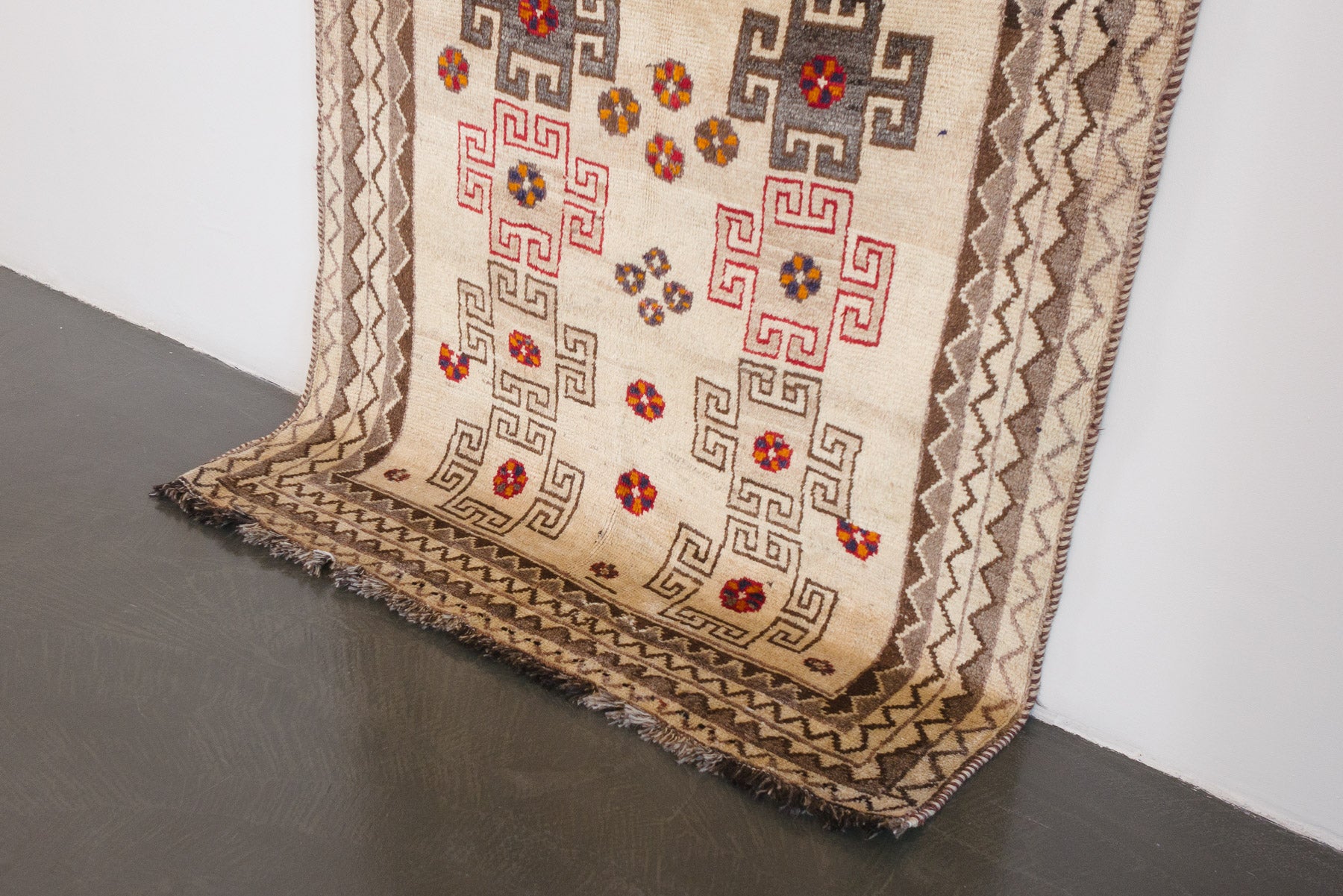 name: Davarorigin: Iran (Persian), Gabbehstyle: rug, carpetmaterial: hand knotted woolcolors: cream, browns, gray, camel, red, orange, yellow, black, creamage: vintagecondition: good, age related wear - see picturesappraised value: $2500