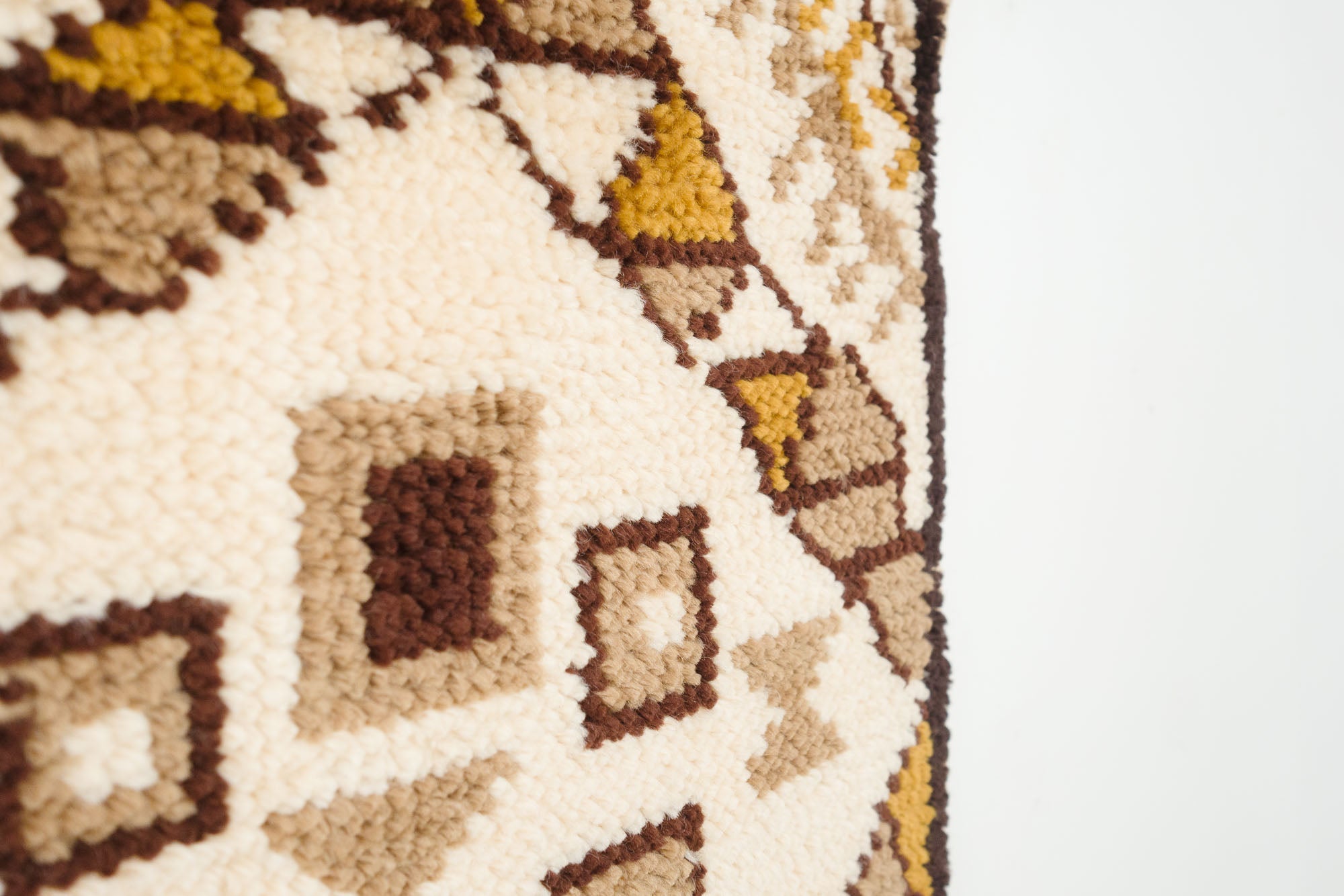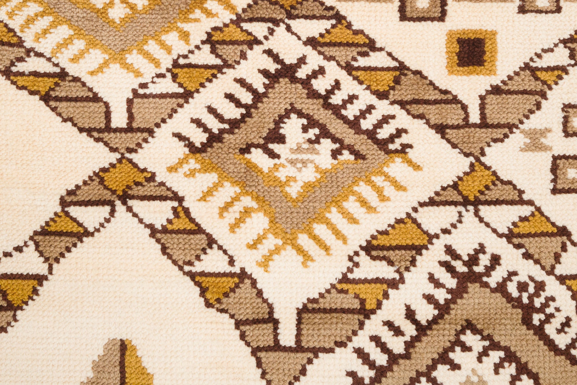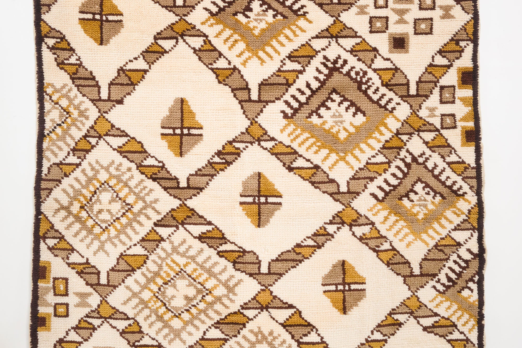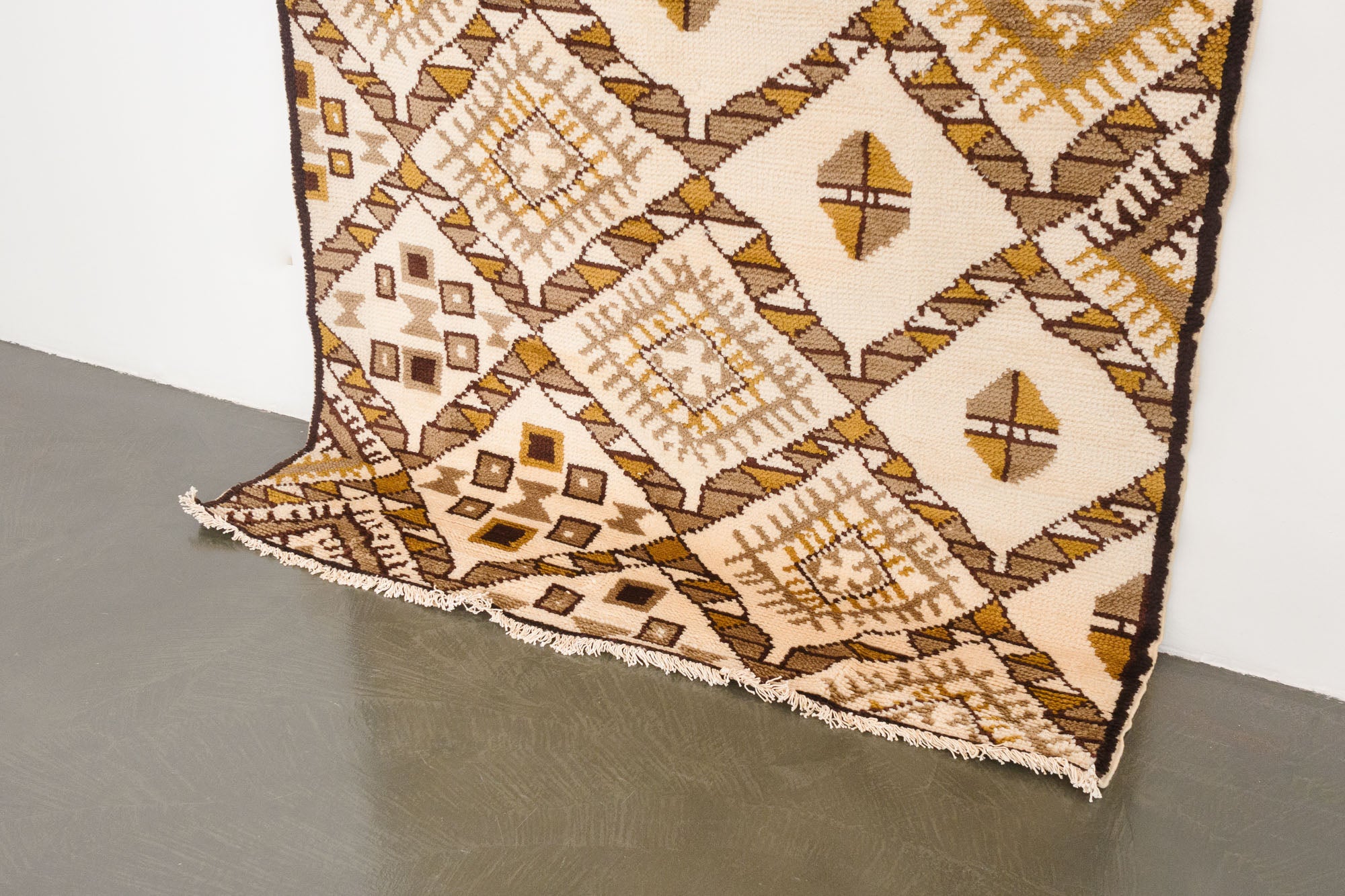 name: Adimorigin: Moroccostyle: rug, carpetmaterial: hand knotted woolcolors: brown, camel, yellow, creamage: vintagecondition: good, age related wear - see pictures