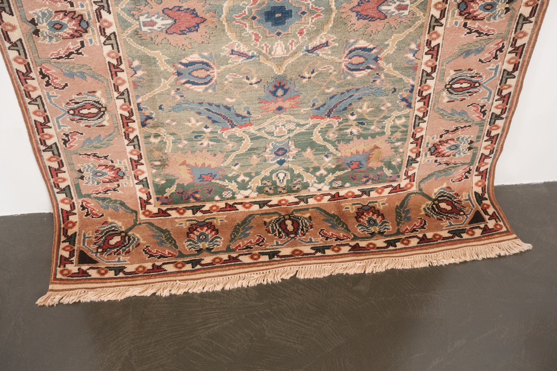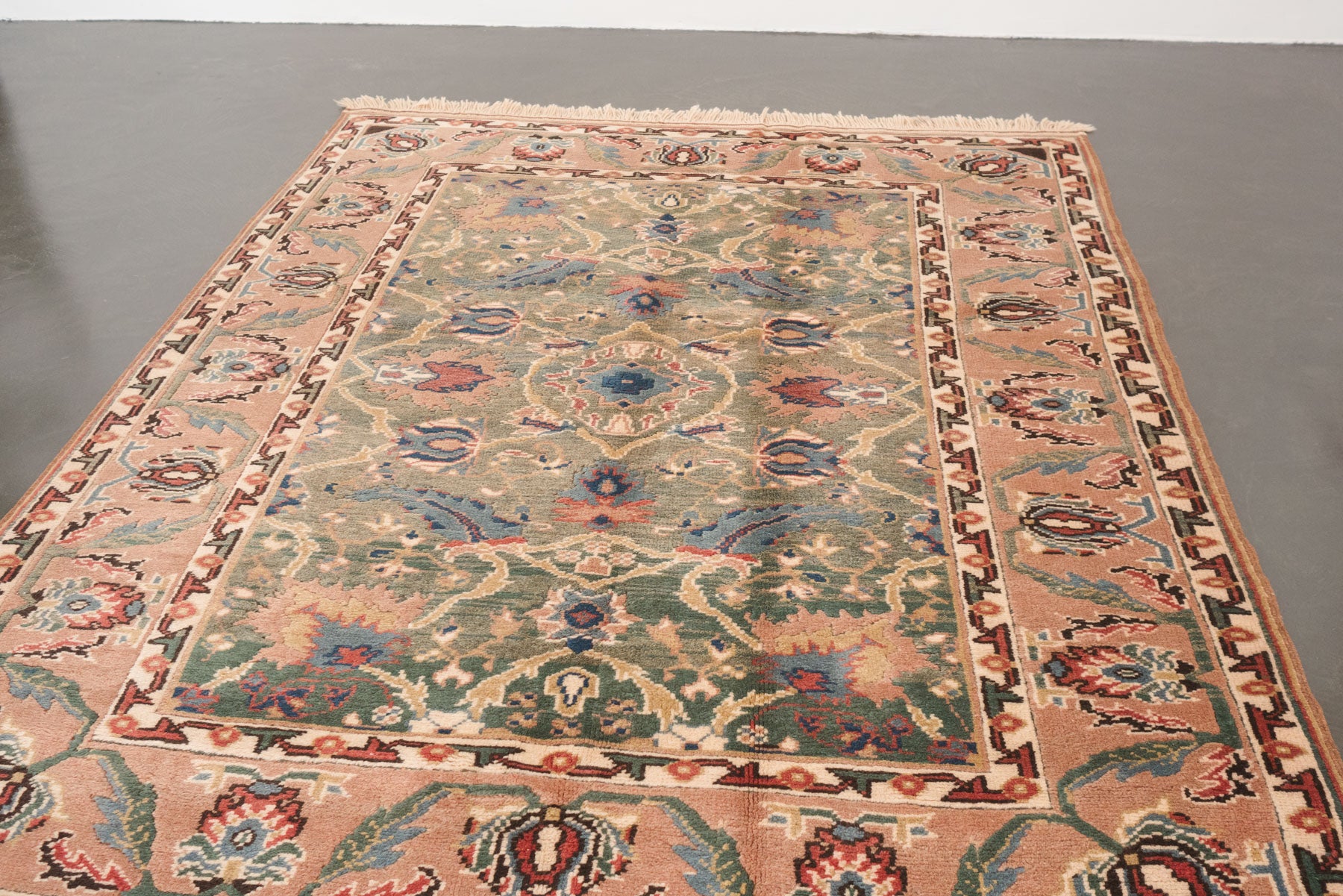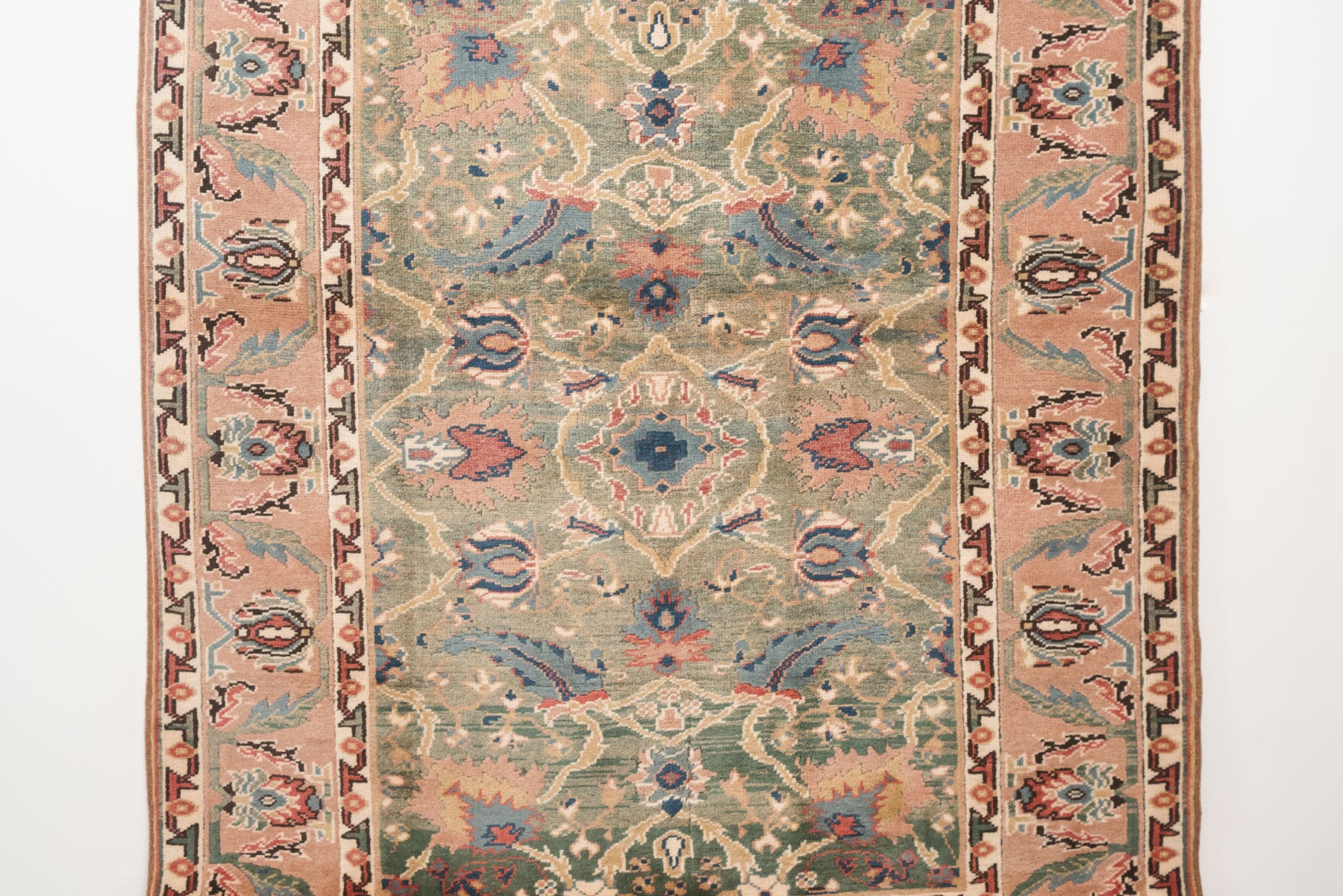 name: Ekberorigin: Turkey, Shiravanstyle: rug, carpetmaterial: hand knotted woolcolors: pink, green, blue, reds, orange, brown, creamage: vintage condition: good, age related wear - see pictures