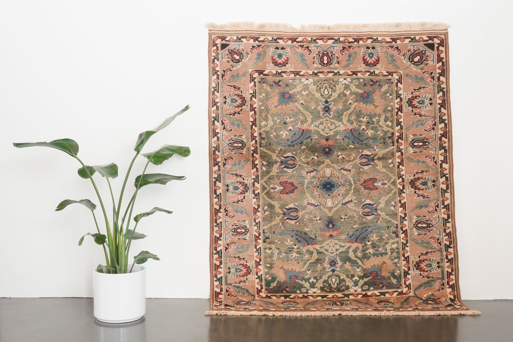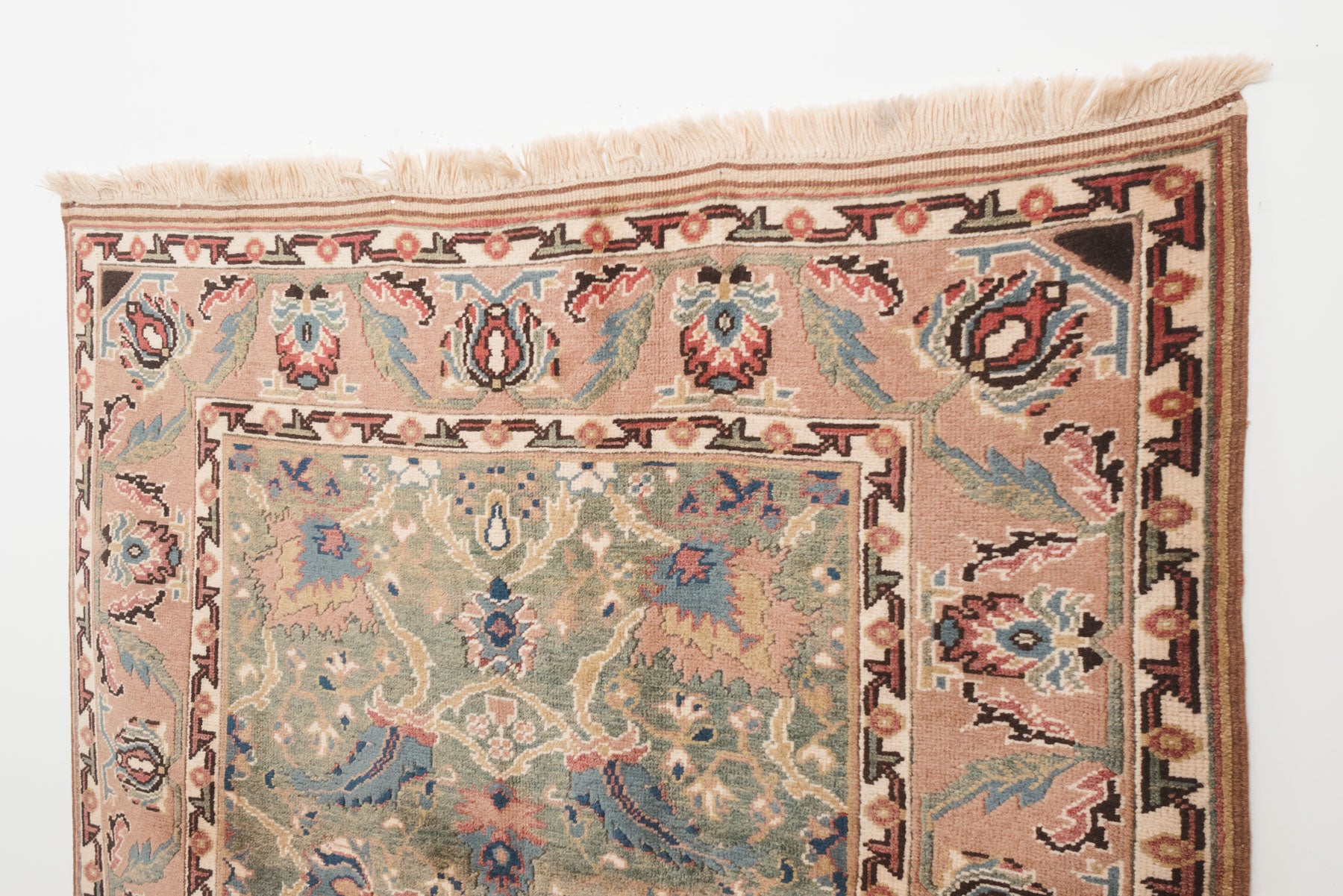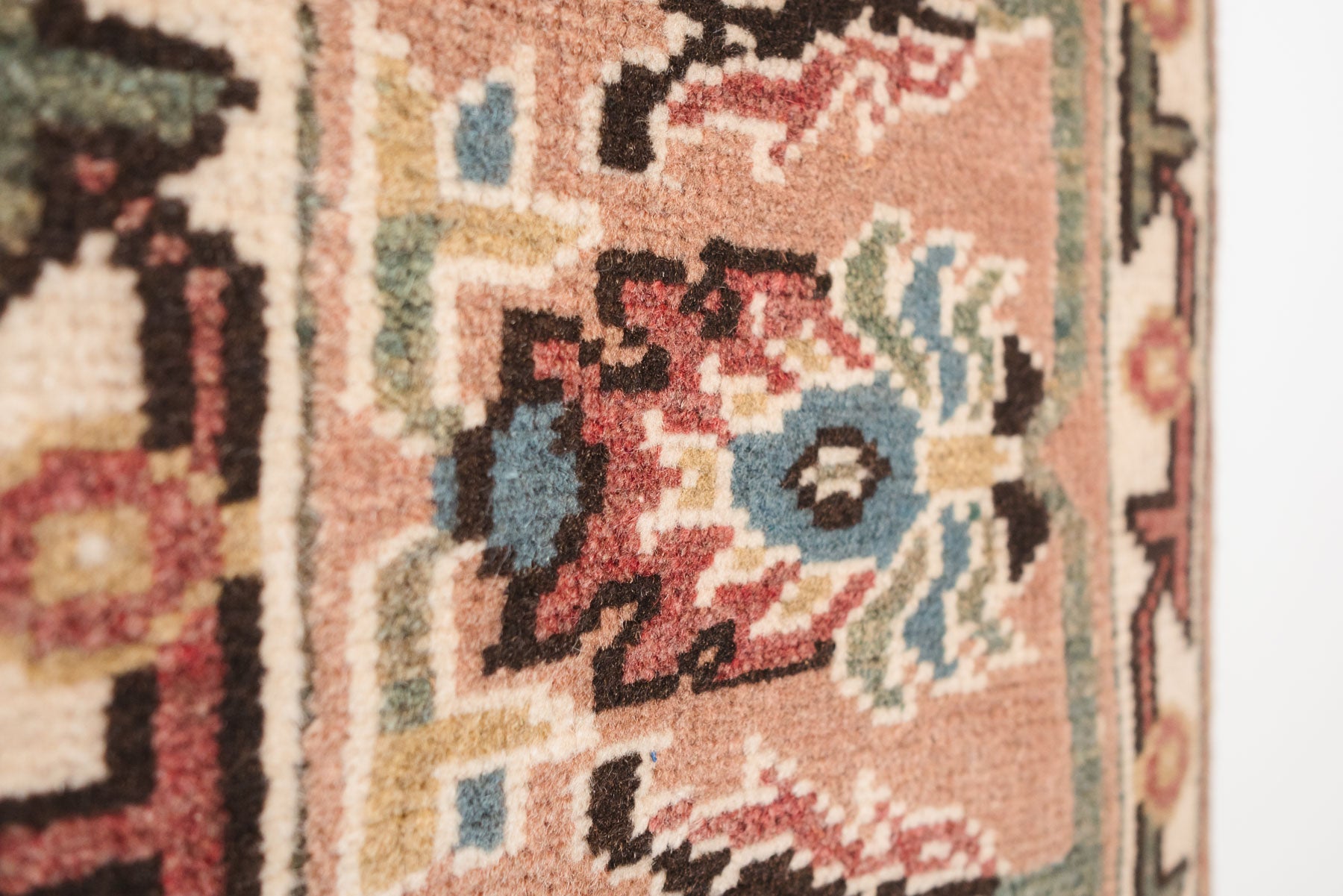 name: Ekberorigin: Turkey, Shiravanstyle: rug, carpetmaterial: hand knotted woolcolors: pink, green, blue, reds, orange, brown, creamage: vintage condition: good, age related wear - see pictures