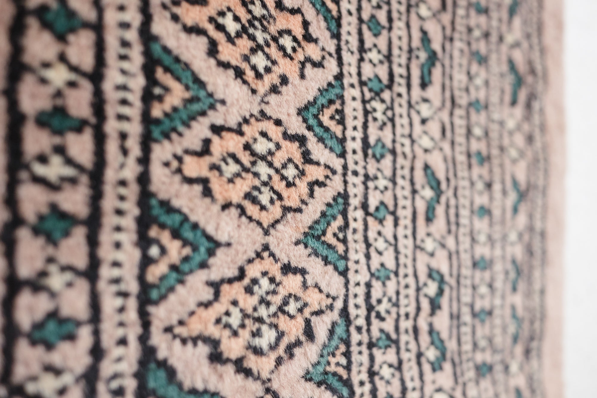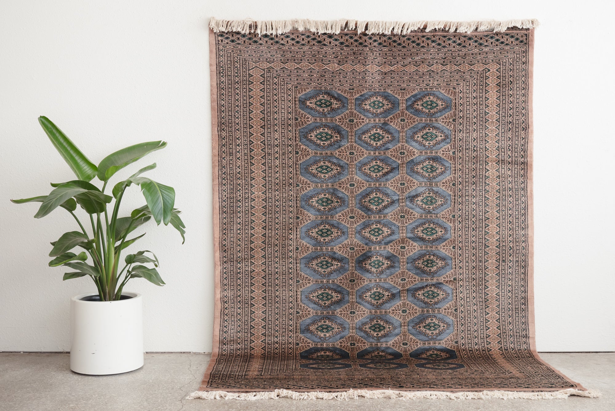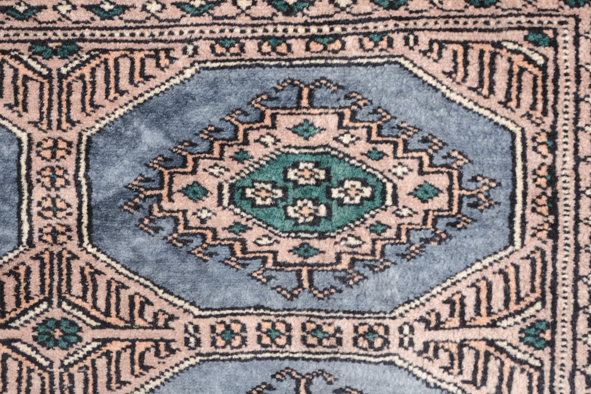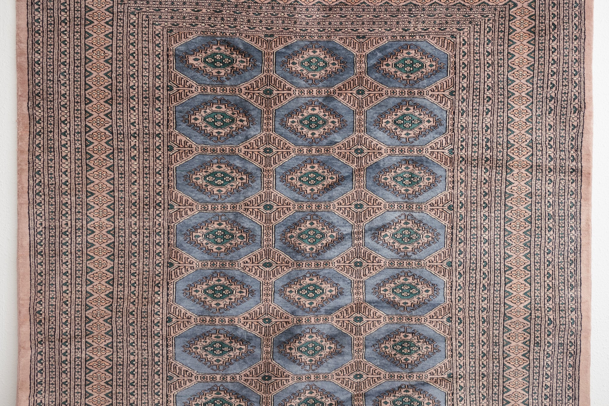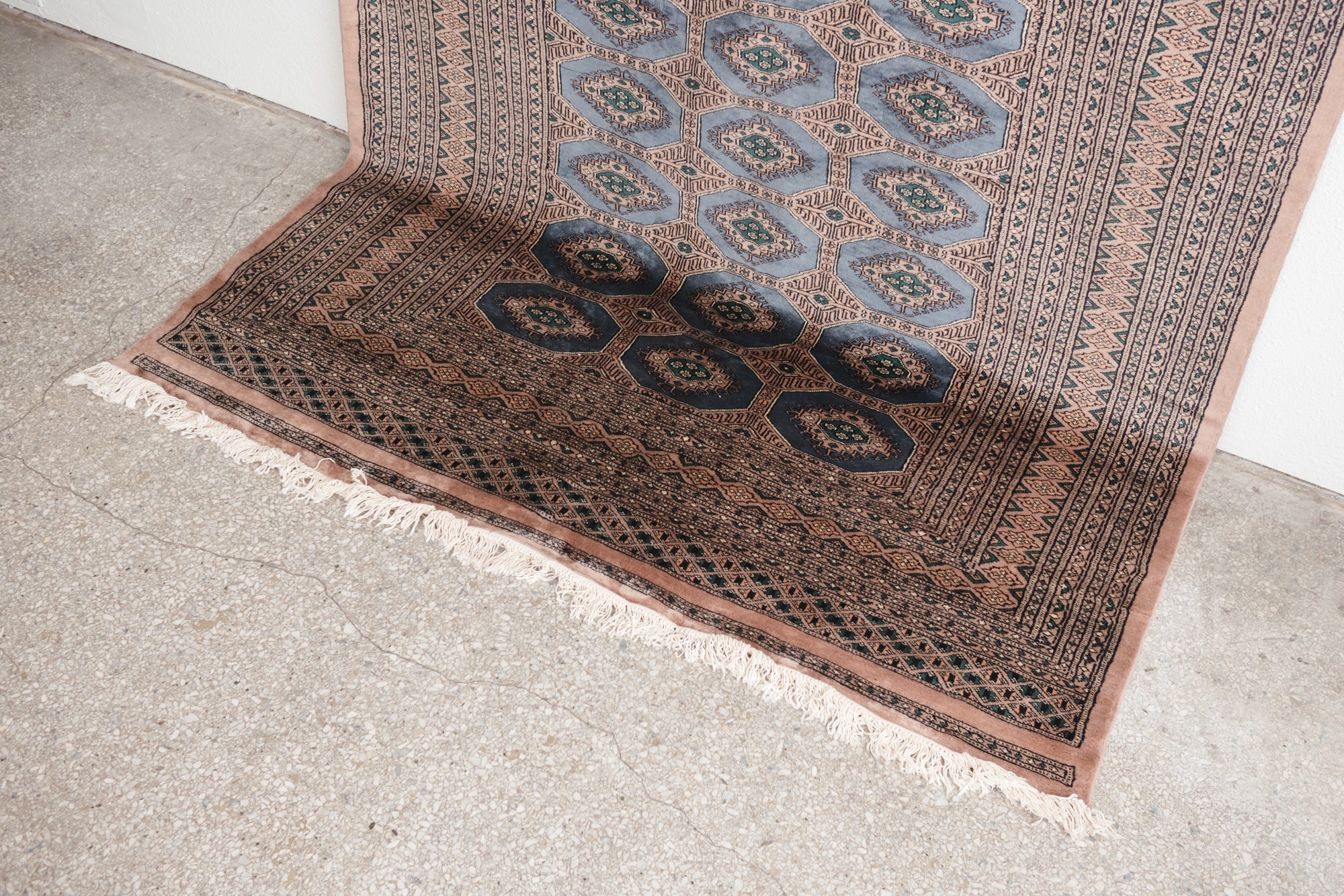 name: Mizhirstyle: hand knotted, Pakistani, Peshawar, Bokhara, rug, carpetmaterial: woolcolors: peach, brown, tan, black, blue, teal, mauveage: vintage