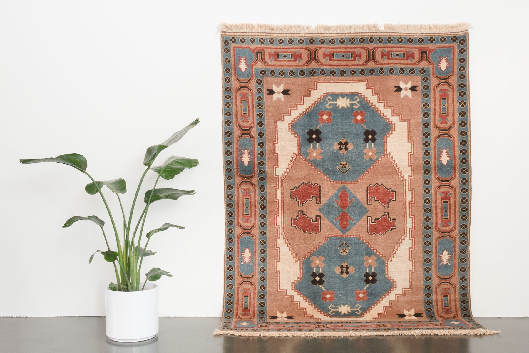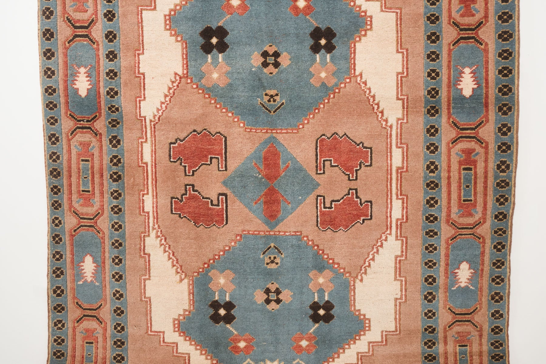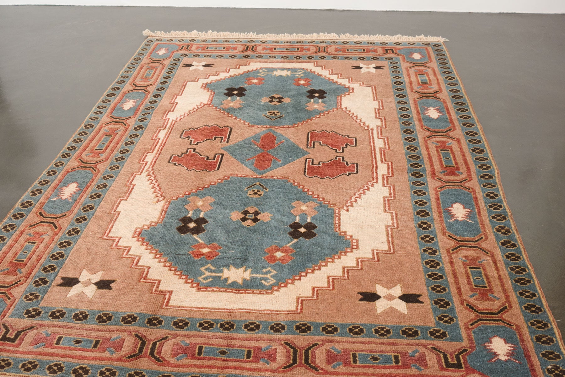 name: Durulorigin: Turkey, Shiravanstyle: rug, carpetmaterial: hand knotted woolcolors: camel, blue, red, cream, blackage: vintage condition: good, age related wear - see pictures
