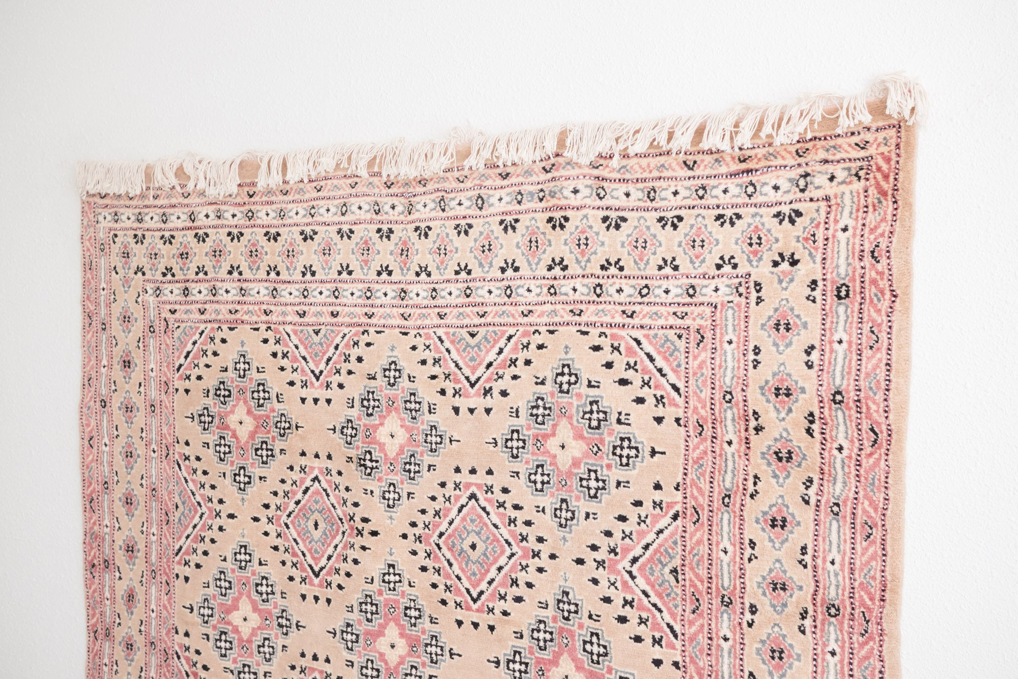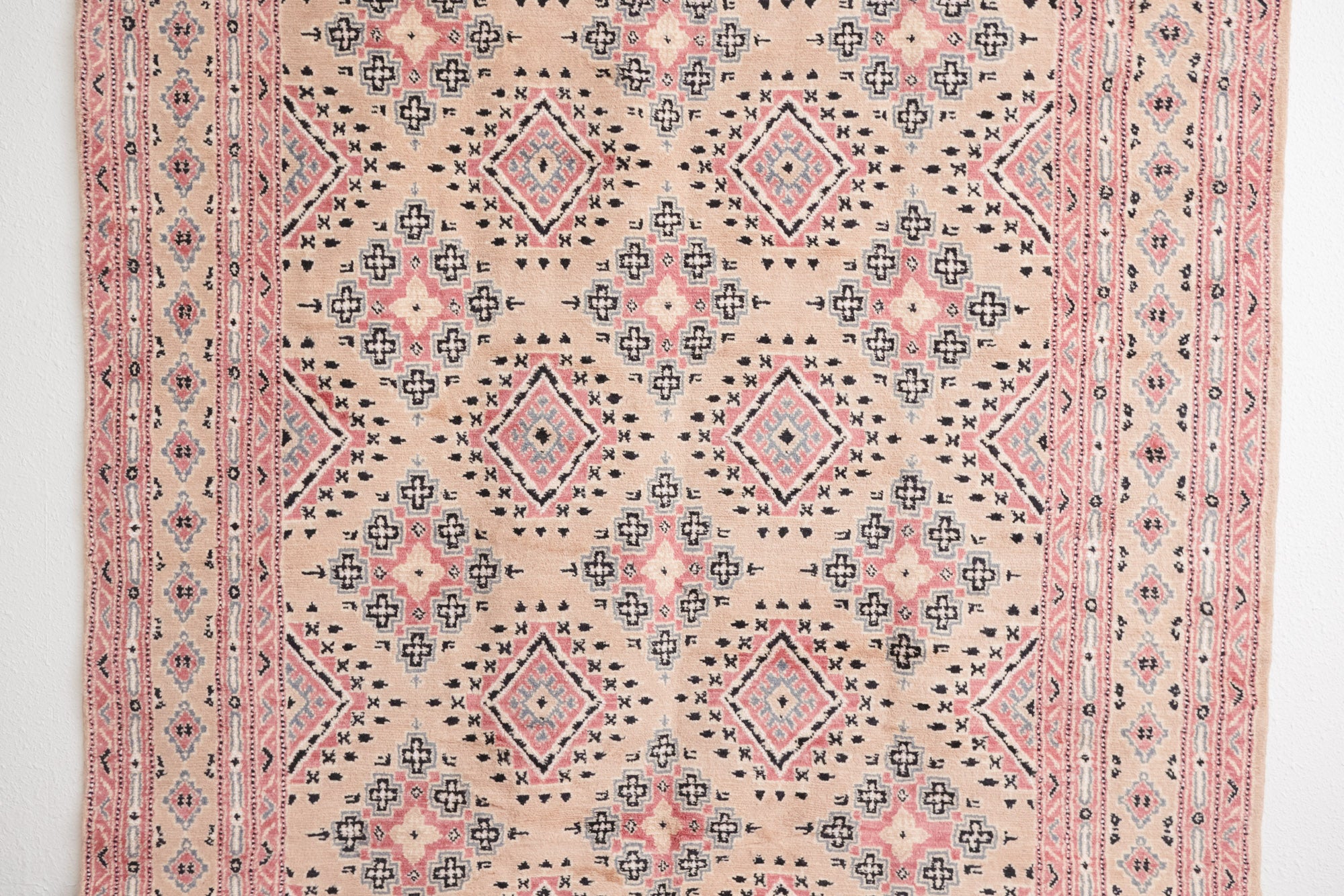 name: Almirstyle: hand knotted, Pakistani, Peshawar, Bokhara, rug, carpetmaterial: woolcolors: rose, gray, camel, cream, blackage: vintagecondition: good, age related wear - see pictures