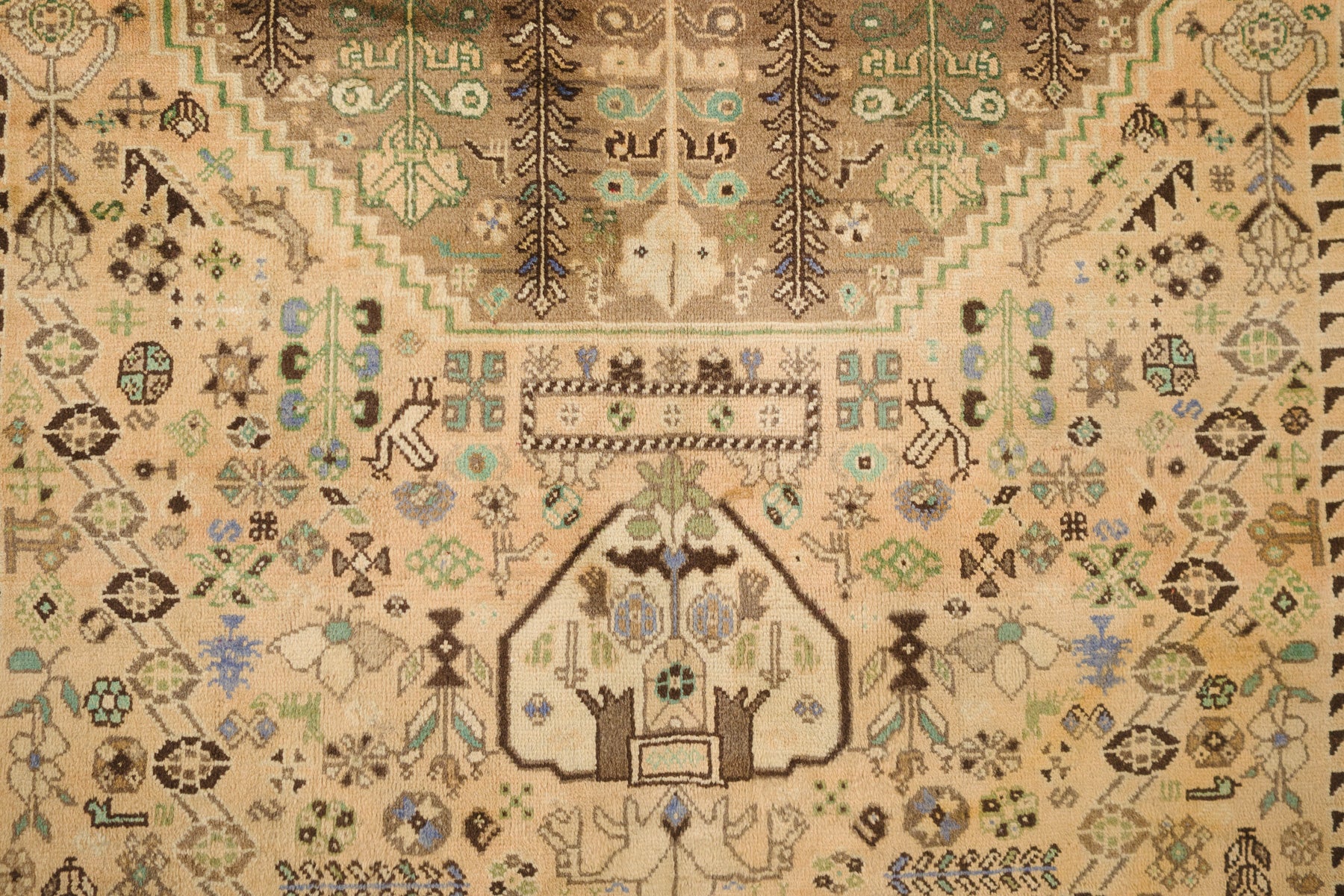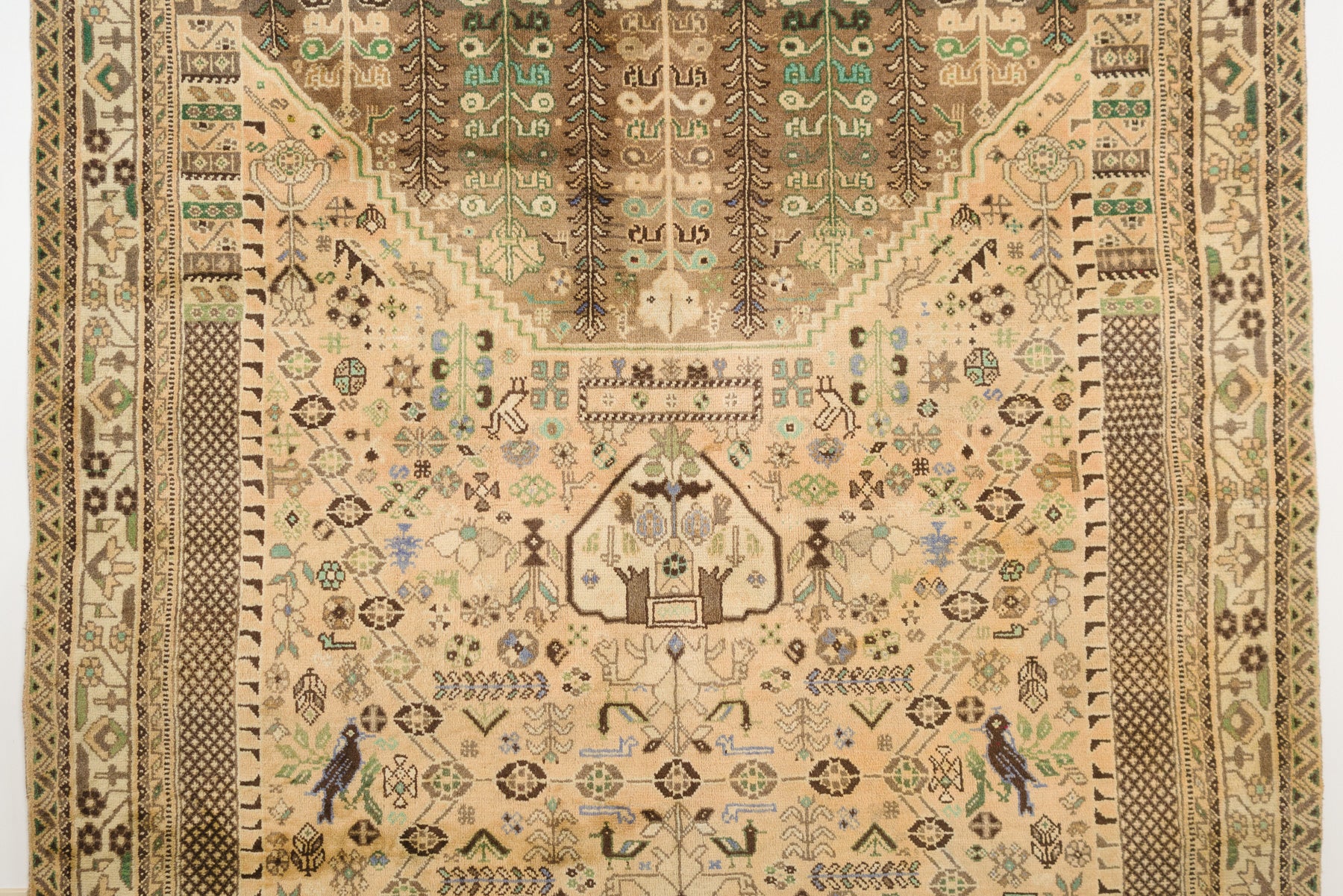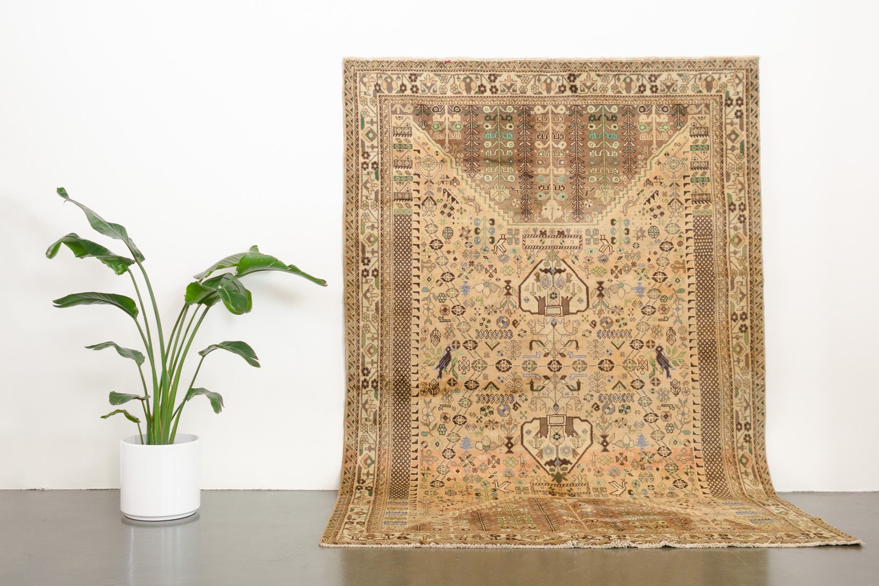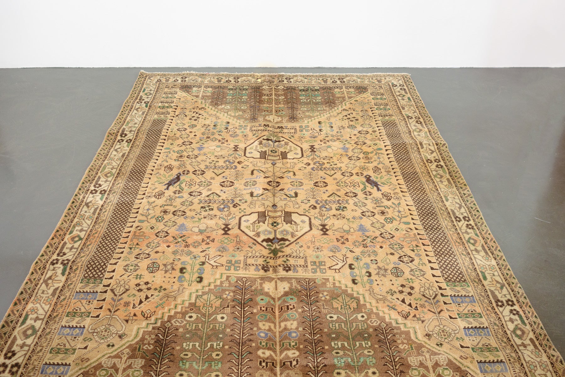 name: Zerinorigin: Iran (Persian), Kashkoli, Shirazstyle: rug, carpetmaterial: hand knotted woolcolors: camel, browns, gray, blue, greens, lavenderage: vintage, 1950-1960condition: good, age related wear - see picturesappraised value: $4,50078" x 112" (closest standard rug size is 6.5x9)Free domestic shipping on all rugs.Contact us for an international shipping quote.
