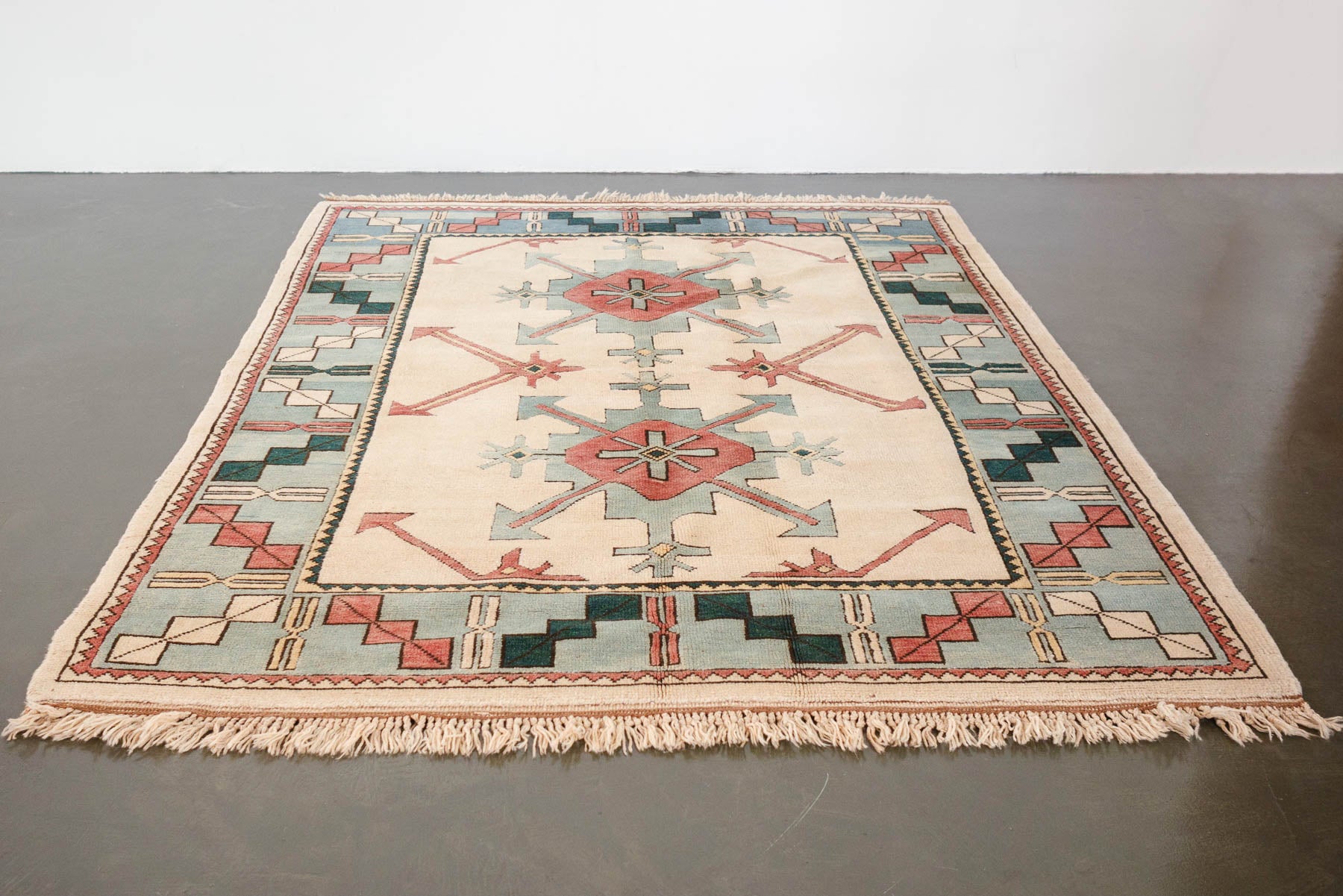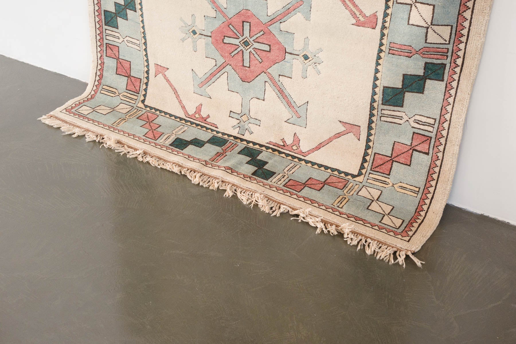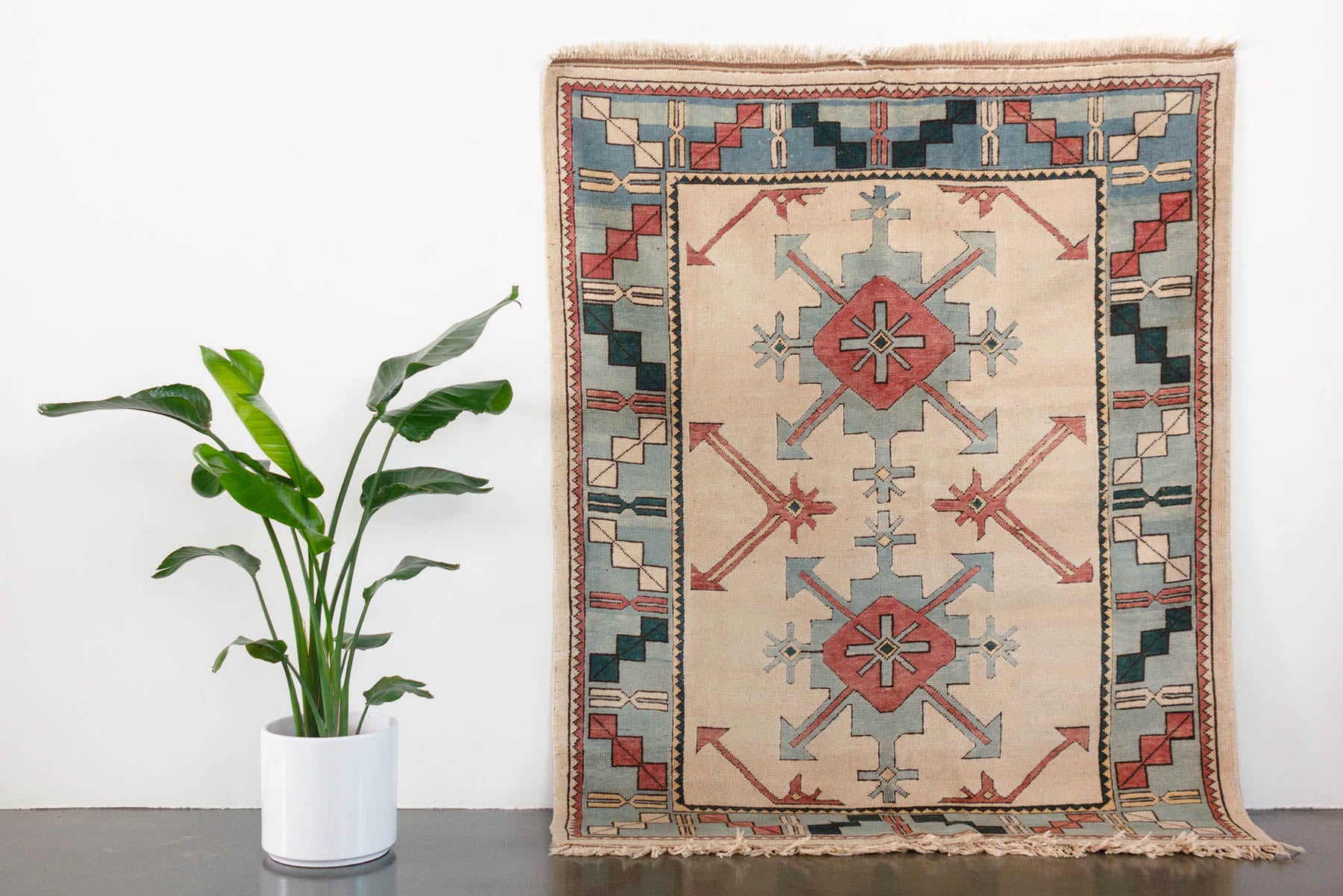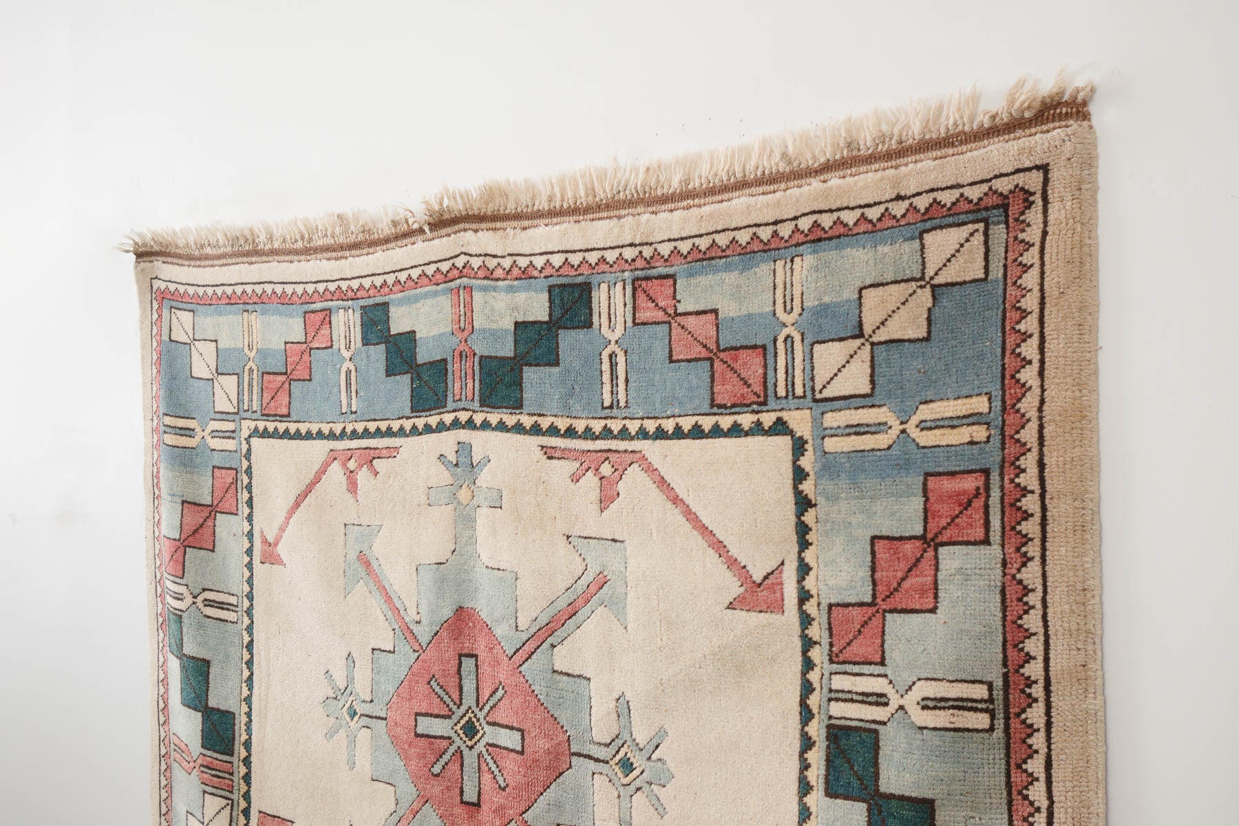 name: Tethemorigin: Turkish, Melisstyle: rug, carpetmaterial: hand knotted woolcolors: cream, blues, coral, greens, brownsage: vintage condition: good, age related wear - see pictures69" x 91" (closest standard rug size is 6x7.5)Free domestic shipping on all rugs.Contact us for an international shipping quote.