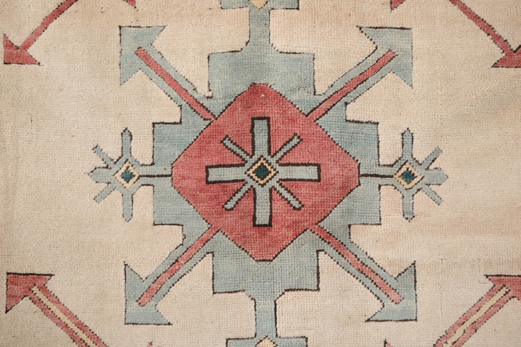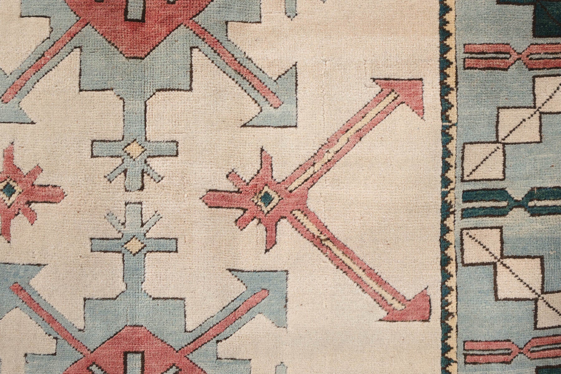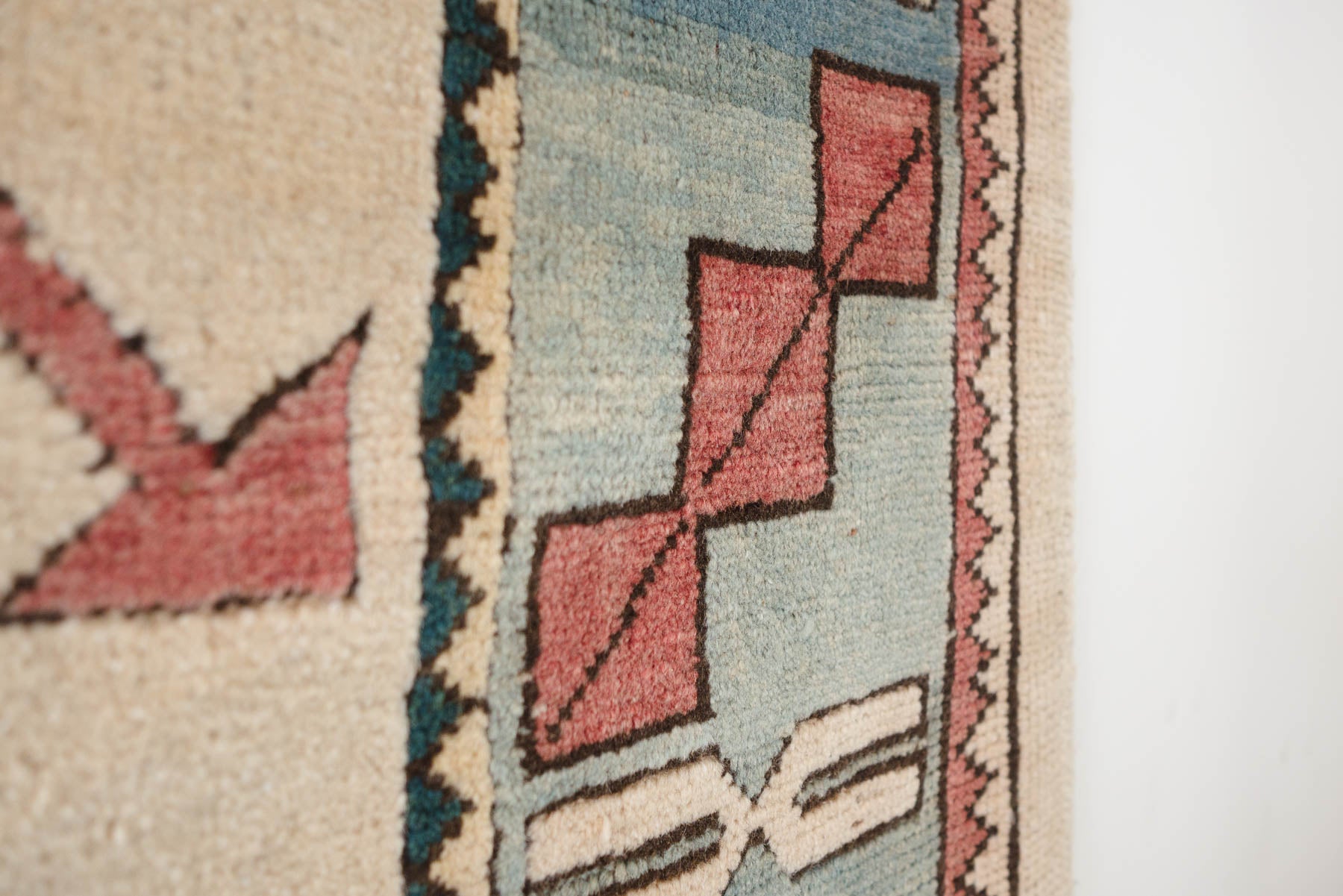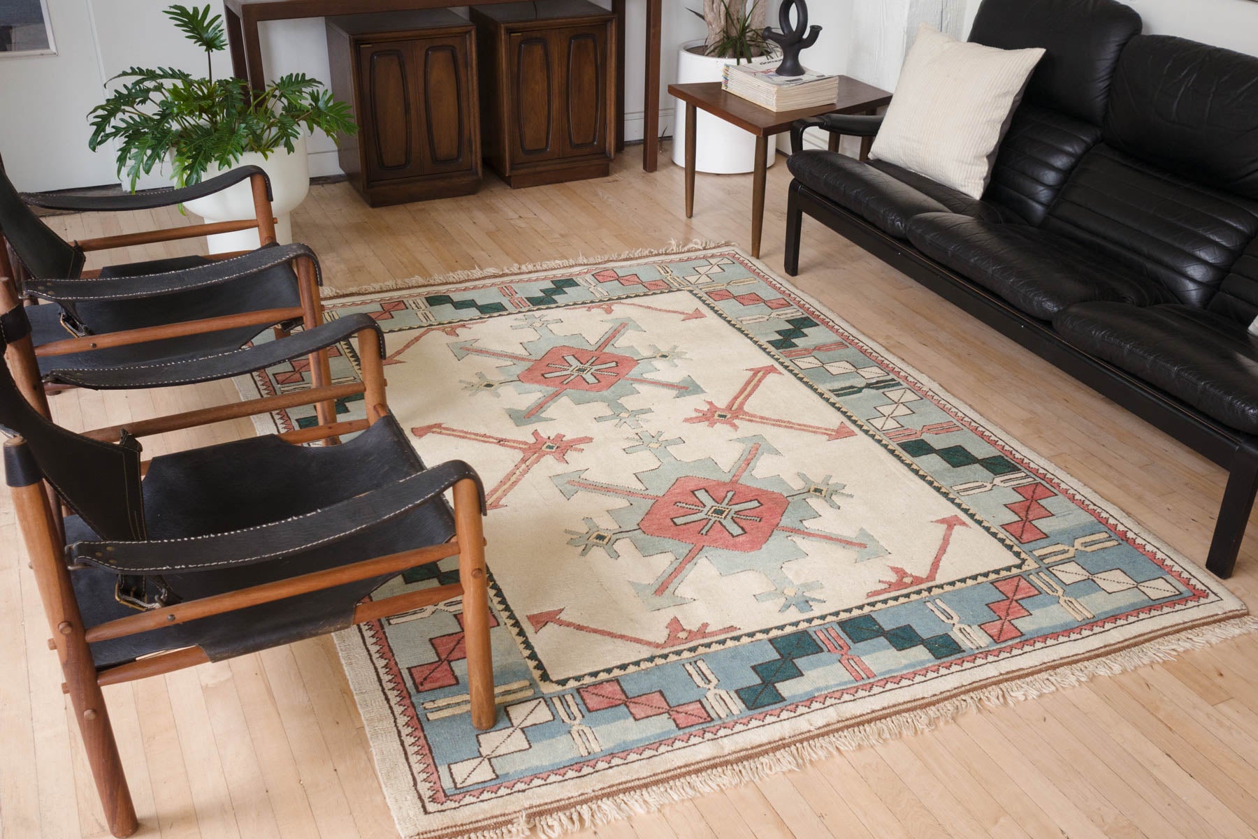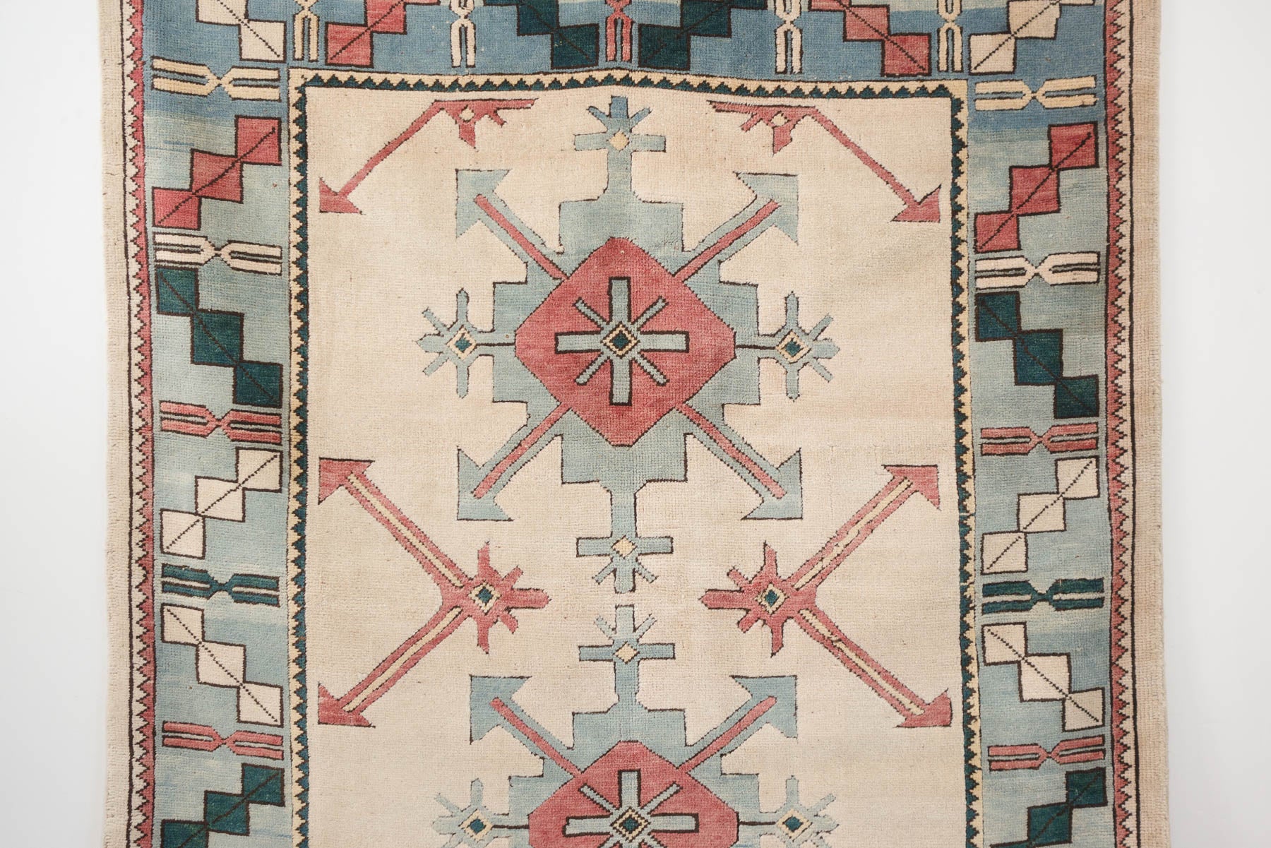 name: Tethemorigin: Turkish, Melisstyle: rug, carpetmaterial: hand knotted woolcolors: cream, blues, coral, greens, brownsage: vintage condition: good, age related wear - see pictures69" x 91" (closest standard rug size is 6x7.5)Free domestic shipping on all rugs.Contact us for an international shipping quote.