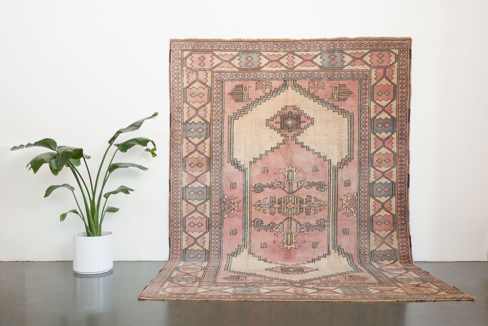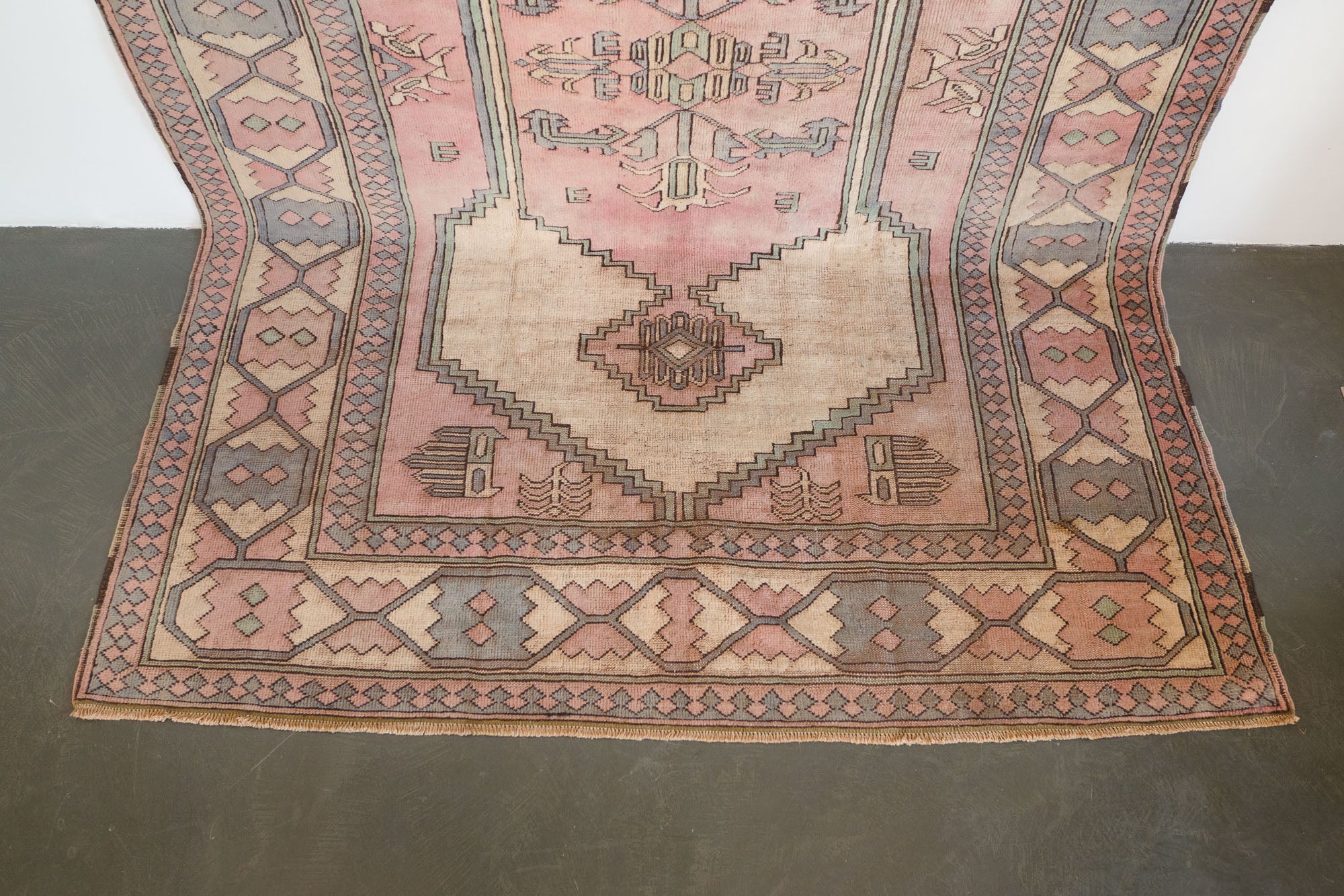 name: Yabanorigin: Turkeystyle: Melis, medallion, rug, carpet material: hand knotted woolcolor: pink, gray, cream, browns, black, greenage: vintage (1940-1969)condition: good, age related wear (discoloration) - see picturesappraised value: $3,264