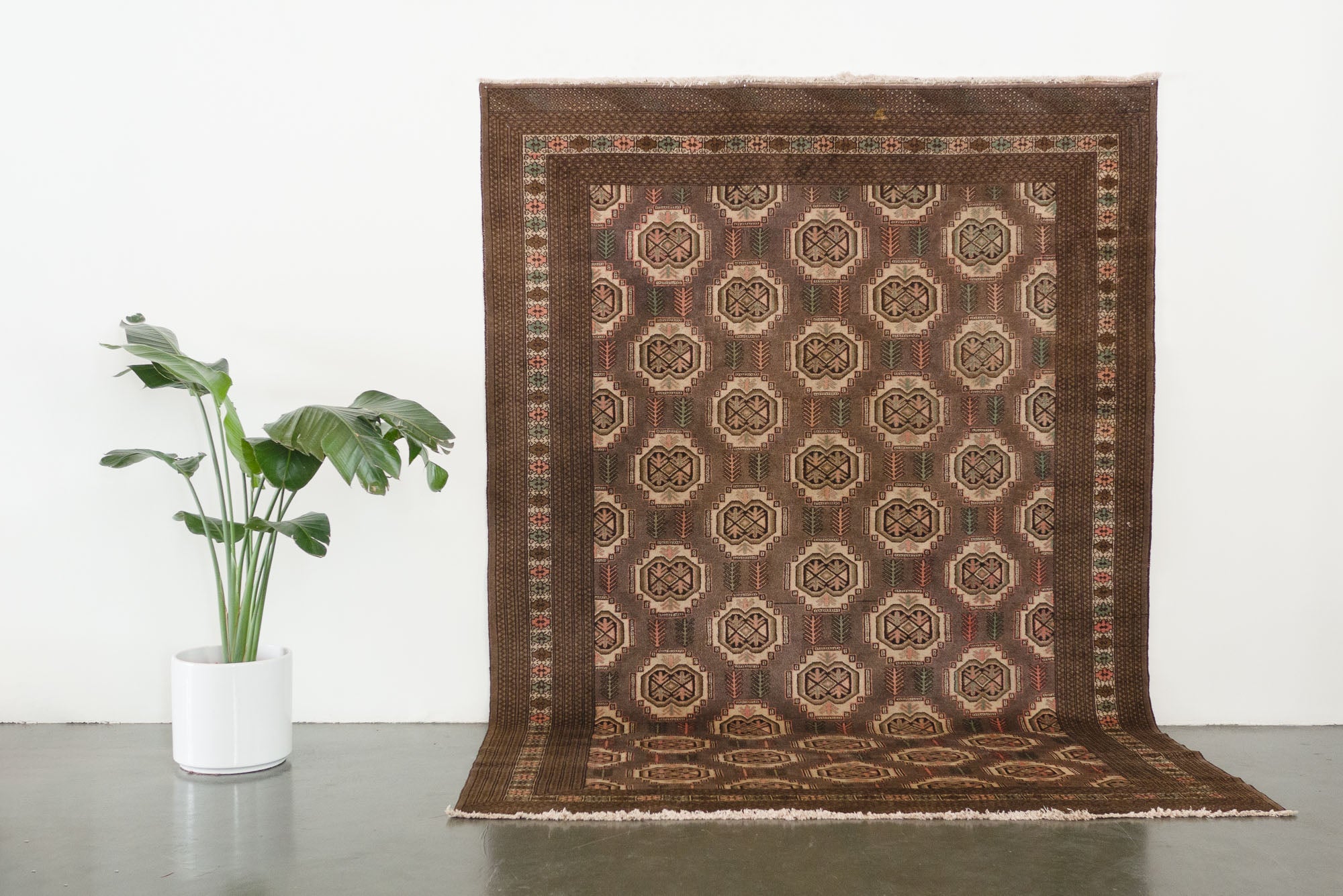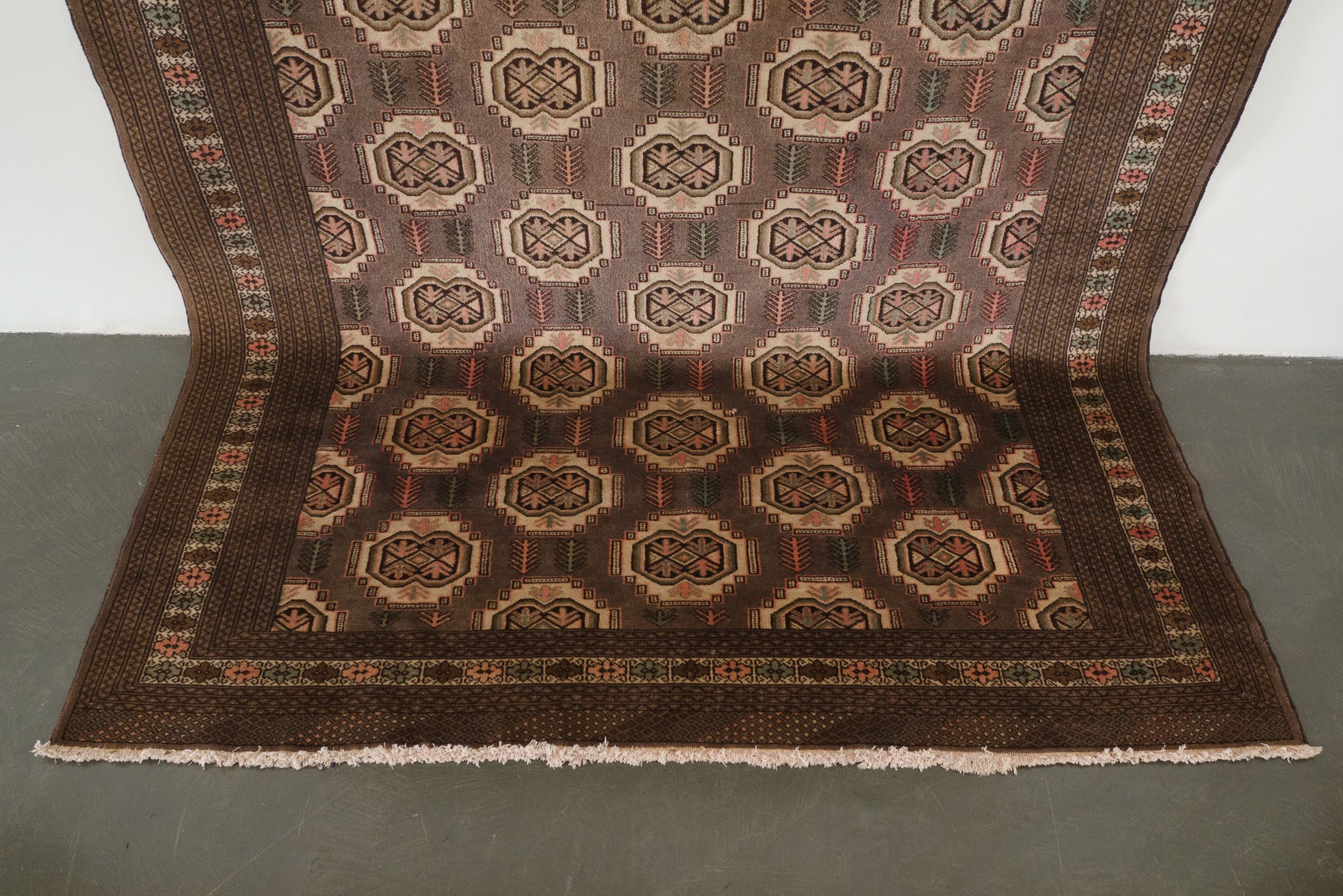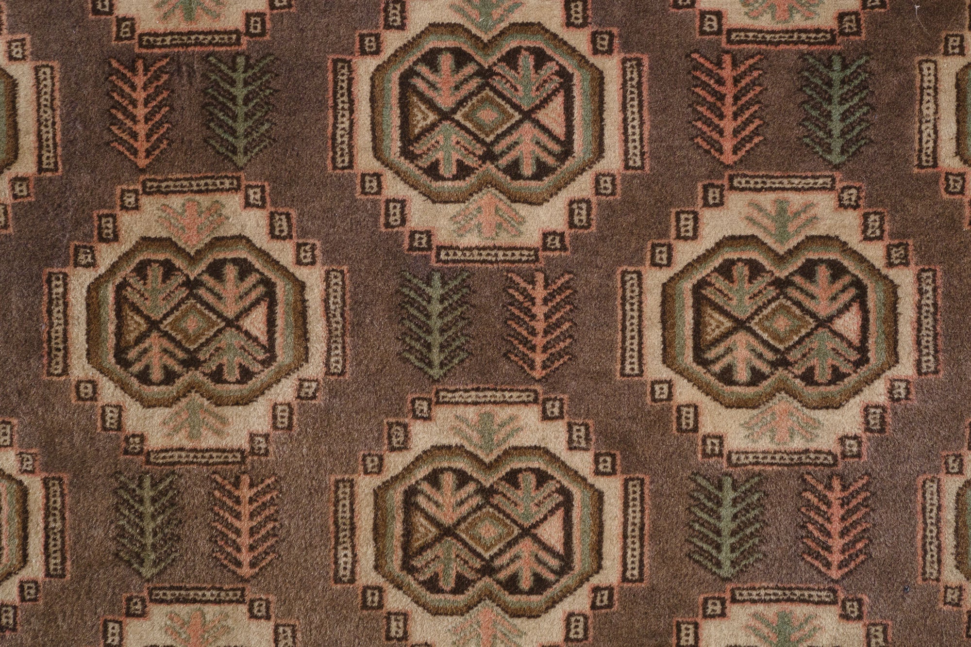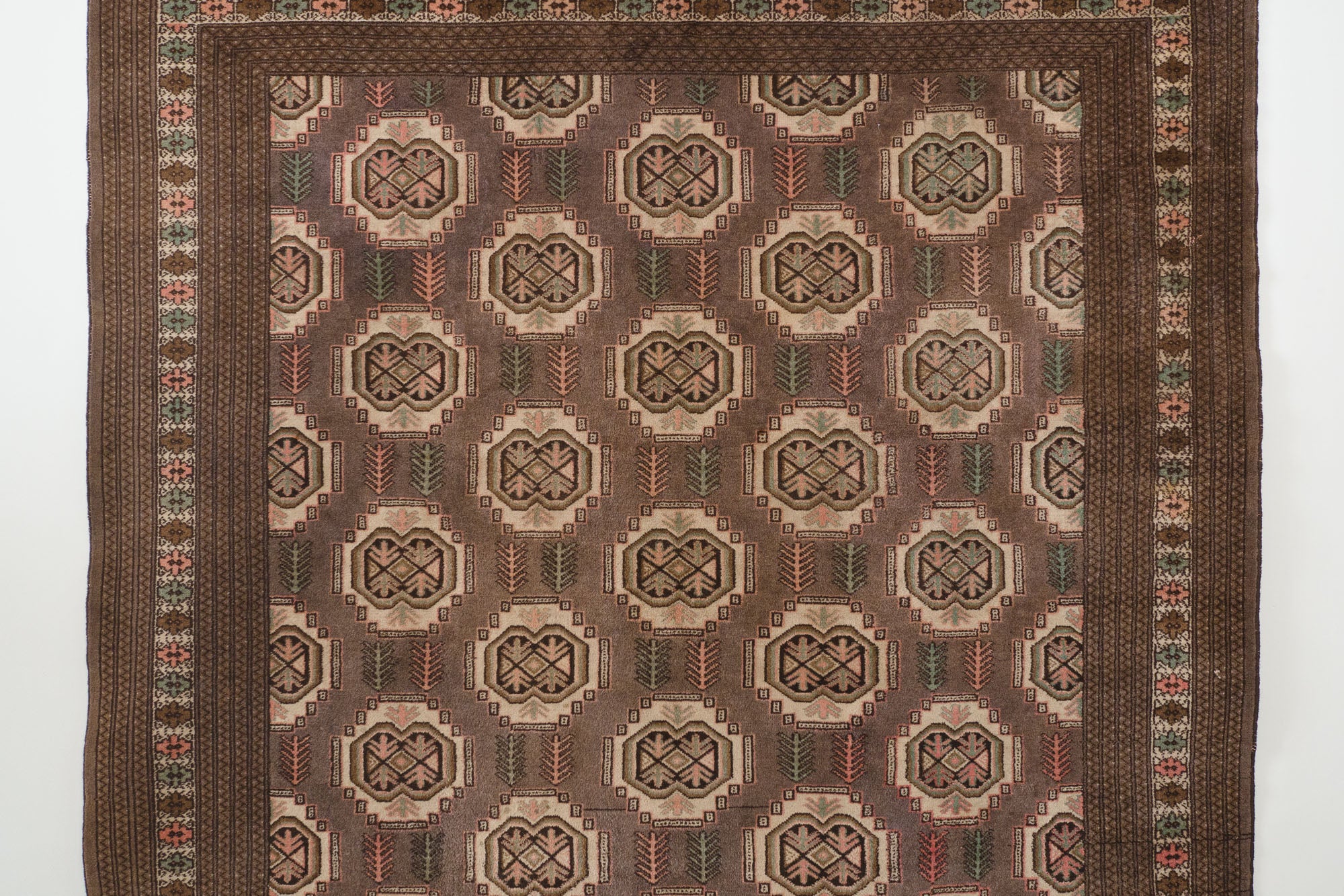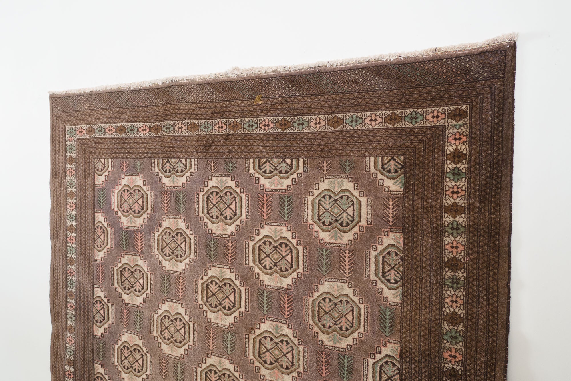name: Kiranorigin: Pakistanstyle: peshawar bokhara, rug, carpetmaterial: hand knotted woolcolors: brown, pink, green, cream, blackage: vintage, 1940-1970condition: good, age related wear (repair) - see picturessku: pk-225